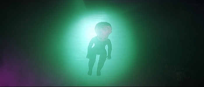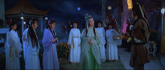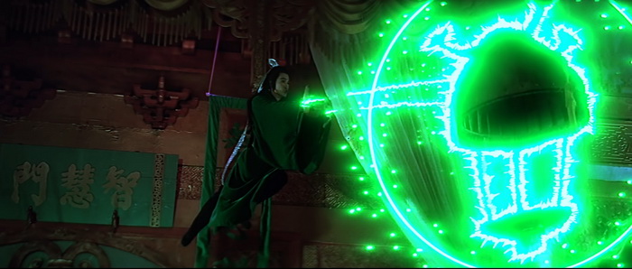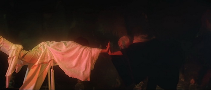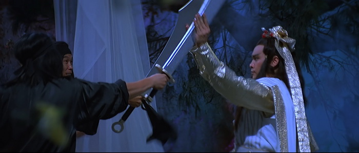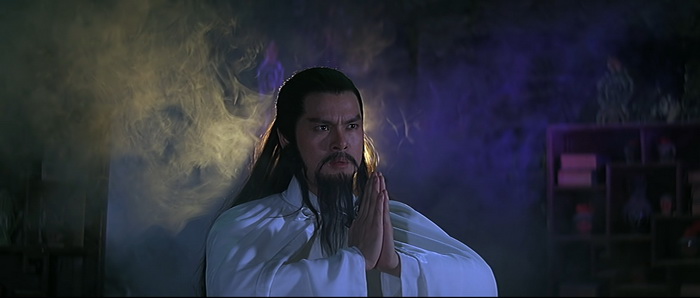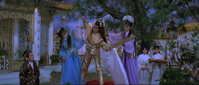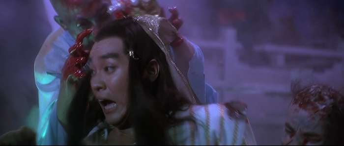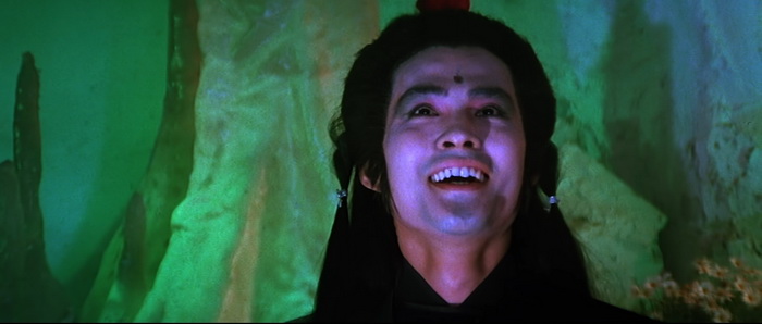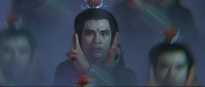 Si on est d’accord pour dire qu’il y a un petit ventre mou en milieu de film, avec une romance et de la comédie qui prennent un peu de place, tout le reste du film va à 200 à l’heure. Le rythme est effréné, voire frénétique, et Descendant of the Sun est rempli de scènes d’action complètement folles, remplis d’effets spéciaux en tout genre, d’effets visuels barrés, de combats ultra-câblés, d’explosions dans tous les sens, de personnages qui volent, et d’idées complètement WTF. Le point d’orgue de tout ce beau bordel qui de déroule sous nos yeux, cette partie de Pierre / Feuille / Ciseau ou notre héros se transforme en ciseau géant pour couper en deux le méchant qui s’est transformé en drap. Oui oui. Ajoutez à cela des fantômes, des zombies, et plein d’autres trucs maléfiques qui ajoutent du nawak au nawak. Difficile de dire à quoi on carburait dans les locaux de la Shaw Brothers de cette époque, mais c’était de la bonne ! Et dans tout ce beau bordel, tout un tas d’acteurs, et en particulier Derek Yee, qui semble s’amuser comme des petits fous, avec parfois des grands sourires aux lèvres comme si on était dans une cour de récréation et qu’une tripotée d’enfants s’amusaient à reproduire des choses improbables qu’ils avaient imaginées. Alors, oui, comme dit plus haut, Chu Yuan ne semble pas très à l’aise derrière sa caméra, filmant ces délires avec ses techniques habituelles, de longs plans, si possibles larges là où un montage frénétique aurait été bien plus raccord avec ce qu’il se passe à l’écran, comme s’il ne savait pas vraiment quoi faire avec le côté virevoltant des affrontements et qu’il se disait « Putain, je suis trop vieux pour ces conneries ». C’est trop statique, c’est trop classique, là où il aurait fallu à l’inverse tenter des choses, oser des plans improbables, oser des effets de style, expérimenter. Mais étonnement, ce décalage participe au kitch de l’ensemble et au final, si on aime ce genre de bizarreries, on se rend compte qu’on a passé un très bon moment pendant 1h24, certes pas devant quelque chose de toujours très bon, mais de toujours très généreux et délirant.