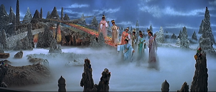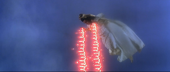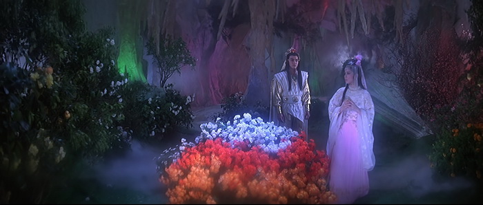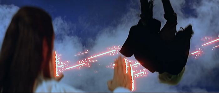 Même si Chu Yuan avait déjà mis un pied dans ce genre de délire, très légèrement avec par exemple The Web of Death, ou bien plus frontalement avec donc The Hidden Power of Dragon Sabre, on est ici dans quelque chose d’encore différent puisque Descendant of the Sun est un remake à peine déguisé du Superman de Richard Donner. Bon, le terme « remake » est peut-être un peu fort, quoi que, mais il semblerait que le film de Donner soit la grosse source d’inspiration qu’on aurait passé au mixeur avec certaines légendes chinoises comme Journey of the West. Descendant of the Sun part dans tellement de délires qu’on se demande même parfois si on n’est pas carrément dans une parodie de Superman. Bien qu’il y ait de nombreuses différences, toute la structure de Superman et de sa suite Superman II sont là. Les deux films ont été condensés, très fortement raccourcis, mais tous les éléments sont bien là, plus ou moins détournés, mais surtout plus ou moins kitchs. Notre héros ne vient pas de Krypton mais du ciel ; il n’est pas journaliste avec Loïs Lane mais est jardinier dans un palais et tombe amoureux de la princesse ; notre héros a lui aussi sa forteresse de la solitude … et on pourrait continuer la liste longtemps comme ça. On a même parfois l’impression que le thème de Superman est utilisé (en version très remixée). La grosse différence, c’est que notre héros ici ne semble avoir aucun point faible et qu’il est capable de tout faire. Il sait voler, il a une force surhumaine, il sait faire de la télékinésie, il maitrise le feu, il peut provoquer des explosions, il casse des épées à mains nues, il peut se transformer en ce qu’il veut, … Bref, il peut tout faire. Visuellement, on est à la fois dans quelque chose de de très réussi et de souvent ratés, mais toujours très intéressant. C’est très coloré, les décors de studios sont travaillés, il règne une atmosphère presque féérique, c’est bourré d’effets spéciaux en tous genres. D’un autre côté, le nombre de décors est au final très limité, Chu Yuan abuse encore plus de fumigènes, certains accessoires sont complètement ratés, et on est dans un kitch de tous les instants. Et pourtant, si on prend le film dans son ensemble, l’esthétique visuelle très kitch possède ce charme de l’époque qui certes peut diviser, mais qui ne laisse quoi qu’il en soit jamais indifférent.