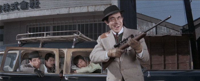 La touche Suzuki qui transpirera littéralement dans les prochaines années jusqu’à l’apogée de La Marque du Tueur est ici à ses débuts. Mais des débuts de virtuoses. Suzuki impose des couleurs chaudes, des cadrages prouvant sa maitrise de l’espace, faisant du film une œuvre formelle se démarquant largement des autres productions classiques de l’époque. La trame du film bien que classique et linéaire se laisse agréablement suivre grâce aux talents de Suzuki mais aussi grâce à la présence de son acteur fétiche, le formidable et charismatique Joe Shishido, véritable incarnation du personnage fort, dandy, séducteur, imbattable en somme de Tajima (ce qui fait penser au James Bond des débuts), personnage qui reviendra en plus violent, plus exacerbé dans la Jeunesse de la Bete.