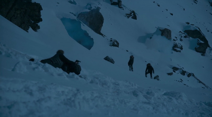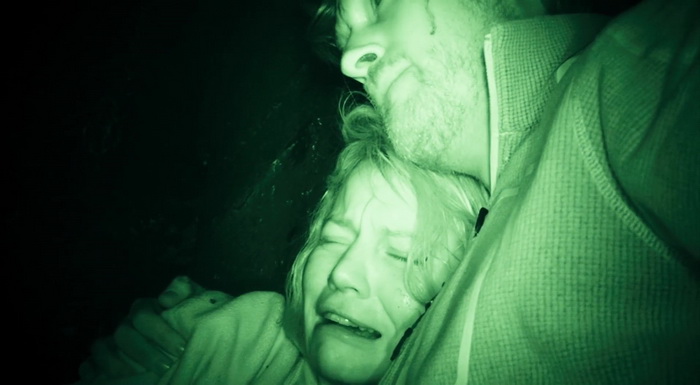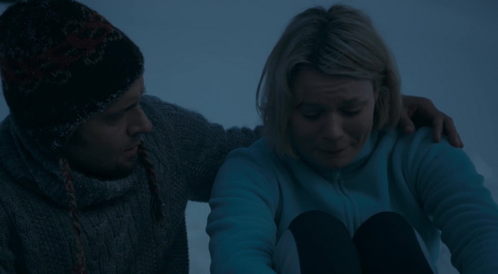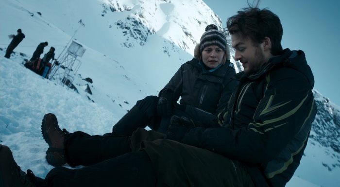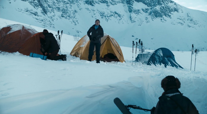 Rien de transcendant, malgré quelques idées de montage intéressantes. Puis, une fois en Russie et après quelques rapides aventures dans une ville, dans un bar, voilà nos personnages au plus près du bas de la montagne, et les voilà qui partent à l’aventure. Avec quelques événements étranges car sinon on ne verrait que 5 personnages gravir une montagne. Et ça marche plutôt bien. Les décors de la Russie (le film a donc vraiment été tourné en Russie) sont sublimes, les panoramiques de la montage de jour en mettent plein la vue, de nuit c’est tout aussi intéressant (notamment avec de jolies couleurs dans le ciel). Les événements étranges autour des personnages sont discrets et là pour installer une ambiance (des traces de pas, des sons étranges, une langue tranchée retrouvée), mais ne sont pas trop lourds ou trop nombreux pour parasiter le film. Car oui, perso, si on multiplie trop les éléments étranges et malsains, à leur place, je fais demi-tour. Mais ça se tient, durant 45 minutes, c’est calme mais sympathique. Puis nos personnages arrivent sur le fameux lieu de l’incident, et on sent que quelque chose se prépare. À tous les niveaux, puis que le film reproduit certaines théories (les GPS, boussoles et autres qui ne fonctionnent plus, des traces de radioactivité), continue de filmer l’ensemble proprement, mais pour ne pas terminer l’aventure trop vite, rend certains personnages cons. Un élément est découvert non loin du campement, mais deux personnages gardent la découverte pour eux (ben oui, sinon le film sera terminé 10 minutes après). M’enfin, tout tient encore la route, et on aura même une scène d’avalanche un brin surréaliste mais plutôt bien foutue encore.