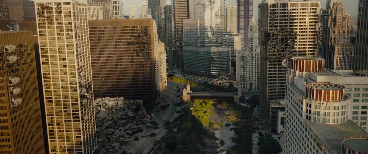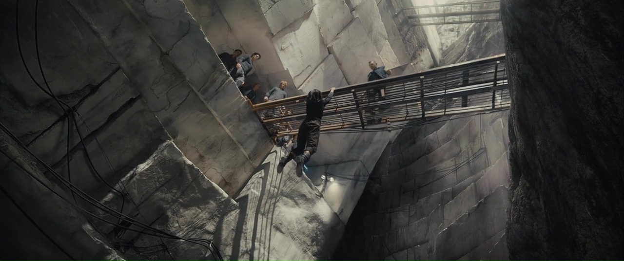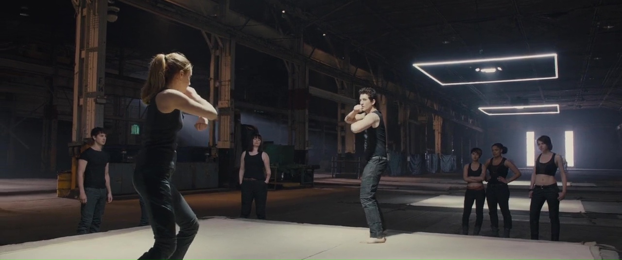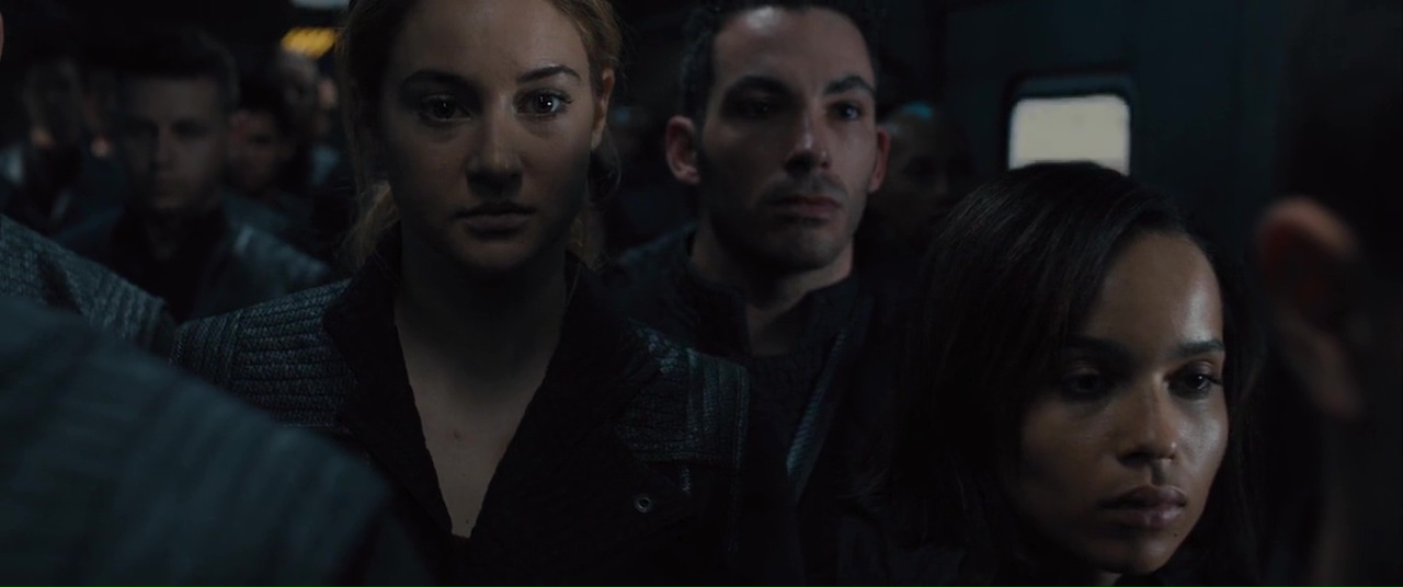 En gros, oui, le film dure 2h19 (c’est énorme), et sur toute cette durée… 1h50 seront dédiées à l’entraînement de Tris, à ses amis, à ses choix, ses doutes blablabla. Oui, c’est un peu comme si Kingsman (premier exemple me passant par la tête) étendait l’entraînement de son personnage sur toute sa durée, avant de nous balancer juste comme ça une scène finale. Mais bon, revenons au début. Tris est donc attirée par l’aventure, le danger, quitte ses parents pour rejoindre une autre faction, s’entraîner. Et directement, ce qui ne fonctionne pas chez moi, c’est la tendance de ce genre de films à viser quasi uniquement le public adolescent. Oui, forcément, il faut que les personnages accros au danger soient des jeunes habillés en noir, avec tablettes de chocolat quand on retire le t-shirt, et ressemblant à des boys band. Direction artistique, tu fais mal au cul franchement là merde ! Visuellement, l’ensemble a plutôt de la gueule dés la scène d’ouverture par contre, avec de beaux plans sur des villes dévastées, une jolie photographie, mais vu le budget, c’est le minimum syndical dirons nous. Mais rapidement, plus Tris va évoluer dans son entrainement, plus on se heurte à un nouveau soucis des films pour ado : la bande son ! Pourtant, l’ost est composée par Junkie XL, rien que ça, et supervisée par Hans Zimmer lui-même svp, sauf que, ben comme dans chaque film visant ce public, à chaque moment important, hop on nous sort un petit tube du moment visant ce public, et ça, oui, ça me gave !