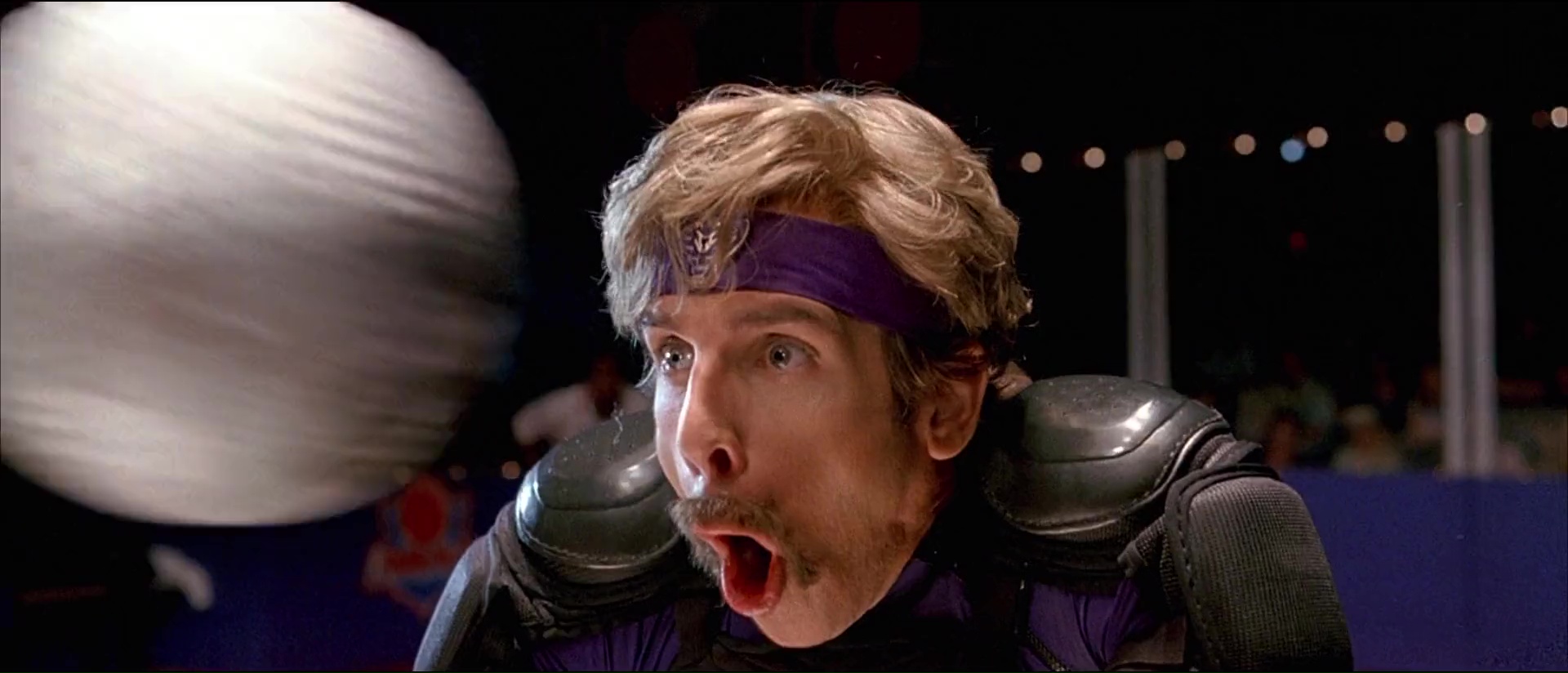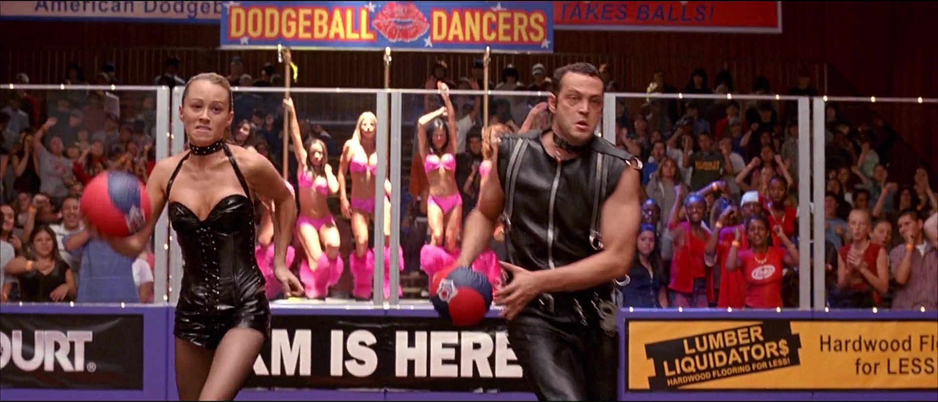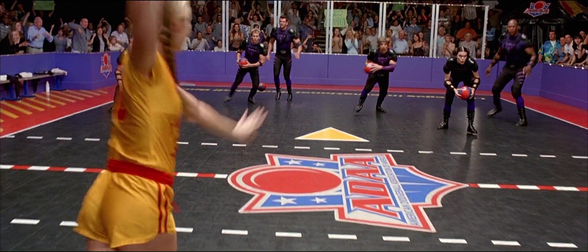Bref, le seul moyen pour Peter et se bande d’espérer garder le club et d’avoir 50 000 dollars entre les mains en un mois, ce sera de participer à un tournoi de dodgeball, de balle au prisonnier donc. Et les voilà embarqué dans l’aventure, avec ce que cela comporte d’entrainements, de coups bas, de blagues salaces, de blagues visuelles, de blagues qui font mal, et de matchs qui font mal aussi avec des balles lancées à pleine vitesse là où ça fait mal (dans les boules, dans la tête, où vous voulez). Dodgeball, ce n’est pas de la comédie subtile, mais c’est de la comédie qui fait du bien, sans temps morts, qui va à 100 à l’heure, qui ne recule devant aucune idée à la con. On le voit dés l’ouverture qui nous présente nos deux personnages principaux. Ben Stiller joue un accro au sport, qui ne juge que par les apparences, se prend pour le beau gosse ultime auquel personne ne peut résister, et cela se voit dans ses paroles et dans ses actes, le tout avec un second degré constant. Le voir comparer la mocheté à une erreur générique ou une faiblesse comme pourrait l’être la… nécrophilie, voilà qui vous donne une bonne idée du personnage, qui s’électrocute les tétons lorsqu’il est tenté par un donut, ou utilise une pizza pour se mastu… vous voyez ! De l’autre côté, Peter paraît finalement être un personnage tout à fait banal, sans rêve, qui vit sa petite vie tranquillement, seul, avec son chien, son petit quotidien banal et sans histoire. Quelqu’un comme vous et moi, qui balance toutes ces factures et papiers administratifs dans une armoire sans rien classer et basta (oui, ça, c’est moi. Le jour où on me demandera un papier en particulier, je vais passer 30 ans à le trouver). La première force de Dodgeball, ce sera ses personnages, principaux mais aussi secondaires. Entre la bande de Pete (dont un Justin Long coupe en bol), l’équipe de Globo Gym totalement délirante avec ses noms débiles, ça va jusqu’à l’entraineur de l’équipe de Pete, qui entraine l’équipe en les faisant traverser des routes bien pratiquées, ou éviter des clés à molettes (évitez les clés à molettes et vous éviterez le ballon).