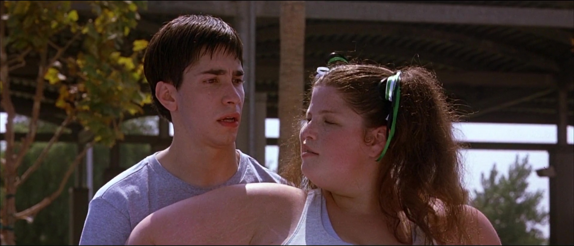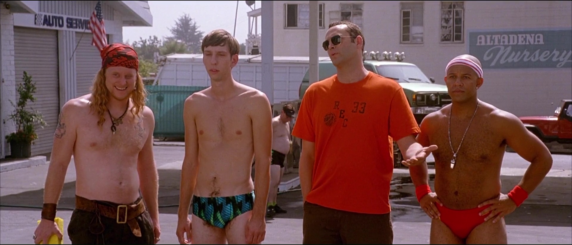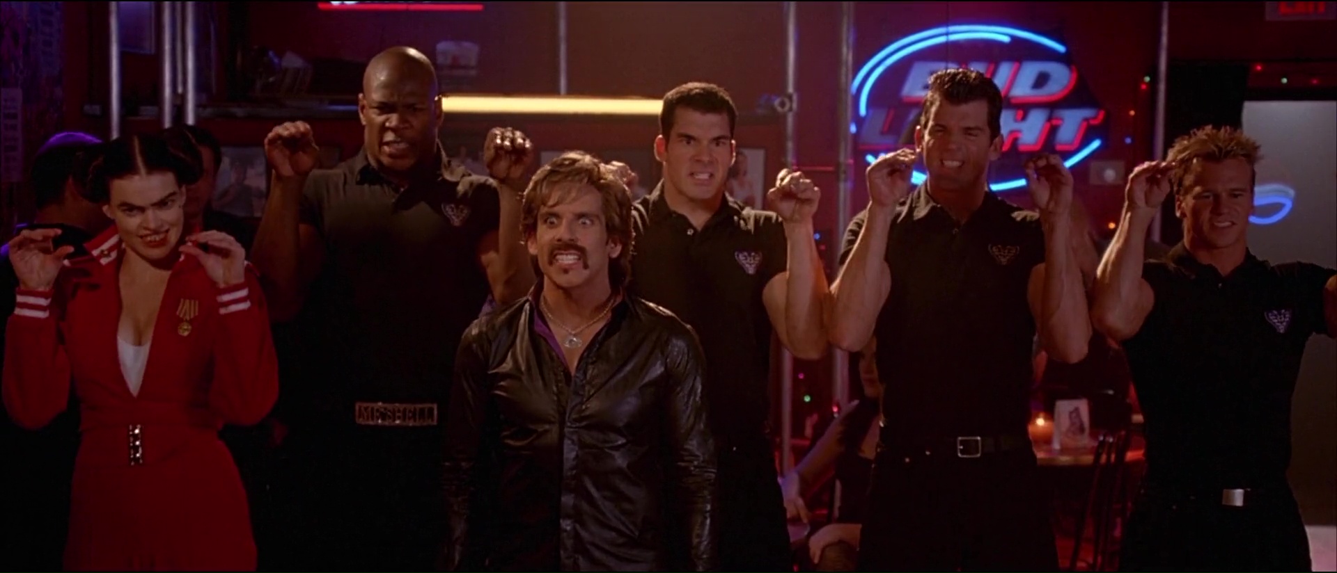Bref, le seul moyen pour Peter et se bande d’espérer garder le club et d’avoir 50 000 dollars entre les mains en un mois, ce sera de participer à un tournoi de dodgeball, de balle au prisonnier donc. Et les voilà embarqué dans l’aventure, avec ce que cela comporte d’entrainements, de coups bas, de blagues salaces, de blagues visuelles, de blagues qui font mal, et de matchs qui font mal aussi avec des balles lancées à pleine vitesse là où ça fait mal (dans les boules, dans la tête, où vous voulez). Dodgeball, ce n’est pas de la comédie subtile, mais c’est de la comédie qui fait du bien, sans temps morts, qui va à 100 à l’heure, qui ne recule devant aucune idée à la con. On le voit dés l’ouverture qui nous présente nos deux personnages principaux. Ben Stiller joue un accro au sport, qui ne juge que par les apparences, se prend pour le beau gosse ultime auquel personne ne peut résister, et cela se voit dans ses paroles et dans ses actes, le tout avec un second degré constant. Le voir comparer la mocheté à une erreur générique ou une faiblesse comme pourrait l’être la… nécrophilie, voilà qui vous donne une bonne idée du personnage, qui s’électrocute les tétons lorsqu’il est tenté par un donut, ou utilise une pizza pour se mastu… vous voyez ! De l’autre côté, Peter paraît finalement être un personnage tout à fait banal, sans rêve, qui vit sa petite vie tranquillement, seul, avec son chien, son petit quotidien banal et sans histoire. Quelqu’un comme vous et moi, qui balance toutes ces factures et papiers administratifs dans une armoire sans rien classer et basta (oui, ça, c’est moi. Le jour où on me demandera un papier en particulier, je vais passer 30 ans à le trouver). La première force de Dodgeball, ce sera ses personnages, principaux mais aussi secondaires. Entre la bande de Pete (dont un Justin Long coupe en bol), l’équipe de Globo Gym totalement délirante avec ses noms débiles, ça va jusqu’à l’entraineur de l’équipe de Pete, qui entraine l’équipe en les faisant traverser des routes bien pratiquées, ou éviter des clés à molettes (évitez les clés à molettes et vous éviterez le ballon).