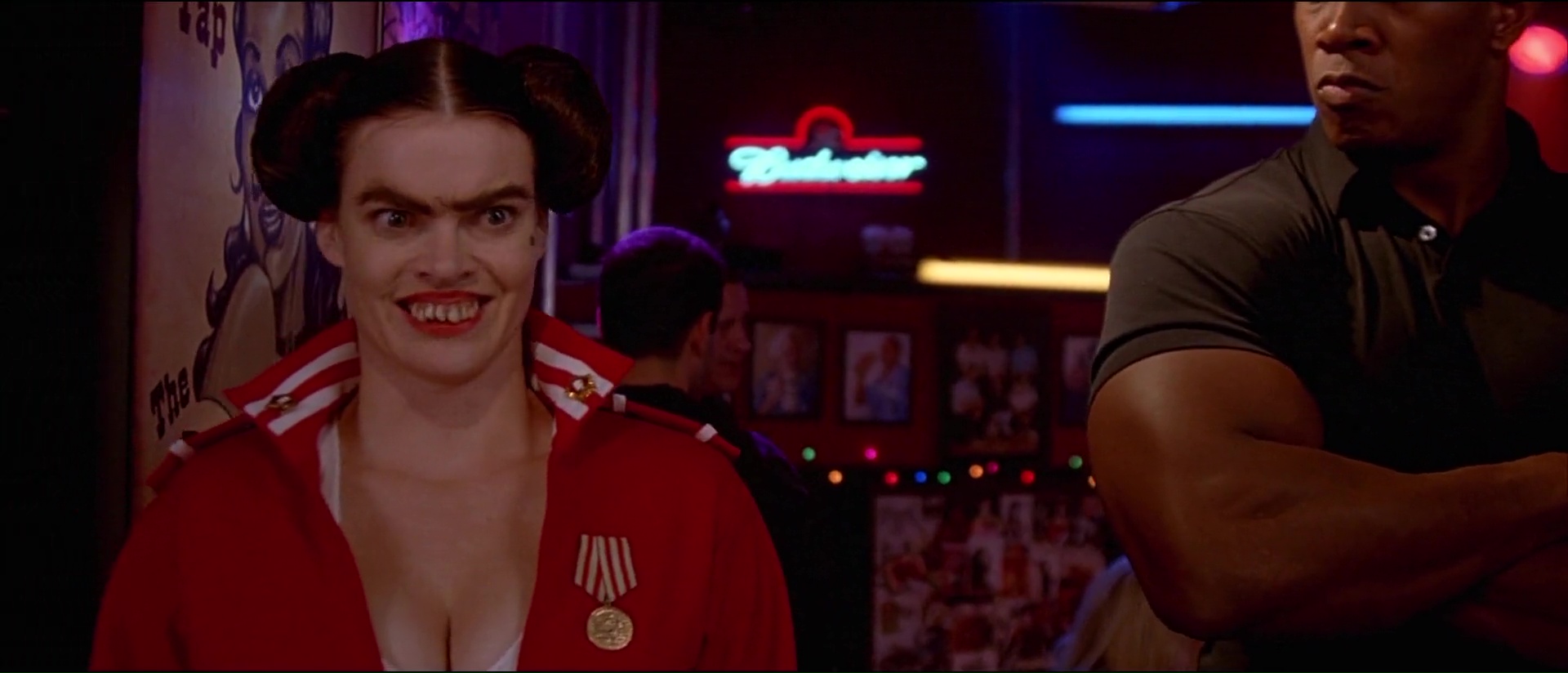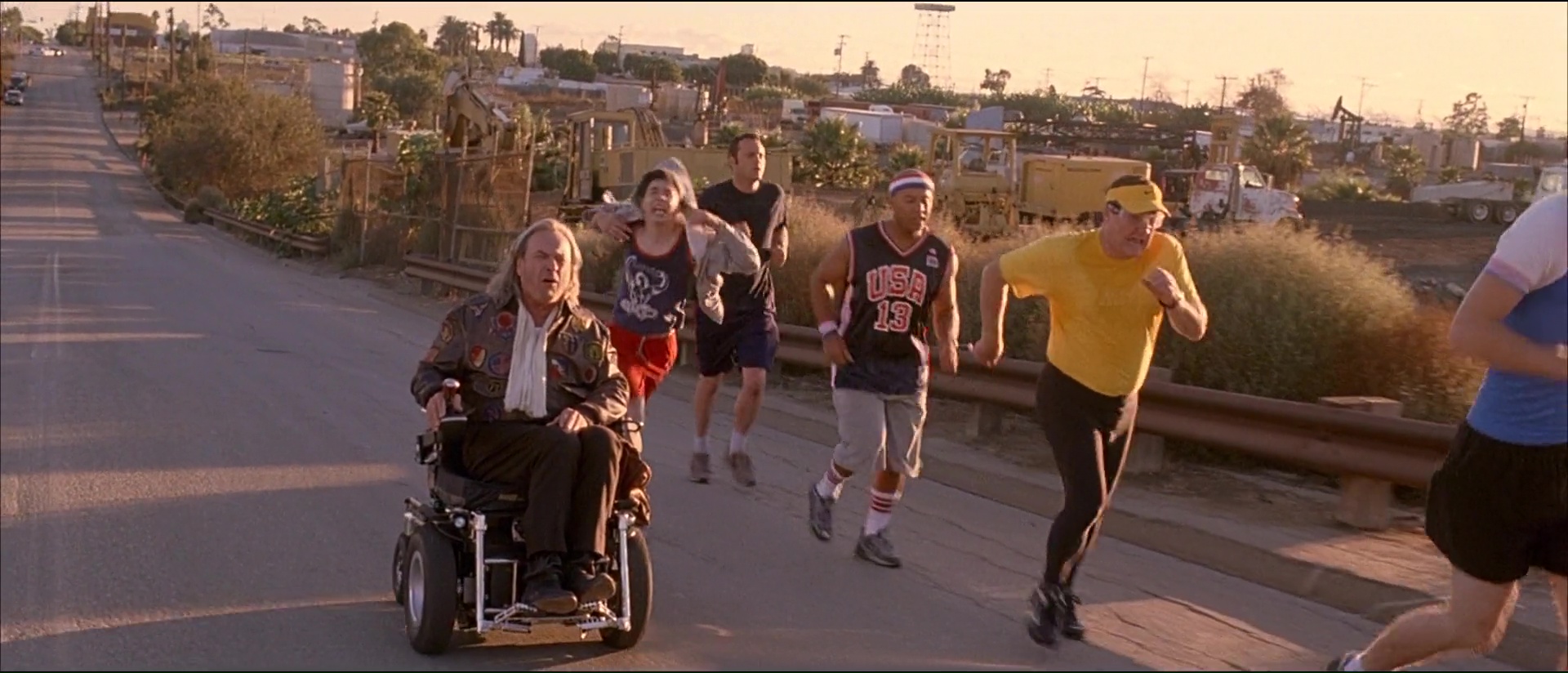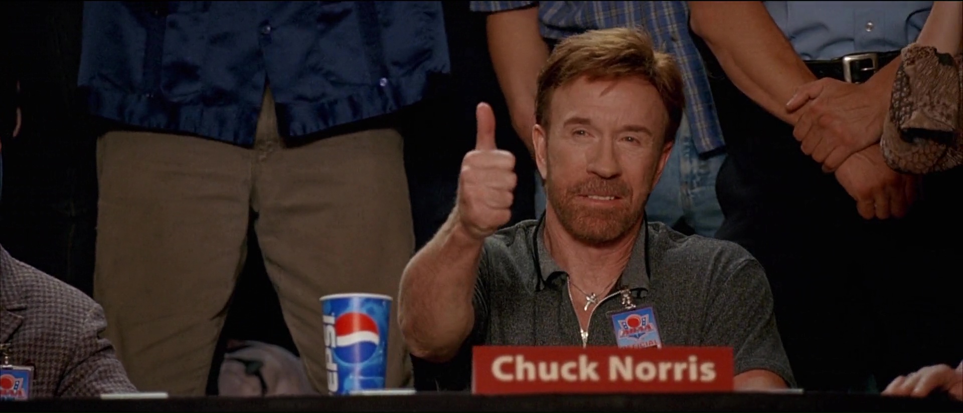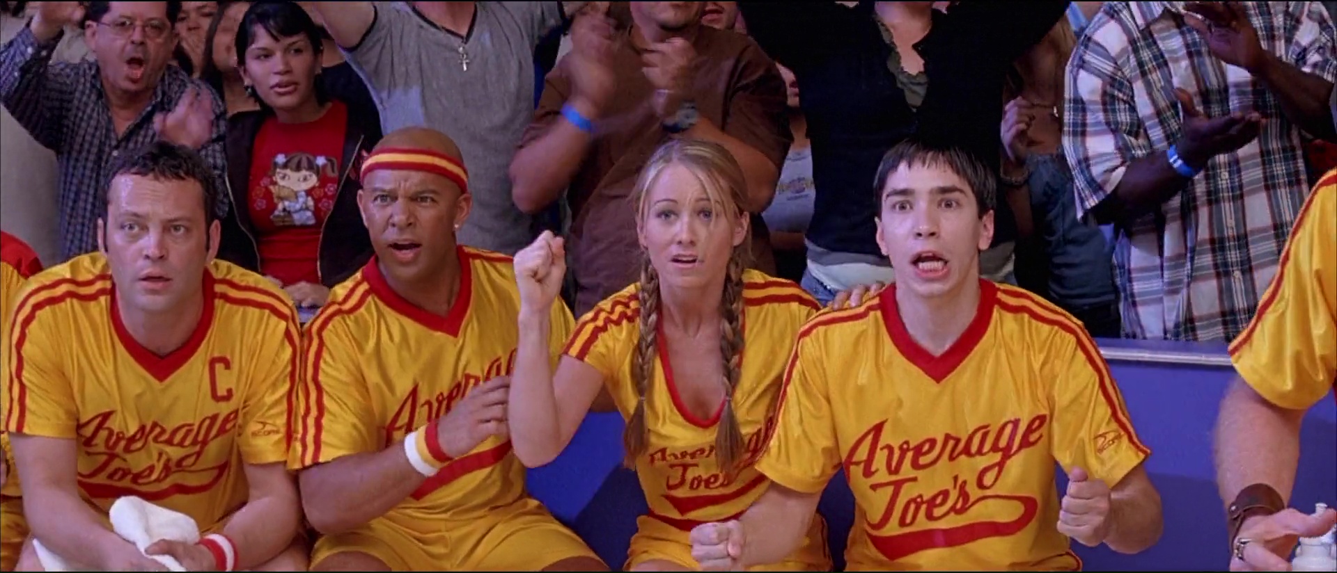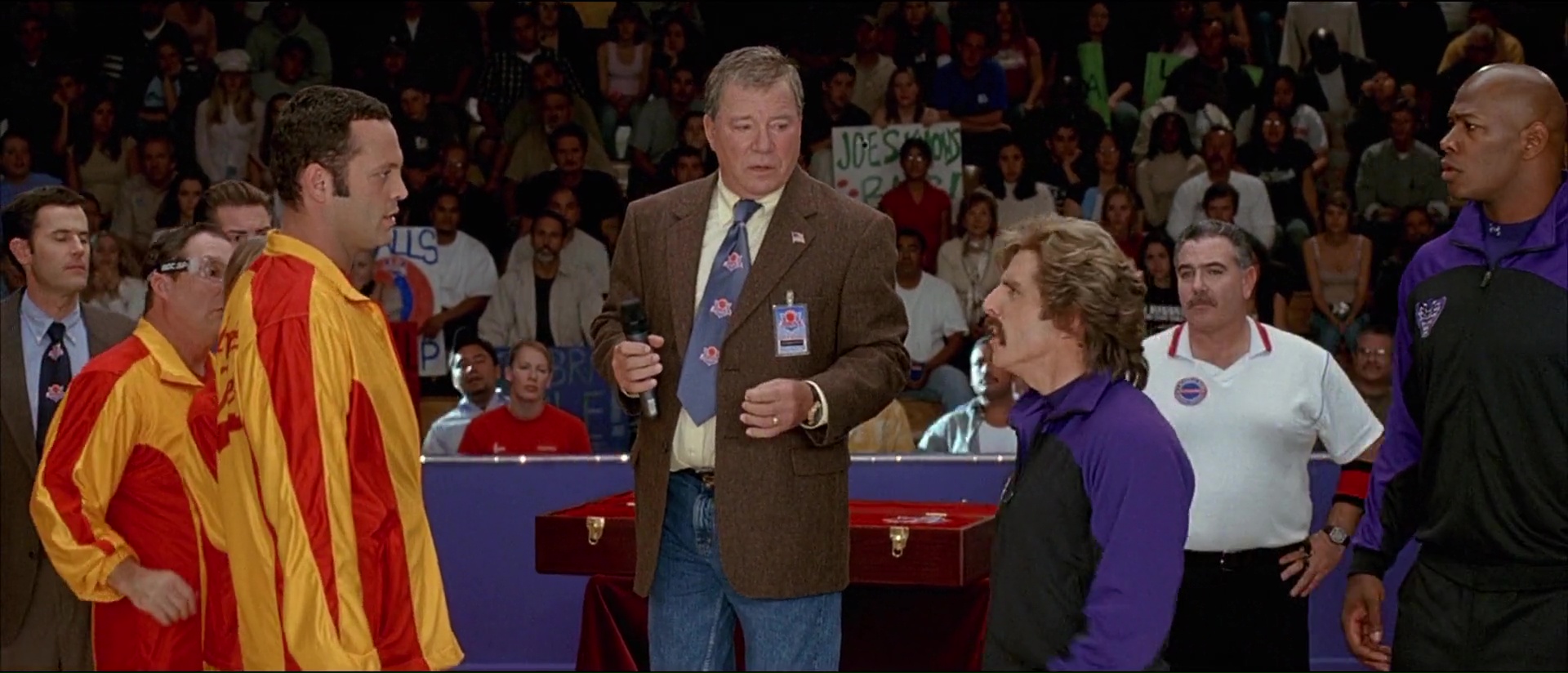Et puis il y a son humour, parfois facile, parfois gras, parfois bon enfant aussi, avec des dialogues plutôt bien trouvés et souvent tordants, et ces gags visuels qui font mal (encore une fois, les clés à molettes). Rajoutez par dessus tout ça une bande son rock qui décoiffe la plupart du temps, et des matchs de Dodgeball finalement assez dynamiques et funs alors qu’il ne s’agît dans le fond que de balle au prisonniers, et vous avez là une comédie qui fait indéniablement passer un bon moment, à condition bien entendu de ne pas être facilement choquable face à la vulgarité de certains moments, ou la facilité d’autres moments. Car on ne va pas mentir, en étant une comédie pure et dure, Dodgeball est du coup également un film facile et prévisible. On se doute bien entendu de l’issue de tout ça, des quelques rebondissements qui vont arriver. Mais qu’importe tant que l’on passe un bon moment non ? C’est le but d’une comédie après tout. Et puis, il y a les caméos, intervenant tous tardivement, mais qui font tous plaisir à voir pour les connaisseurs. En effet, dés que le tournoi commence, le film enchaine les caméos. Lance Armstrong dans son propre rôle, c’est sympa, mais le reste, c’est mieux lorsque l’on voit en entraineur de l’équipe Allemande un David Hasselhoff qui motive son équipe avec une photo de lui-même, un Chuck Norris dans le jury qui a la classe (et qui grâce à un petit gag, clôt le film sans même être dans cette scène), ou encore en chancelier du jeu remettant la coupe, William Shatner, l’éternel capitaine Kirk de Star Trek ! Ce film m’éclate, me met de bonne humeur. Ce n’est pas du grand cinéma, ce n’est as très fin, mais qu’importe, on s’amuse, les acteurs aussi d’ailleurs.