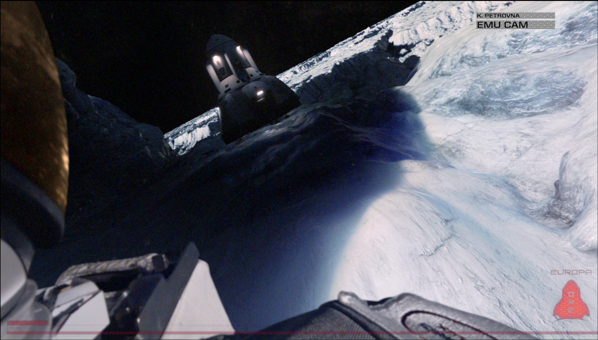 Pas d’effets chocs, de tremblements, de montage ultra cut illogique, Europa Report va à l’essentiel et nous montre un voyage en soit banal mais suffisamment bien fait pour plaire. Notre équipe d’astronautes quitte donc la Terre pour un long voyage sur une des lunes de Jupiter. La moitié du film nous montrera donc le voyage, avec par moment quelques soucis sinon ce ne serait pas drôle, quelques tensions, puis une seconde moitié se déroulant sur la fameuse lune, où les soucis vont continuer à arriver également. Même si les personnages ne sont pas très développés et ne sont au final que des classiques du genre, voir parfois des personnages qui se limitent à leur fonction (le capitaine, la pilote, l’océanologue), l’ensemble passe bien. On aurait bien entendu celui qui veut rentrer chez lui pour retrouver son enfant, la passionnée par la mission prête à prendre tous les risques. À tous les niveaux en réalité, on reste dans le classique, mais plutôt bien mené. Mais ça, c’est uniquement si on regarde la surface de l’œuvre, car en réalité, Europa Report est un poil plus complexe que cela, et se refuse à aller vers la science fiction classique. Des membres d’une équipe isolés lors d’un long voyage, on se dit que cela pourrait très facilement virer au thriller avec meurtres à la pelle. Mais non ! Une planète isolée explorée par une équipe qui ne sais pas du tout à quoi s’attendre, on peut immédiatement penser à une créature Alien qui va venir foutre la merde dans toute cette histoire, sauf que non, encore une fois, non.