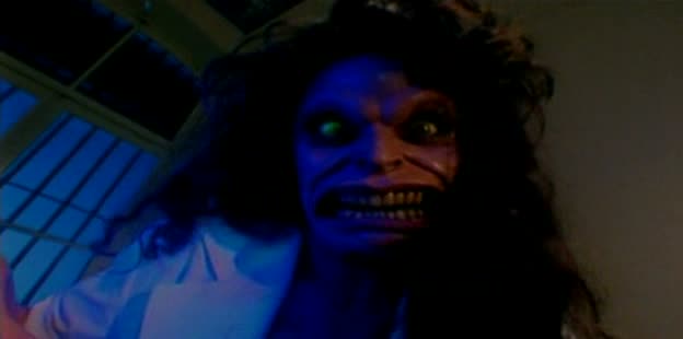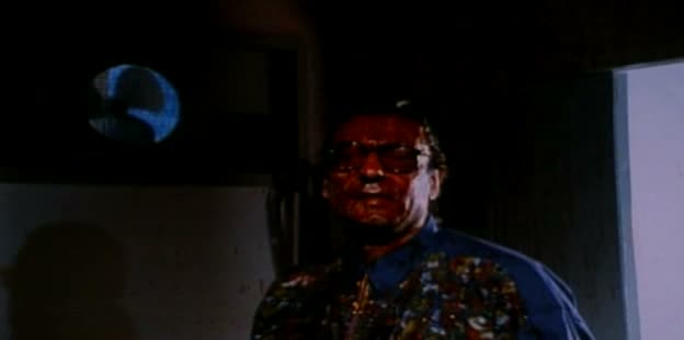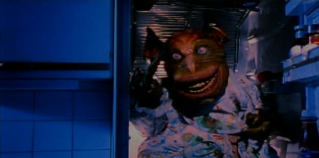 Ce qui frappe en premier dans Evil Ed, ce sera la qualité de ses nombreux effets gore. On sent que le budget n’est pas bien élevé, mais l’équipe s’est grandement appliquée et on trouve des effets parfois plus réussis que dans des petites séries B sérieuses de l’époque. Assez étonnant, surtout que ces effets sont plus que nombreux, les moments gore s’enchaînent sans nous laisser de répit. Bon point. Le ton est toujours comique, puisque les films qu’Ed devra monter seront des séries Z. Ed justement, parlons en. Un personnage timide, réservé, assez mal joué (ben oui, le film est une comédie Z, tout est dans le ton), qui va rapidement perdre sa santé mentale à force de monter ce genre de films, voir des démons, des petits monstres dans le frigo, et va se mettre à buter tout le monde. Les clins d’œil aux films cultes sont légions, tout le temps, partout. Outre des affiches de films un peu partout (La Mouche, Evil Dead 2, Prince des Ténèbres et j’en passe), on aura droit à quelques dialogues cultes bien connus, provenant par exemple de La Nuit des Morts Vivants. Oui, pour le fan du genre, Evil Ed est un peu un condensé, un best of, un hommage bon enfant. On aura même droit donc à un petit monstre dans le frigo nous rappelant ces petites séries B issues du succès de Gremlins (Ghoulies, Critters et tout ça). Le problème d’Evil Ed, c’est qu’au delà de cet hommage constant et de cet amour du genre, il n’y a pas grand-chose à se mettre sous la dent.