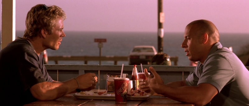 L’idée de fast and furious vient d’un article du magasine Vibe : Racers X. Un récit sur les courses de rues illégales dans les rues de New York, le genre de courses qui ressemble à un concours de bites, à savoir qui aura la caisse la plus customisée et qui fera le meilleurs temps sur une ligne droite de 500m, une philosophie de vie parait-il. C’est sympa, mais pas de quoi faire un film en entier, il faut bien un scénario pour broder autour de cette bribe d’idée. Tiens et pourquoi pas pomper point break, dans lequel un jeune flic infiltre une bande de surfeurs braqueurs de banques, auquel fast and furious fait énormément penser, et à raison avec son jeune flic qui infiltre une bande de coureurs automobile braqueurs de marchandises de poids lourd (je rappelle en passant que la boite de prod s’appelle Original Films). Le jeune flic, c’est Brian (feu Paul Walker) qui infiltre la bande à Dom Toretto (le seul, l’unique, le grand Baboulinet, également connu sous le nom de Vin Diesel), et comme dans point break, Brian va développer une amitié avec Dom, ce qui va sérieusement remettre en question son boulot de flic, d’autant plus qu’il tombe amoureux de la sœur à Baboulinet. La comparaison s’arrête ici, car fast and furious n’a pas la classe, la grâce, et les niveaux de lecture, sérieux ou non, qui font de la bombe de Kathryn Bigelow une œuvre toujours aussi fascinante de nos jours. La faute à un scénario qui ne va pas au bout de ses idées. La relation entre Dom et Brian déjà, censé être le moteur de l’intrigue, n’est jamais vraiment exploitée et ne dégage aucun suspens par rapport à la couverture du flic. Elle devient même secondaire lorsque le script fait intervenir le vrai méchant de l’intrigue commun aux protagonistes. De ce fait, on ne croit pas un seul instant que leur amitié ne tient qu’à un fil, aucune dualité ne s’installe, et franchement que Brian soit flic, agent du fisc, ou pâtissier, on s’en fout un peu, puisque le script ne se donne pas la peine de ménager le moindre suspens.