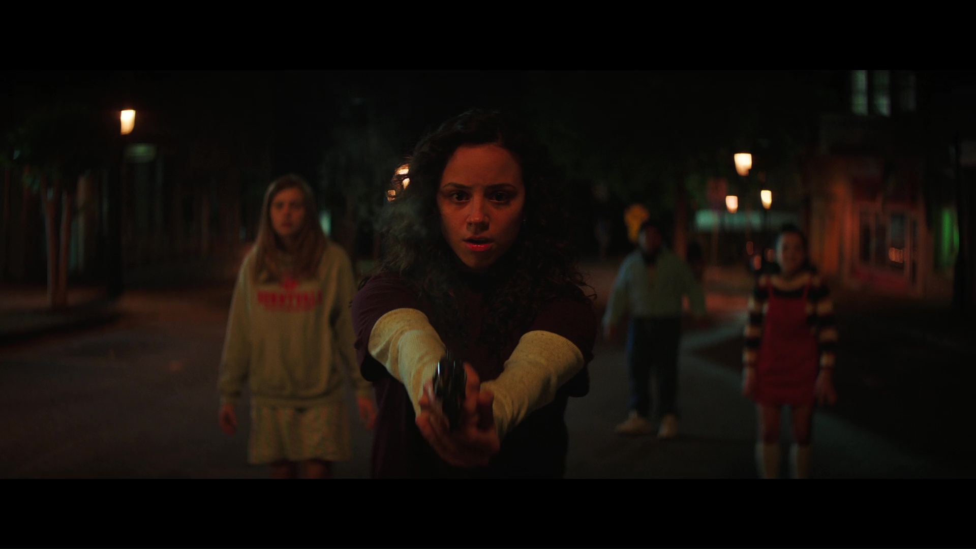 La scène d’ouverture ne ment pas, allant chercher son influence du côté de Scream, et pourquoi pas, Scream étant, peu importe ce que l’on en pense (je ne suis pas fan du tout) une influence majeure du cinéma horrifique des années 90. Et puis bon, dés le début, on nous met du néon, donc je vais être clément… Trêve de plaisanterie, le métrage a le mérite de nous mettre dans le bain en quelques minutes, avec une tuerie dans un centre commercial, avant que le tueur lui-même ne se prenne un headshot, et que l’on puisse enfin passé cette introduction nous présenter notre bande de winners… euh de héros. Qui ne sont pas toujours bien doués. Enfin, c’est un peu le genre du slasher qui veut ça en même temps, car Fear Street, cette première partie du moins, est un slasher. Surnaturel oui, mais slasher tout de même, avec un, enfin en fait plusieurs tueurs masqués qui vont s’en prendre à nos héros, bien stéréotypés comme il faut. Oui, on a le geek qui sait tout sur la situation, le mec qui a de vraies idées de merde (on aura droit à un « toi tu vas surveiller là-bas et moi je vais là-bas »… Le classique Séparons nous quoi), l’héroïne plus forte que tout le monde, et son ancienne petite amie, source de tous les problèmes, qu’il faut sauver à tout prix, quitte à sacrifier l’ensemble du casting secondaire. Oui, aucune surprise, niveau personnages, ça ne vole pas haut. Ce n’est pas vraiment là que l’on attendait le film de toute façon. Niveau scénario, c’est aussi du très classique, avec une malédiction et des tueurs increvables. À voir évidemment comment l’ensemble va évoluer avec les deux suites, mais en l’état, c’est très classique, et relativement prévisible. Surtout que mine de rien, l’ensemble dure 1h47, et c’est finalement sans doute son plus gros souci, c’est trop long.