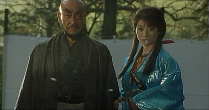 Premier changement par rapport aux opus précédents, le réalisateur Masaru Tsushima (qui avait signé les 6 premiers films) est remplacé ici par Hitoshi Ozawa, acteur réalisateur qui a pas mal œuvré dans le genre Yakuza. On l’engage pour signer les épisodes 7 et 8 de la saga Female Ninjas Magic Chronicles qui ne formeront qu’un seul et même film en deux volets qui sortiront en 1998. Sans doute pour l’exploitation américaine dont le public, à la fin des années 90, semble apprécier tout film en vidéo club portant le mot « ninja », ces deux films, de 1h14 pour le 7 et 1h20 pour le 8, sont compactés en un seul et unique film de 1h46. C’est cette version là que j’ai vue et même si on pourrait considérer que c’est de la triche pour finir plus vite cette saga pourtant au demeurant divertissante, j’avais trop peur de revoir 2 fois de plus le même film. Et puis je fais ce que je veux, nah ! Mais revenons-en au sujet. Kunoichi ninpô-chô: Yagyû gaiden s’inspire de Les Manuscrits Ninja, un roman de fiction écrit en 1964 par Fûtarô Yamada, issu de la série qu’il a consacrée à Jūbei Mitsuyoshi Yagyū. Il a également écrit les romans dont les autres films sont inspirés. C’est ce même roman qui a servi d’inspiration au mythique animé Ninja Scroll (1993) de Yoshiaki Kawajiri, ce qui explique sans doute pourquoi le film en est si proche dans le ton qu’il décide d’adopter. Le film se déroule en 1641, peu de temps après les évènements des premiers films, et on constate donc très rapidement le ton bien plus débridé, bien plus fou du film, qui le fait se rapprocher d’un manga. Les personnages sont nombreux, les méchants sont excentriques et farfelus, le générique est très rock à l’instar de ce qui se faisait à cette époque dans la japanimation, et même la manière de filmer les combats, bien plus nombreux qu’à l’accoutumée.