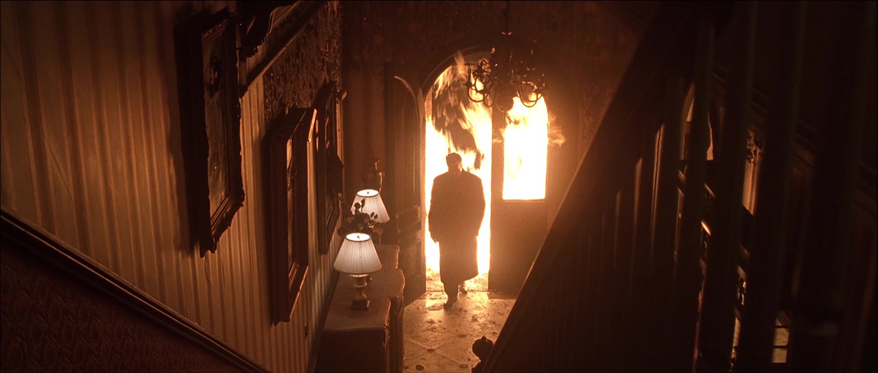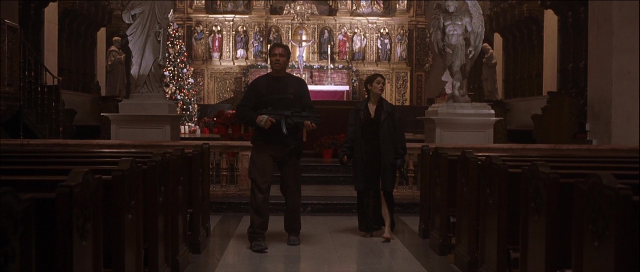 Il nous raconte la classique histoire du Diable qui vient sur Terre pour apporter l’apocalypse lors du passage à l’an 2000. Bon point pour le film déjà, son casting. Schwarzenegger est plutôt convaincant dans son rôle il faut l’admettre, et ça change de le voir en homme blessé, alcoolique, et qui saigne. Face à lui, Gabriel Byrne, choix à l’opposé de Schwarzenegger pour jouer le diable. Costard, sourire, la classe, tête de gentil. La moitié du temps, ce choix est payant et apporte de bonnes choses, l’autre moitié du temps, et bien, il cabotine et La Fin des Temps franchit la ligne sur laquelle il danse tout le long, la frontière entre la série B sympa et le nanar. Mais que ce soit de la série B ou du nanar, La Fin des Temps est tout de même un film de studio à 100 millions de budget, oui rien que ça. Et à ce niveau là, et bien pareil, il y a du bon et du moins bon. Le budget permet à Peter Hyams de livrer un film d’action plutôt sombre, mais les scènes se voulant impressionnantes sont soit à la frontière (ou clairement dans) du nanar, soit souffrent d’effets numériques qui ont bien mal vieillis et paraissent risibles aujourd’hui. Les effets spéciaux de Outland en 1981 ou de 2010 en 1984 du même Peter Hyams vieillissent bien mieux, c’est vous dire, alors que les budgets étaient bien moindres.
