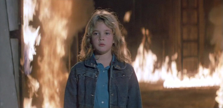Les personnages secondaires prennent de l’importance, mais Mark L. Lester continue de filmer son film calmement, et proprement, avec ce cachet années 80, encore plus marquant puisque la musique est signée Tangerine Dream (Le Solitaire, La Forteresse Noire, Aux Frontières de l’Aube). Musique contenant quelques excellents thèmes d’ailleurs, notamment pour la scène finale. Scène finale d’ailleurs qui, bien que dans un sens sans surprises, les écrits de Stephen King racontant quelque peu la même histoire nous ayant habitués à cette structure (Carrie), contraste avec le reste et annonce déjà la direction que prendra Mark L. Lester l’année suivante avec Commando, à savoir : faire tout exploser, faire tout brûler, tuer tout le monde, carnaaaaaaaaaaaaage ! Une scène au final jouissive, bien que perfectible (quelques effets incrustés à même la pellicule, comme les ricochets de balles, ou encore un bullet time raté avant l’heure), mais qui délivre les excès pyrotechniques que l’on est en droit d’attendre de Firestarter. Des flammes, du feu, des cadavres, des explosions, et j’en passe. Rien ne sera épargné, et étonnement, la petite Drew Barrymore n’avait rien à envier aux gros bras de Schwarzenegger dans Commando, elle faisant le même boulot pour le même résultat, sans suer une goutte, sans même être blessée. Alors oui, par certains aspects, Firestarter a prit un coup de vieux, son esthétique années 80 ne plaira pas aux réfractaires de cette époque, mais il demeure assez efficace.