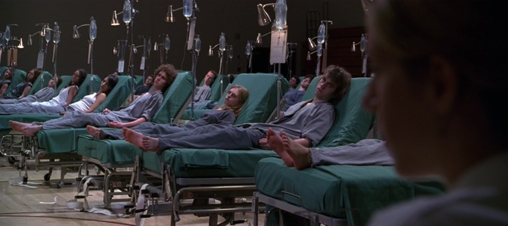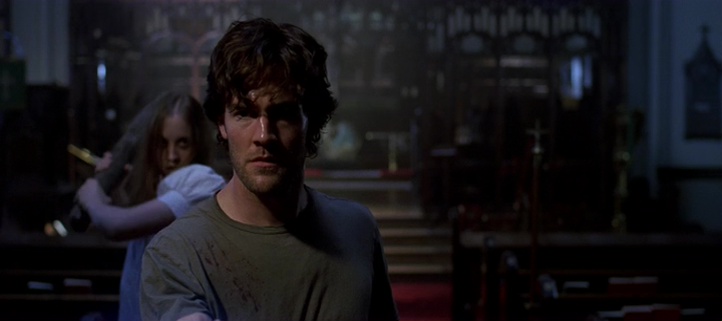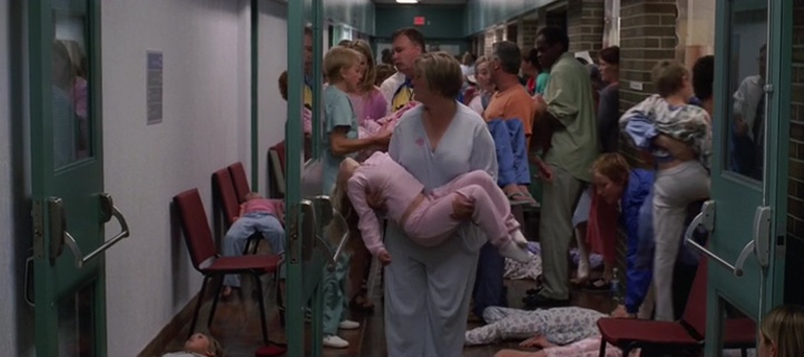 En fait, Le Fléau, on peut le découper clairement en deux parties distinctes. 45 premières minutes prometteuses, qui tiennent la route, un point de départ génial, quelques scènes glaçantes, quelques scènes prenantes… puis les 45 dernières minutes, ratées, clichées, souvent bancales, et un final expéditif qui a du sens (n’en déplaise à tout ceux qui ne captent rien) mais qui reste hyper mal amené. Un peu un film deux en un en fait. Donc, les 45 premières minutes, bien qu’imparfaites, tiennent clairement la route. Le point de départ est excellent et glaçant, quand un beau jour, tous les enfants de moins de 9 ans tombent dans le coma, dans le monde entier. Les hôpitaux sont pleins, les parents paniquent. Quel sacré point de départ je vous le dis ! Puis l’intrigue reprend cash 10 ans plus tard, on nous introduit les personnages principaux un peu clichés, mais une certaine ambiance plane sur le métrage. Oui, on sent le budget limité (l’épidémie, l’hôpital blindé qui se résume à un couloir avec quelques figurants, la petite ville souvent déserte), mais les idées sont là, et un petit miracle se produit. On suit l’ensemble, l’ambiance est là, notamment grâce à une excellente musique. Et quand les enfants finalement, après 10 ans de coma, se réveillent et se mettent à tuer tous les adultes, le film devient alors un peu plus classique (un peu comme un banal slasher, ou un survival), mais non dénué de qualités. Certaines scènes comme la scène dans le lycée convertit en hôpital fonctionne d’ailleurs plutôt bien, le film parvenant à faire durer le suspense, en jouant sur l’attente du spectateur, ou sur les ombres.