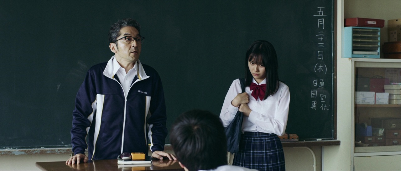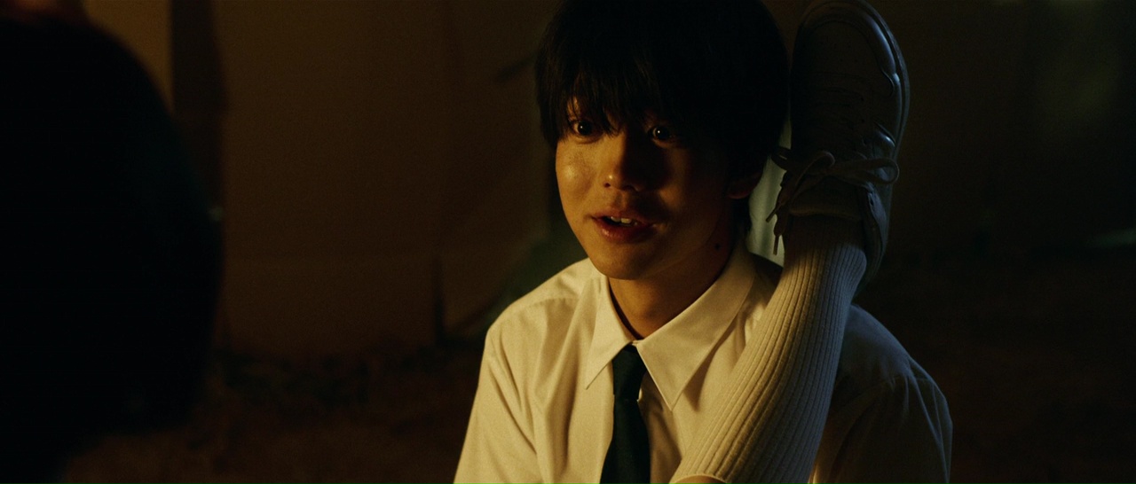 Un film qui veut donc parler des tourments adolescents en utilisant tout un panel d’émotions, de styles, de genre. Par moment, on a même l’impression qu’Iguchi veut faire son Sono Sion, tant dans sa description de la psychologie adolescente, certains tourments, ou même certaines idées, on semble être dans le cœur du cinéma de Sono. Mais Iguchi n’a pas le même talent pour filmer, même si en soit, il livre une copie propre, et prouve également qu’il sait toujours diriger des acteurs. Ce n’était pas gagné tant beaucoup viennent de l’univers des dramas, ou tout simplement débutent. On y suit donc Kasuga Takao, un jeune presque comme les autres, qui a sa bande de potes, en pince pour une fille de sa classe, et qui, alors qu’il retourne à l’école pour récupérer un livre qu’il a oublié (et qui donne son titre au film, oh subtilité), tombe sur les vêtements de sport de son crush, et sous la panique, se sentant observé, les vole et les ramène chez lui. Sauf qu’une de ces camarades de classe, passant son temps à dormir en cours et à ne pas respecter l’autorité, utilisant un langage pour le moins fleuri, l’a vu, et va en profiter pour le faire chanter.