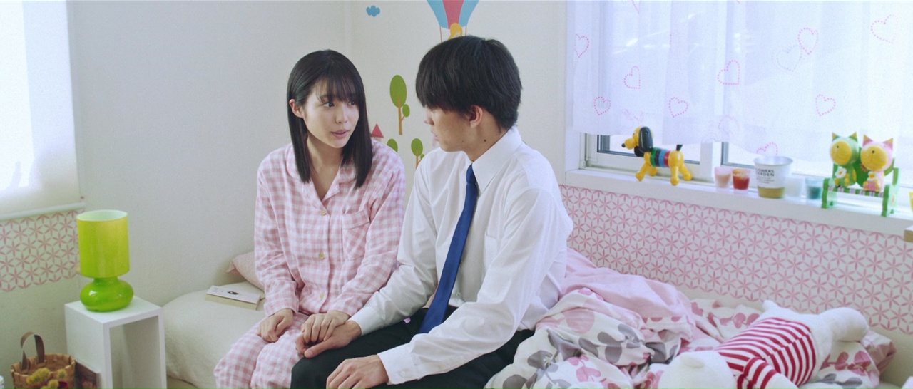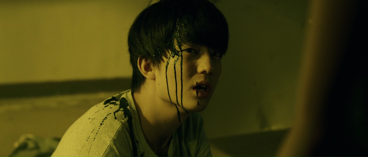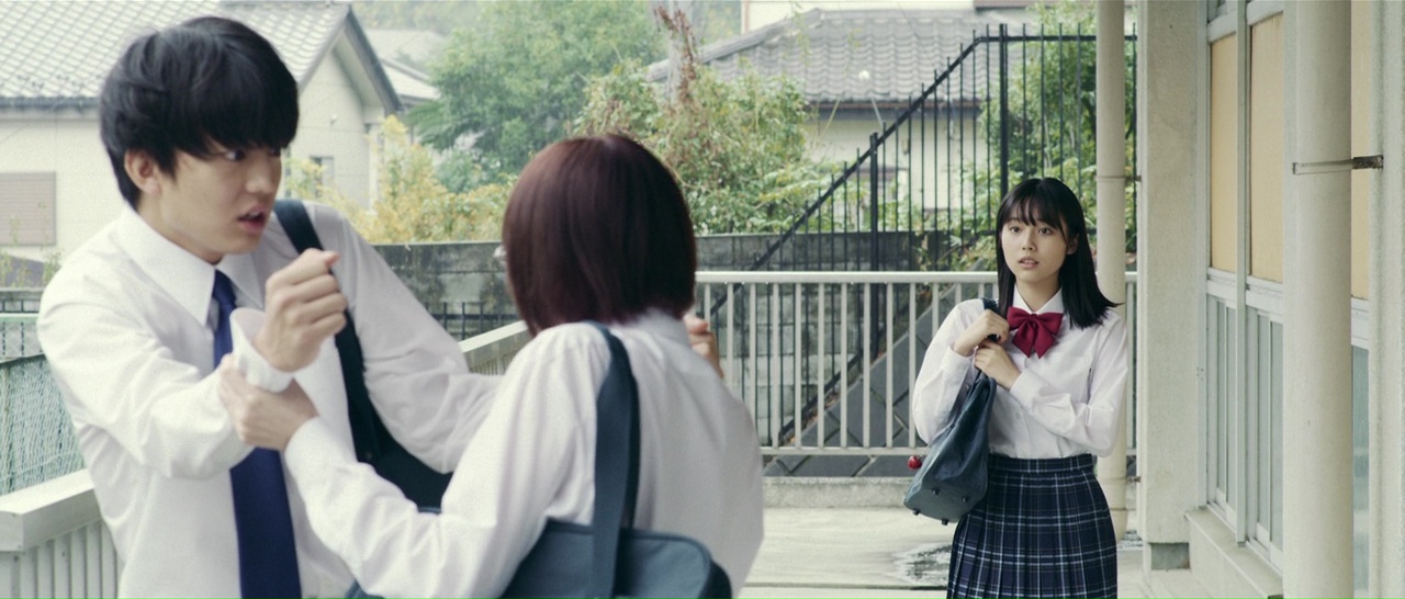 Débute alors une relation étrange, une sorte de trio amoureux, entre rage, haine, répulsion, soumission, manipulation, et beaux sentiments. Et si j’étais perplexe pendant 20 minutes, la magie a finie par opérer. Ito Kentaro joue notre jeune héros timide, qui passe la plupart de son temps à subir les autres et est clairement le soumis ici. Et qui dans le fond, va se mettre à aimer ça. Il s’en sort plutôt bien, même si comme d’habitude il a probablement plus été embauché pour attirer de la midinette in love que pour ses talents d’acteur. Face à lui, nous avons celle qui le soumet, Tamashiro Tina, qui décidemment était très présente sur les écrans en 2019, et pas forcément pour le meilleur, puisqu’elle tenait le premier rôle dans le détestable Diner de Ninagawa, et tenait le rôle d’Enma Ai dans l’adaptation sur grand écran de Hell Girl par Shiraishi. Ici, même si elle va beaucoup crier, elle s’en sort très bien dans son rôle. Le reste du casting principal sera constitué de Akita Shiro, qui débute, tenant là son deuxième rôle au cinéma après seulement 2 dramas et Iitoyo Marie, vue récemment dans le film Shirai San, et ça tombe bien, je vous ai dit beaucoup de bien du film il y a quelques jours.