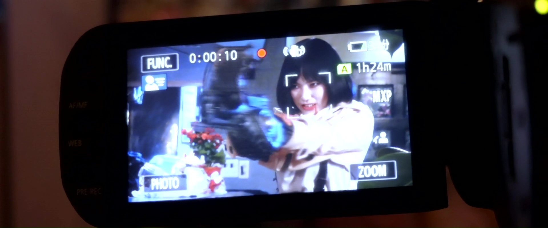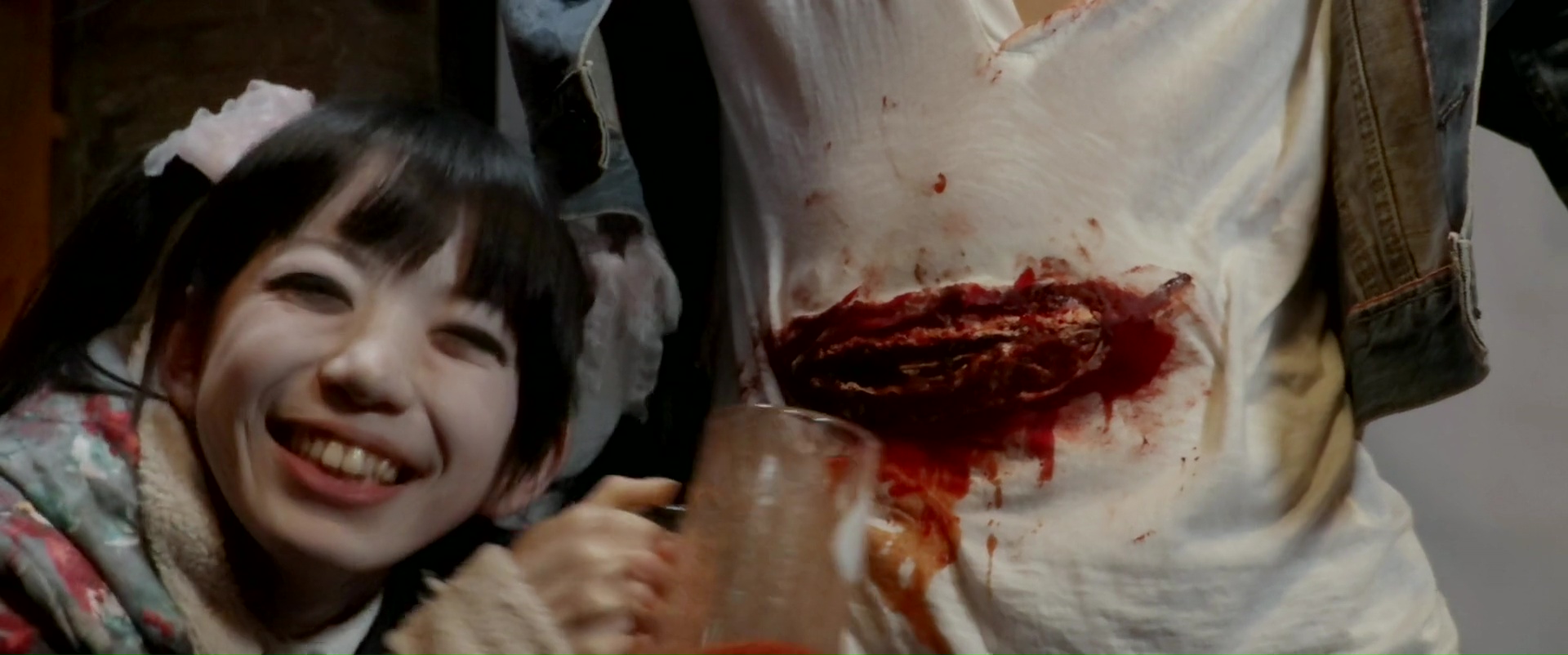 Car en plus, Ghost Squad met un certain temps avant de démarrer, et se veut véritablement extrêmement léger durant sa première partie, et bien entendu, incroyablement stupide. Si bien que quand sans prévenir, quelques idées un peu plus folles débarquent, comme le chien fantôme qui va bouffer des visages, ou carrément un pistolet à tête de bébé, il est bien trop tard pour nous faire décrocher un sourire. Pourtant je reste persuadé que les fans d’Iguchi (ça doit bien exister, même si l’espèce est rare) trouveront sans doute leur compte avec Ghost Squad. Peut-être que ce n’est tout simplement plus sur moi, ou qu’à force de voir un réalisateur faire la même chose sans s’améliorer pendant 15 ans, cela m’a lassé. C’est possible oui. Et pourtant, j’avais défendu Karate-Robo Zaborgar et son hommage sincère au genre, j’avais défendu Tomie Unlimited et sa vision grotesque de l’œuvre de Ito, j’avais défendu Zombie Ass même si c’est un film de merde dans tous les sens du terme. Mais Ghost Squad, ça a plus l’odeur d’un RoboGeisha, un film qui se repose sur une seule idée et ne va jamais tenter de froisser personne, restant à la surface des choses, et n’étant qu’un produit inoffensif qui n’a rien à dire, rien à montrer. Ou peut-être juste qu’un film où Iguchi est à la fois scénariste, réalisateur, directeur de la photo (chose qu’il aime faire depuis 2/3 films apparemment) et monteur, c’est juste trop pour ses petites épaules. Perso, je me dis juste qu’il serait bien plus « efficace » sur des films où il ne touche pas au scénario.