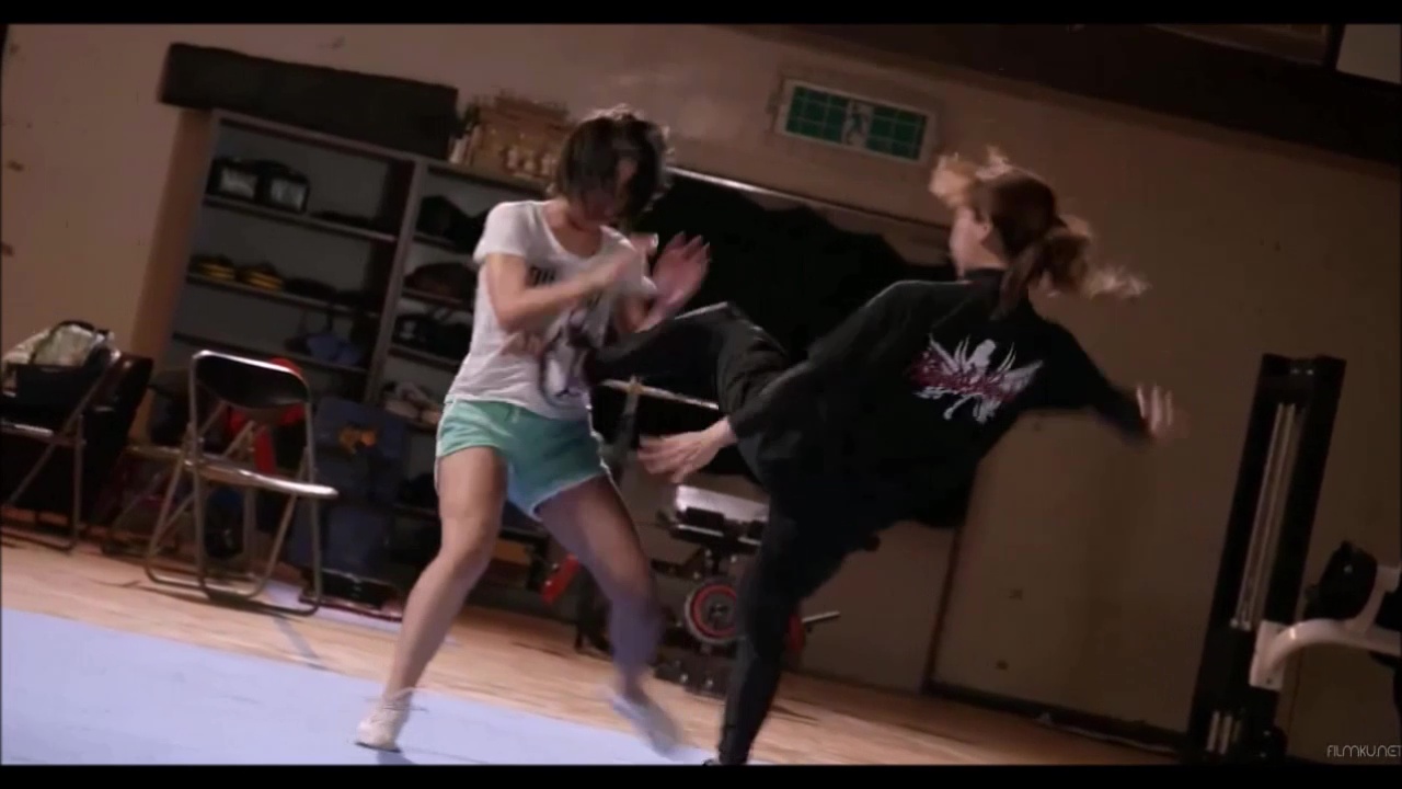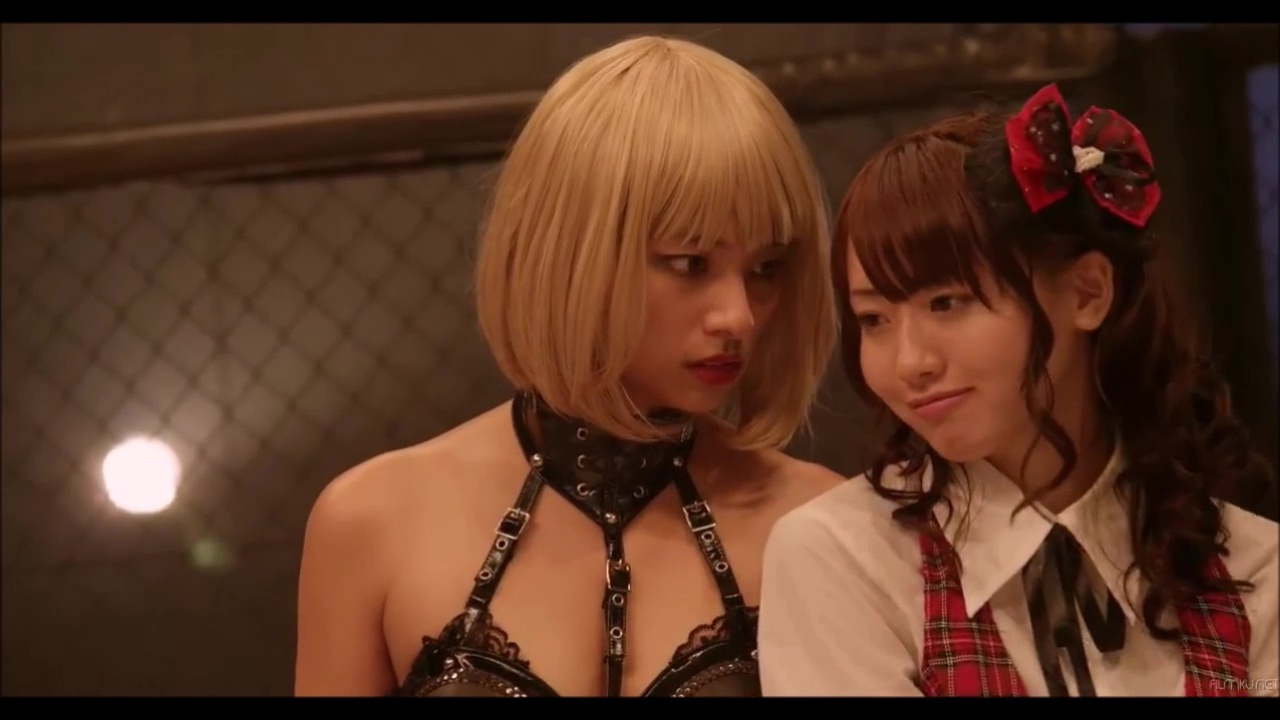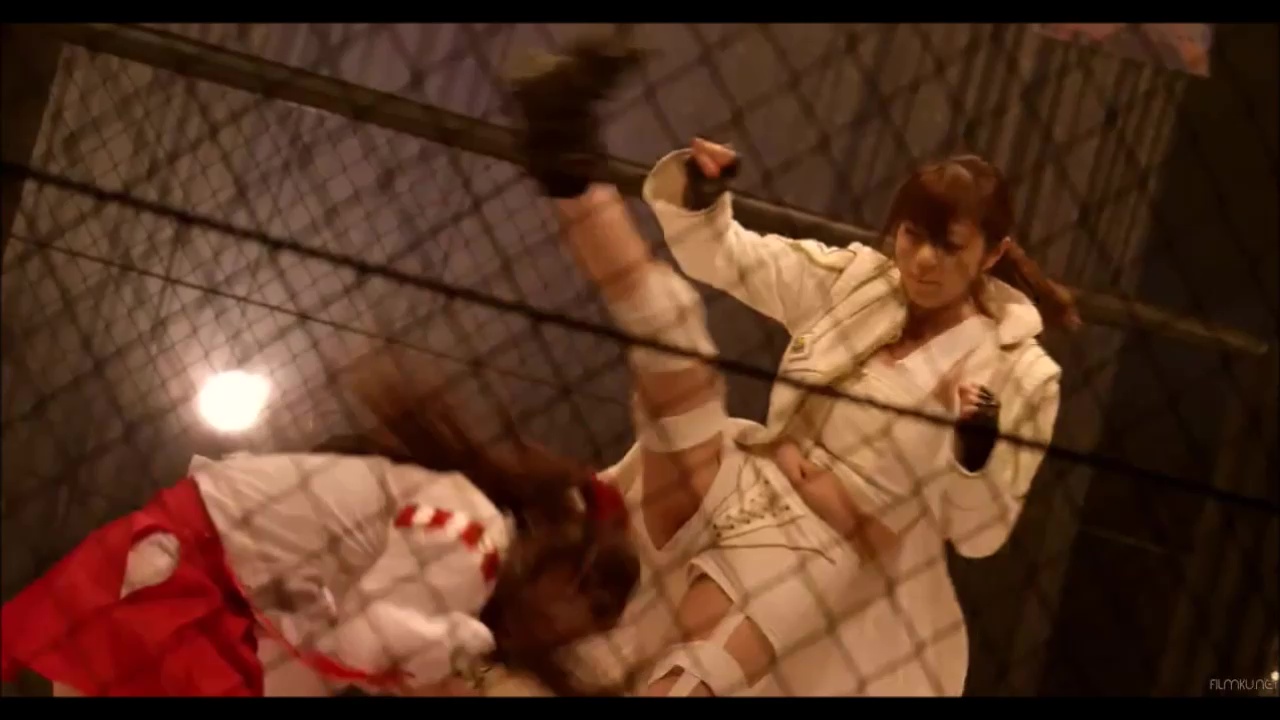 Girl’s Blood donc, c’est un tournoi, qui a lieu tous les jours dans une ancienne école abandonnée. Bon, les normes de sécurité et autres ne sont pas respectées, mais qu’importe. Des femmes s’affrontent dans une arène fermée, dans des combats qui s’apparentent à du catch féminin version Japonaise, c’est-à-dire avec tenue aguichante et fan service dans notre face, mais aussi avec coups de pieds retournés dans la face. Durant les 15 premières minutes, je n’y croyais pas, et le film nous présente les combattantes, puis enchainent les courts combats pour présenter tout ça, et c’est là que je me suis aperçu, malgré un côté pas toujours bien crédible, que j’avais sous les yeux un film fait avec passion. Et que malgré sa trop grande durée de 2h08 (Director’s Cut forever, et on veut des boobs ici), je me suis pris au jeu durant tout le film. Nous suivons donc en particulier quatre combattantes. Miko qui aime le fouet et travaille dans un club SM d’ailleurs à côté, et qui tombe amoureuse de la petite nouvelle, Mayu, avec sa petite tête d’enfant de 14 ans qui la fait donc passer pour une Lolita aux yeux du public. Car dans Girl’s Blood, si il ne faudra pas chercher un fond quelconque, il s’agît là de cinéma d’action simpliste, doublé d’érotisme purement d’exploitation, on peut malgré tout trouver des brides d’idées. Des combats plus ou moins préparés. Une combattantes qui se fighte en fonction du public, de ses goûts, de ses réactions. Un directeur qui habille et nomme ses combattantes en fonction de ce qui pourrait être aguicheur. Et si on a dans le premier rôle la compétente Satsuki (jouée par Haga Yuria, pas à la grande carrière vu que je ne l’avais vu que dans le très moyen End Call), le métrage ajoute rapidement un nouveau personnage, Chinatsu, que le directeur fera donc passer pour une Chinoise, tenue à la Street Fighter en prime. Le reste du casting est plutôt surprenant, puisque les deux autres actrices sont Misaki Ayame, vue dans des séries comme Cutie Honey The Live (et ça, j’adore) ou des films que l’on préférera oublier (L’Attaque des Titans)et Koike Rina. Mais surtout on trouve à leurs côtés Momose Misaki, et pour les connaisseurs, la revoir dans un rôle souriant et combatif, ça nous ramène clairement à ses débuts dans Gothic & Lolita Psycho, ou la série The Ancient Dogoo Girls.