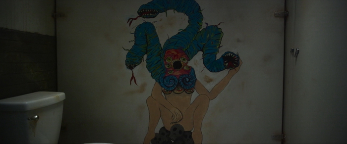 Encore inédite chez nous, Glorious est une petite production arrivée en exclusivité aux States sur la plateforme Shudder. Elle est basée sur un histoire courte de Todd Rigney, un des scénaristes du film, substantiellement retravaillée pour être un long métrage par deux autres scénaristes, Joshua Hull (Chopping Block) et David Ian McKendry (Psycho Granny). L’ensemble est mis en scène par Rebekah McKendry qui signe là son troisième long métrage avec peu de moyens mais une réelle envie de bien faire et de proposer au spectateur quelque chose qui le surprendra. J’avoue qu’un huis-clos fantastico-horrifique dans des chiottes publiques d’une aire de repos, celle-là, je ne l’avais pas vu venir. Huis-clos oblige, et bien que l’introduction et quelques flashbacks nous sortent un peu de là, le film va se dérouler dans une seule et unique pièce de quelques mètres carrés que vous pouvez imaginer bien craspec. Non, il ne s’agit pas ici de ces aires d’autoroute de luxe nettoyées trois fois par jour, mais bien d’un petit truc dans un trou paumé sans entreprise de nettoyage pour rendre la chose attrayante. Huis-clos oblige également, le nombre de personnage est extrêmement limité puisque durant 80% du film, l’acteur Ryan Kwanten (Dead Silence, la série True Blood) va échanger avec une voix, celle de l’excellent J.K Simmons (Spiderman, Whiplash) qu’on ne verra donc jamais. Rassurez-vous, Glorious ne se résume pas à deux personnages qui discutent dans des chiottes dégueulasses. Les choses deviennent rapidement étranges, passant d’une rencontre un peu inconfortable à un cauchemar halluciné rempli de néons multicolores, ponctué de tentatives d’évasions du personnage principal ainsi que de quelques moments sanguinolents bien craspecs histoire de ne pas donner l’impression que le film tourne en rond. On nage ici en plein film d’horreur cosmique mâtiné d’humour noir, dans lequel on sent très vite les inspirations lovecraftiennes car oui, il y a du Cthulhu là-dedans.