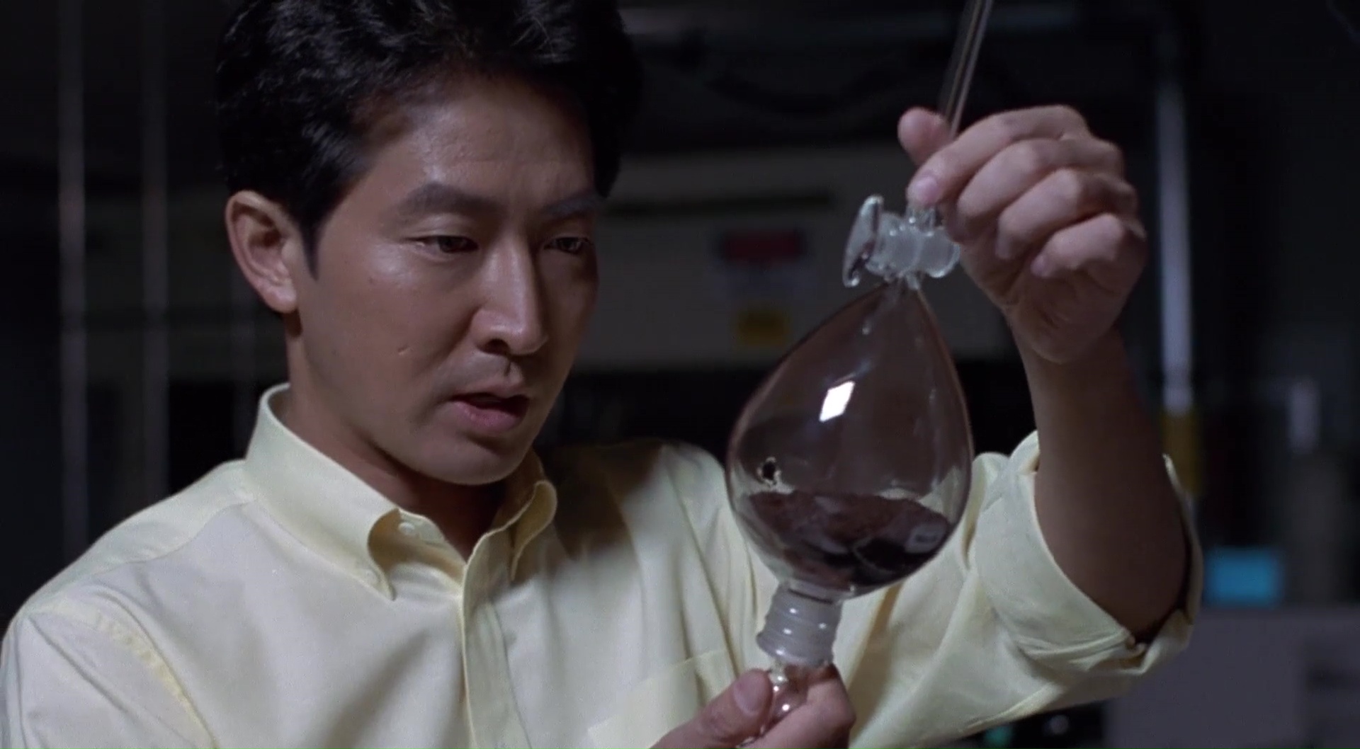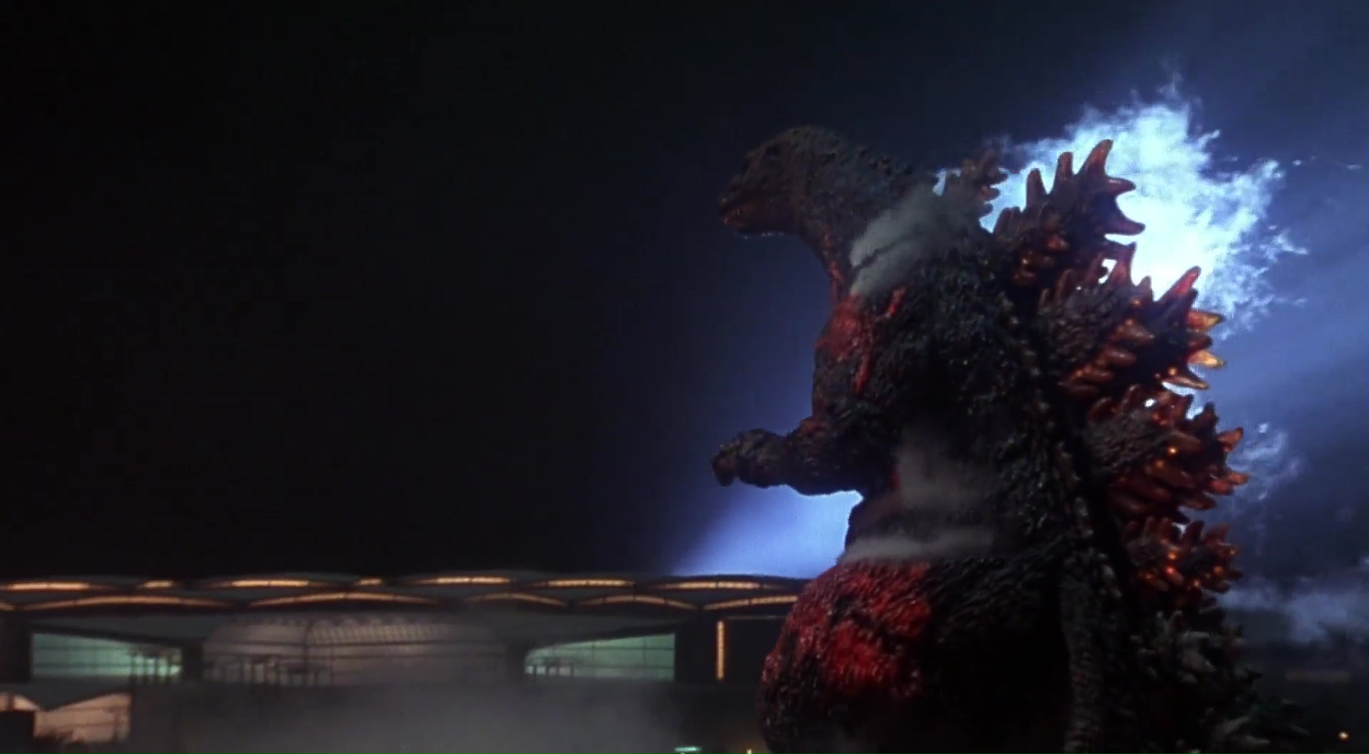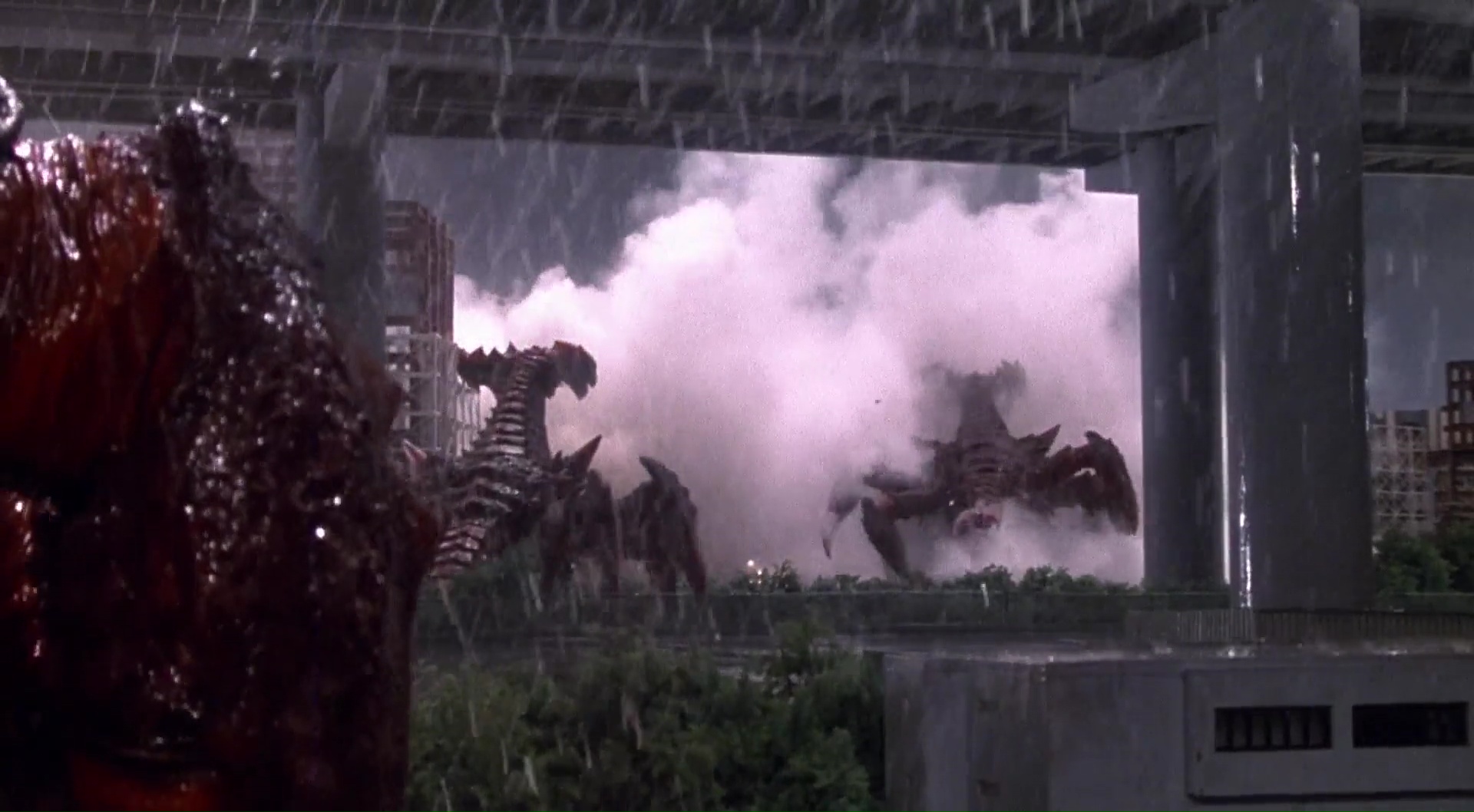 On suit donc dans la première partie deux histoires : celle de Godzilla, rougeoyant, dévastant des villes entières pour venir vers Tokyo, et celle de scientifiques essayant de créer une arme pour lutter contre Godzilla pour le refroidir avant que son coeur n’entre en fusion. Et en faisant ces recherches, ils finiront par créer, contre leur volonté, plusieurs monstres mutants, sorte de crabe de la préhistoire. Les combats entre les humains et les monstres ayant envahis l’usine est assez intéressant et joliment réalisé, tout comme la scène extérieure où une des créature s’attaque à l’héroïne, réfugiée dans une voiture. Okawara Takao fait du boulot plutôt solide à la mise en scène, et c’est un petit plaisir pour le fan de Kaiju Eiga que je suis. Puis, comme dans tout bon Godzilla, les monstres vont finir par s’affronter. Les monstres vont fusionner, pour donner naissance à un seul monstre : Destoroyah, qui subira encore une mutation dans le film, pour pouvoir carrément s’envoler. Un autre monstre apparaît : le fils de Godzilla. Mais si celui-ci était, dans tous les autres films dans lequel il apparaît, très énervant, avec sa tête de casimir ridicule (oui, tous les opus où il apparaît m’insupportent en général), il a ici grandit, et ressemble au Godzilla normal des autres films.
