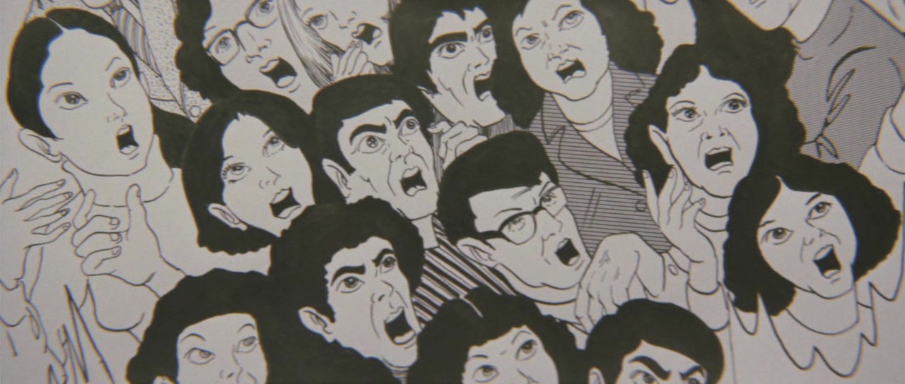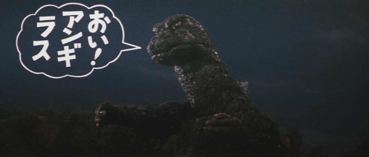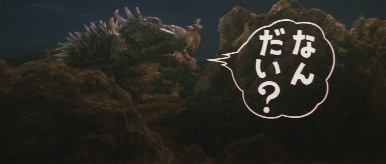 Seule réelle nouveauté au programme donc, Gigan, Kaiju assez improbable, avec sa crête, ses mains en forme de crochets, sa scie circulaire sur le thorax, son œil rouge unique lui donnant un air de cyclope, oui comme le fameux X-Men, d’ailleurs il lancera un rayon avec son œil aussi. Surprise également, Godzilla, sauveur de la Terre, se traîne partout son second, Anguirus, un peu comme dans un mauvais film de kung-fu où le vieux maître est toujours suivis par son second un peu boulet sur les bords. Sinon, rien de bien neuf à l’horizon avouons le. Cet opus n’est certainement pas le pire, mais n’est absolument pas dans les meilleurs non plus. Il faut dire qu’entre son ton enfantin qui nous fera souvent lever un sourcil (encore), et l’usage de plans venant des films précédents, ça sent le produit fait à la va vite pour continuer la saga alors que personne n’avait d’idées. C’est l’impression que l’on a. La première heure va faire basiquement ce que la saga fait souvent. À savoir une trop longue introduction. Les personnages sont peu intéressants, le ton est léger, notre héros est un dessinateur de manga, ce qui permettra au film d’insérer une idée fort étrange dans le récit. Oui, Godzilla, toujours avec Anguirus donc, parle maintenant. Enfin, parle… Les monstres se parlent en émettant un son de vinyle 33T rayé depuis des années, et ce qu’ils se disent s’affiche à l’écran dans des bulles façon manga. Une idée improbable qui pourra faire rire dans une première heure au final calme et peu intéressante.