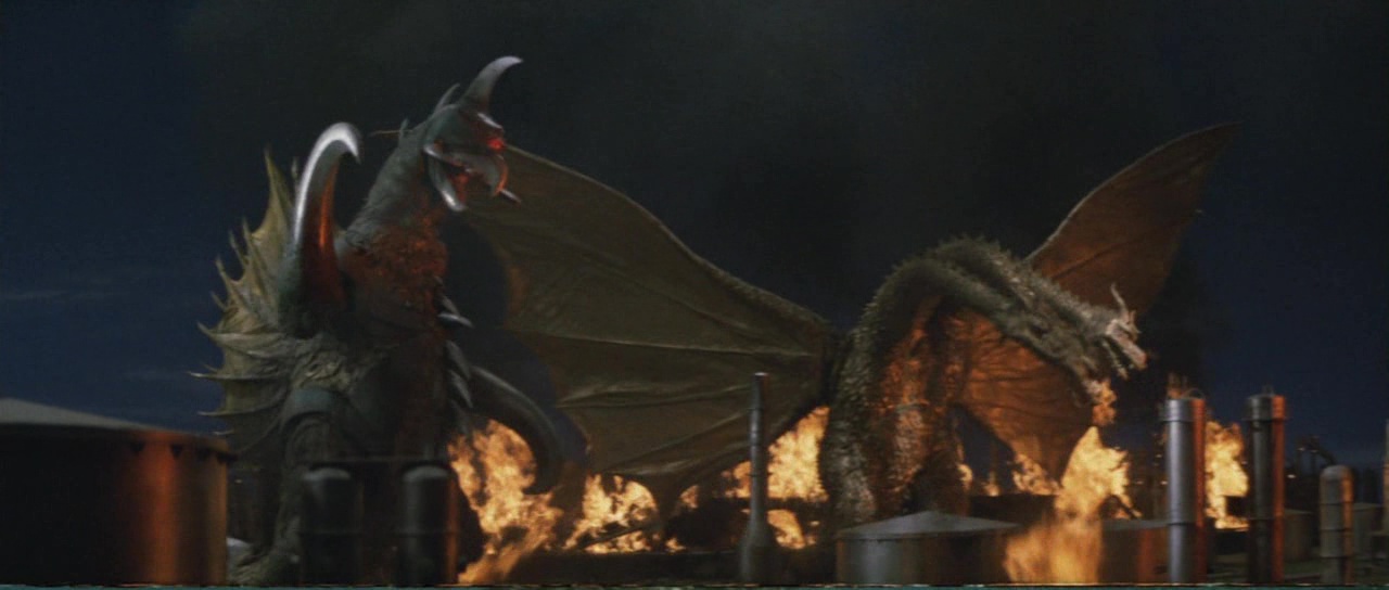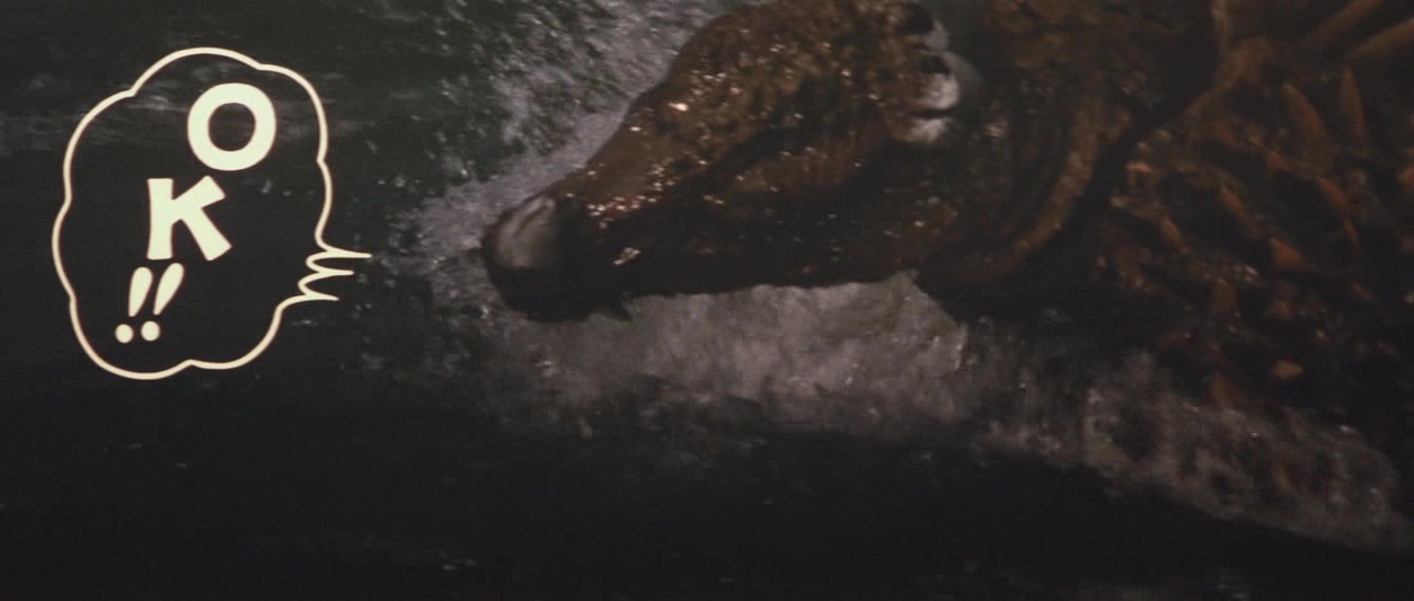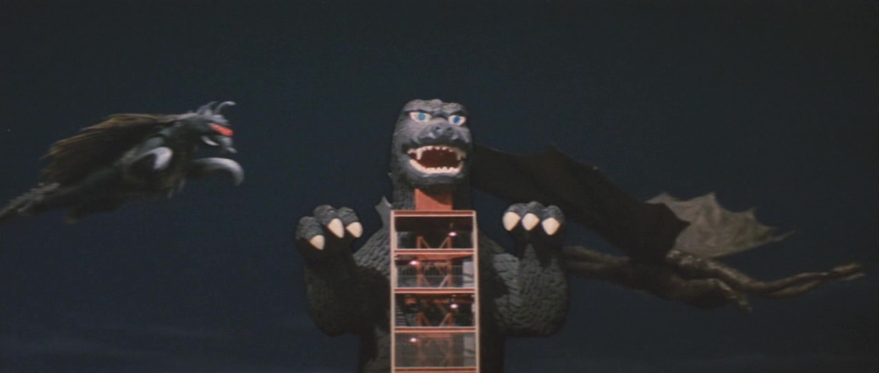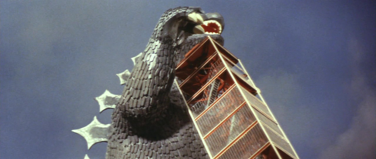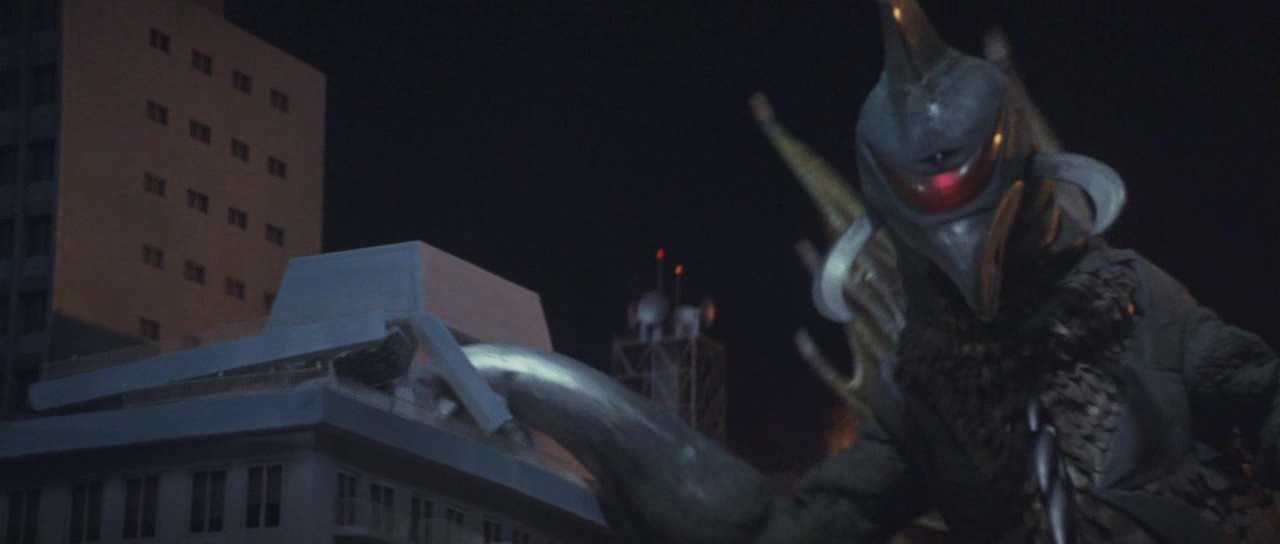 L’amateur de Kaijus devra lui véritablement attendre la dernière demi-heure pour que le film se réveille. Malheureusement, là aussi le résultat n’est pas fameux. Entre les stock shots de King Ghidorah venant de ses précédentes apparitions (et donc pas forcément raccord avec le reste), un Gigan improbable, Anguirus qui basiquement passe la demi-heure à se prendre des coups et à finir au sol pour se relever et ainsi de suite, le spectateur n’aura pas grand-chose à se mettre sous la dent. Certes le combat en lui-même sera long, et donc dans un sens généreux, mais quand l’ensemble n’est pas fameux, un combat long peut se révéler ennuyeux. Car Fukuda Jun n’est pas un réalisateur de génie, le montage peine à dynamiser l’ensemble, certains plans sont même ridicules, lorsque l’on verra Gigan prendre la pose à côté de King Ghidorah par exemple. Curiosité par contre, pour la première fois, nous verrons Godzilla saigner. Lorsque Gigan le chargera et parviendra à le blesser avec la scie circulaire au niveau de sa poitrine, Godzilla saignera ! Et oui, il est plus humain, plus gentil, et donc plus vulnérable. Autre moment ridicule qui restera dans les mémoires, l’apparence des envahisseurs une fois vaincu, qui ne sont en réalité que des cafards qui parlent. Oui, on tombe bas, et la saga n’a plus peur du ridicule depuis le temps. Un mauvais opus de plus pour la saga et pour Fukuda. Reste quelques rires, l’introduction de Gigan, improbable, parfois ridicule, mais qui a son charme.