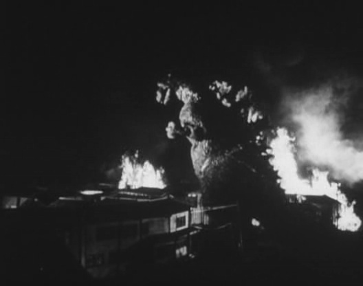 Godzilla nous raconte donc l’histoire de, vous vous en doutez, Godzilla, sa toute première apparition au Japon et sur les écrans. Des pécheurs disparaissent, des bateaux coulent, les légendes des locaux parlent d’un monstre datant de la préhistoire. Le gouvernement s’inquiète, tout comme les habitants, les journalistes sont à la recherche d’un gros titre. Puis un bon matin, des destructions, des traces de pas géantes sur le plage, et encore plus alarmant, des traces de radioactivité et même d’une trace de vie datant de plusieurs millions d’années. La première force de Godzilla, c’est avant tout son intrigue. Les personnages humains sont intéressants, les explications traitées avec le plus grand des sérieux et du coup passent comme une lettre à la poste. Le film prend son temps avant de nous révéler son monstre sacré, et ça fonctionne. La terre tremble, des bruits de pas, puis un cri qui retentit, un gros plan sur une partie de son corps, avant que la créature ne soit révélée dans son intégralité. C’est ce qui rend ses apparitions, pourtant rares, prenantes et réussies malgré une technique qui a vieillie, mais qui innovait pour l’époque où l’on faisait surtout appel à du stop motion. Rien de tout ça ici puisqu’il s’agira la majeure partie du temps d’un homme en costume qui fera voler en éclat des maquettes. Les choix de Honda Ishirô à la mise en scène seront également pour beaucoup dans la réussite du métrage. Car si certains effets ont vieillis, les apparitions du monstre tiennent toujours la route. Le réalisateur fait en effet le choix de révéler son monstre lors de scènes nocturnes, et peut ainsi jouer sur le côté crépusculaire de ces attaques, sur les ombres et l’obscurité, et donne un côté terrifiant et réaliste à ce qu’il se passe.