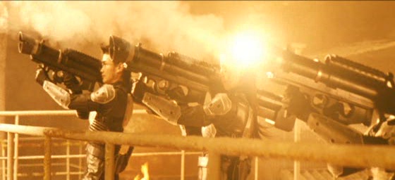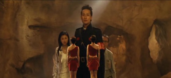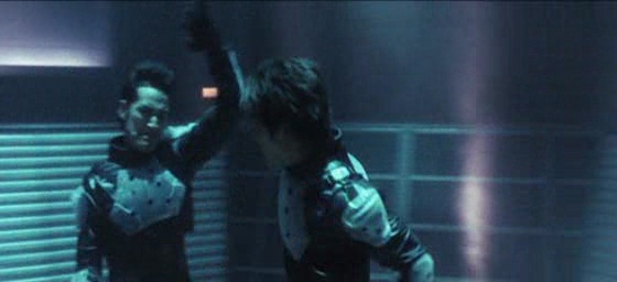 Et pourtant, j’ai voulu y croire au début, avec cette scène d’ouverture où les humains affrontent Godzilla. On retrouve notre fameux monstre, son costume, mais plus souple ce coup-ci. Costumes, maquettes, quelques effets numériques pas trop mal, et Godzilla se fait emprisonner dans la glace. Le film reprend alors bien des années plus tard, alors que le Japon a mit en place le centre de défense G pour affronter la possibilité d’arrivée de monstres géants. Et on comprend immédiatement que le film ne prend pas la bonne direction. Surtout après les 3 précédents excellents opus, qui parvenaient à mixer combats de monstres, moments poétiques, personnages humains plutôt intéressants et mise en scène dynamique. Dans Godzilla Final Wars, adieu la poésie, adieu les personnages intéressants, et adieu la mise en scène dynamique, nous passons à du Kitamura pur et dur. C’est-à-dire bonjour les personnages qui prennent la pose en étant habillés de manteau en cuir noir, bonjour les scènes de combats à mains nues, bonjour les courses poursuites en moto ou autres véhicules, bonjour les longueurs et scènes de dialogues inutiles et interminables. Dès la cinquième minute, on comprend que l’on se retrouve devant un Godzilla pas comme les autres, avec une scène de baston dans le style Matrix, avec ralentis, caméra tournant autour des personnages à 360°. Moui… Pourquoi pas, si Kitamura avait su gérer son rythme et au moins dire adieu à certains de ses tics. Ce qu’il ne fait pas, n’en faisant qu’à sa tête et en restant le sale gosse qu’il est.