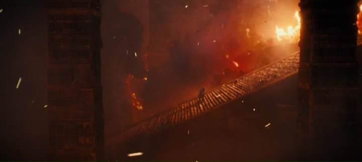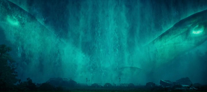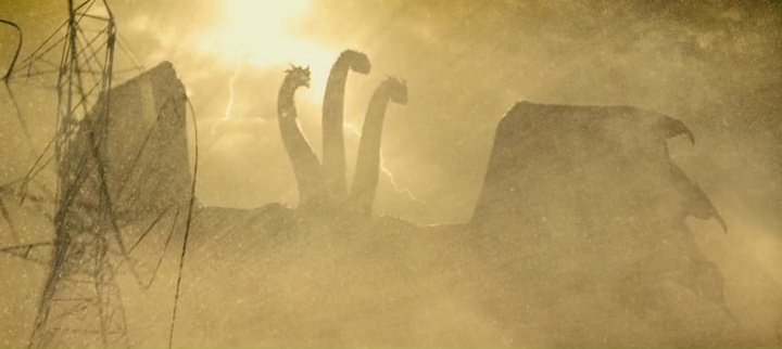 Car oui, chaque apparition de monstre, chaque plan, chaque scène, tout semble être fait pour mettre en avant les créatures, pour iconiser l’ensemble. Donc on a des monstres, mais à côté, des ouragans magnétiques, des tornades, des volcans en éruptions, de la pluie. Ça a de la gueule, peut-être même trop il est vrai. Mais parfois, ça fait clairement mouche. La scène de Rodan au Mexique est par exemple magnifique et fonctionne très bien. Idem pour la scène où Godzilla est caché au fond des eaux, magnifique scène. En ce sens, il est très difficile d’en vouloir à Dougherty, il se fait plaisir avec les gros moyens qu’on lui donne, et il essaye de nous faire plaisir par tous les moyens le plus souvent possible, quitte à se planter sur quelques scènes. Mais au fond, Godzilla, il est majestueux, cela fait plaisir de revoir Mothra (elle me manquait), même si son design lors des gros plans ne m’a pas complètement convaincu, Rodan revient de loin, et King Ghidorah est majestueux en plus d’avoir quelques idées intéressantes dans son design. Même niveau musique, le film reprend pas mal d’éléments de la saga made in Japan, avec le thème de Godzilla, quelques notes du thème de Mothra, en plus de reprendre des éléments de la mythologie que le connaisseur validera. C’est de ce côté là que Godzilla 2 est une grande réussite, bien qu’au final un film parfois bien bancal. Si le premier Godzilla rendait hommage au premier film de la saga, cette suite rend hommage à tout ce qui a suivi.