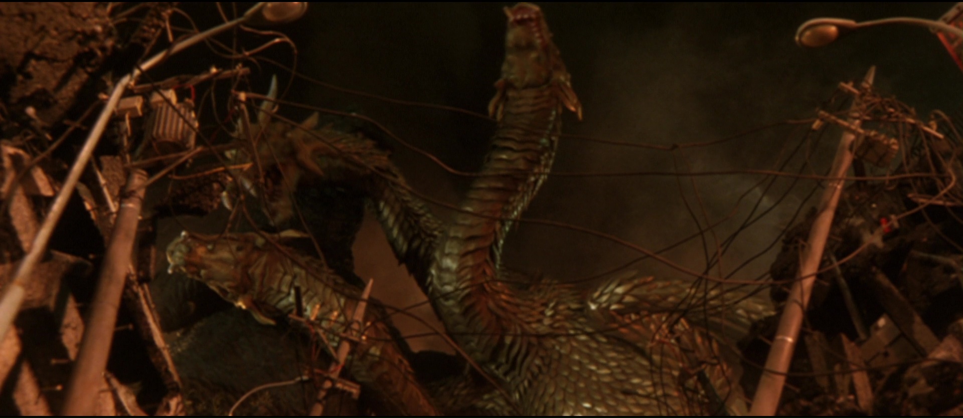 La musique a une vraie caractéristique dans le film, soulevant telle ou telle émotion, que ce soit dans les moments intimistes entre les différents personnages, ou dans les passages purement bourrins où les monstres s’affrontent. Si le mythe de Godzilla est traité de cette manière, les autres monstres présents dans le film, du nombre de 3 (Mothra, King Ghidorah, et Baragon), ne sont pas en restent, puisqu’ils représentent maintenant les gardiens de la terre. Si pour Mothra, cela a toujours été son rôle, il est étrange de voir King Ghidorah dans un pur rôle de gentil. Ces trois monstres protecteurs de la Terre bénéficient dans ce film d’un nouveau design tout à fait honorable, les mettant bien en valeur. Et puisque l’on parle du design des monstres, attardons nous sur celui de Godzilla. Son costume a été légèrement revu, et surtout, différence de taille par rapport aux autres épisode, ces yeux. Ceux-ci sont en effet tout blancs, lui donnant en quelque sorte l’apparence d’un mort vivant, le rendant vraiment terrifiant.
