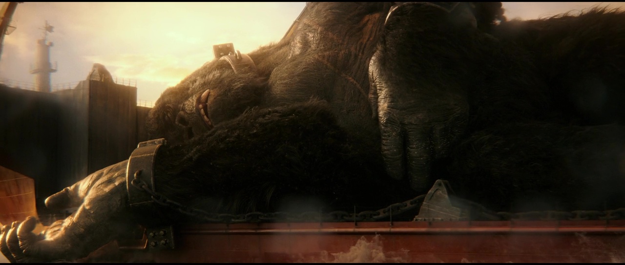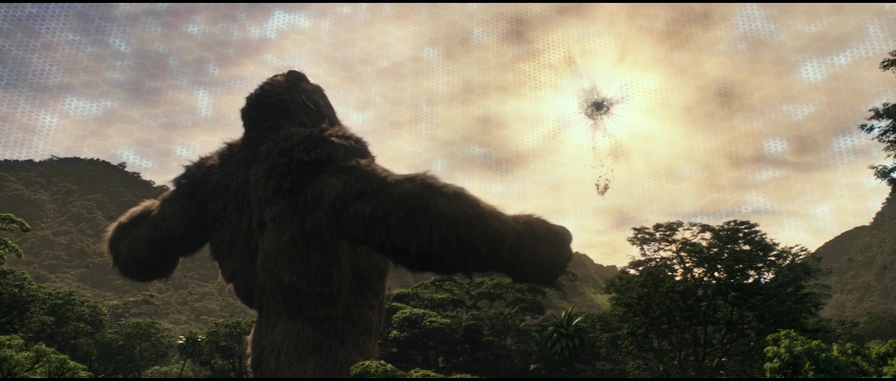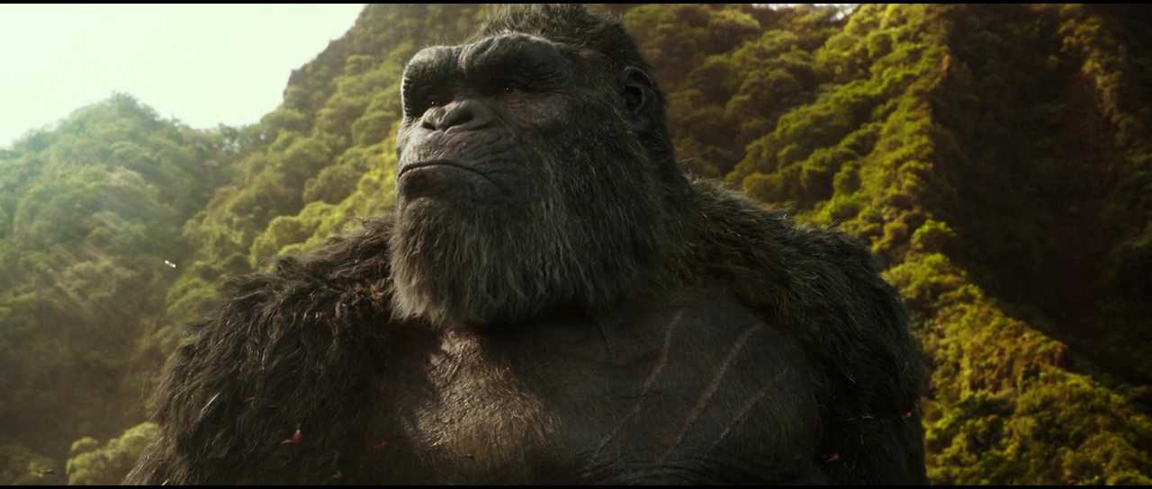 Alors oui, j’entends les deux du fond gueuler « ouais mais on est là pour voir des monstres se foutre sur la tronche, on veut débrancher nos cerveaux, on s’en fout du scénar », justement les monstres, j’y arrive. Passons sur Godzilla, qui fait office de monstre trop secondaire, parfois simplement zappé de l’histoire, dont il est de toute façon relayé au 25eme plan, si bien que ses apparitions ne font même pas d’effet, quand elles ne tiennent pas du foutage de gueule pur et simple (ce plan où il fait demi tour, qui ne sert à rien, et qui en plus a sûrement coûté une blinde, si maintenant le budget sert à faire du vide en CGI, on est pas sorti). Quant à Kong, il a bien fallu l’intégrer au monsterverse, et si par ça il faut flinguer toute la mythologie autour du gorille, flinguons la, cette mythologie. Ainsi oubliez tout de Skull Island ou l’évolution n’a pas eu lieu et de ce fait est peuplé de dinosaures et d’aborigènes vouant un culte au roi, Kong donc. Non ici, Kong rentre chez lui, au centre de la terre d’où sortent les titans, pour reprendre son trône, qui n’est plus à Skull Island, dans des scènes qui rappellent d’avantage une attraction Universal Studios que le film démentiel qu’on nous a vendu. Puisque le métrage est trop centré sur lui, continuons avec le singe et son traitement scénaristique aberrant. Pour que le spectateur ne se perde pas dans la bataille, les scénaristes ont jugé bon de le prendre par la main pour lui montrer qui est le gentil dans l’histoire, et pour ça ils ont humanisé Kong pour le rendre tellement mignon que ça en devient gênant, aussi gênant que de le voir se gratter le cul au réveil, et de révéler qu’il comprend et pratique le langage des signes (ouais, comme dans Congo !), et il est copain avec une petite fille. Trop gentil, le gorille.