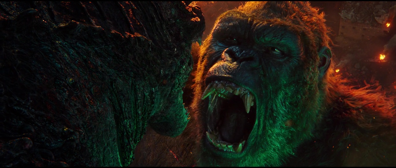 Petit rappel des faits : 2014 : Godzilla est rebooté par la Warner et rapporte 520 millions pour un budget de 160 millions, hors promo. Le film possède comme qualité la mise en scène spectaculaire de Gareth Edwards qui joue sur la perspective et les échelles, procédé encore plus pertinent en 3D, mais est plombé par un rythme complètement à la ramasse, un scénario pas glorieux et des scènes nocturnes par moments illisibles, de plus Godzilla est caractérisé comme un gros balourd, si il casse des immeubles, c’est pas de sa faute, c’est juste qu’il est trop gros. Pas un succès fracassant, mais de quoi donner à la Warner l’idée de mettre en place un univers en liant le roi des monstres à King Kong. Petit problème, le public ne semble pas adhérer au monsterverse, et Kong : Skull Island, produit pour un budget similaire, rapporte une recette similaire, il faut dire que ce film fun et con à la limite de la parodie est loin des versions de Merian C. Cooper et Ernest B. Schoedsack, puis plus tard celle de Peter Jackson (passons sous silence le King Kong de John Guillermin, et sa suite). La grosse douche froide vient avec Godzilla : Roi des Monstres, film qui a voulu se la jouer GMK, mais qui était au final ronflant, aux personnages creux et cons comme la lune, et ressemblait à une bouillie visuelle au scènes courtes mais parfois intenses (l’envol de Rodan) plus qu’au chef d’œuvre de Shusuke Kaneko. Le métrage ne rapporte que 386 millions, pour un film qui a coûté 170 millions hors promo, c’est un échec commercial et la décision ne se fait pas attendre : Godzilla vs. Kong, censé conclure une hypothétique phase 1, est maintenu, mais après, le monsterverse c’est fini. Enfin fini, on verra bien, reporté pour cause de covid, et puisqu’il n’y a que ça à voir, le film cartonne dans les pays où les salles sont ouvertes, en plus de ramener des abonnés à HBO max, dans le genre succès inespéré, Godzilla vs. Kong est un cas d’école, d’autant plus que le budget promo est des moindres vu que la majorité des cinés de la planète sont fermés. Pas de ciné, pas de pub, et vu les critiques positives qui arrive de partout, le public répondra présent d’autant plus qu’encore une fois, il n’y aura que ça à voir.