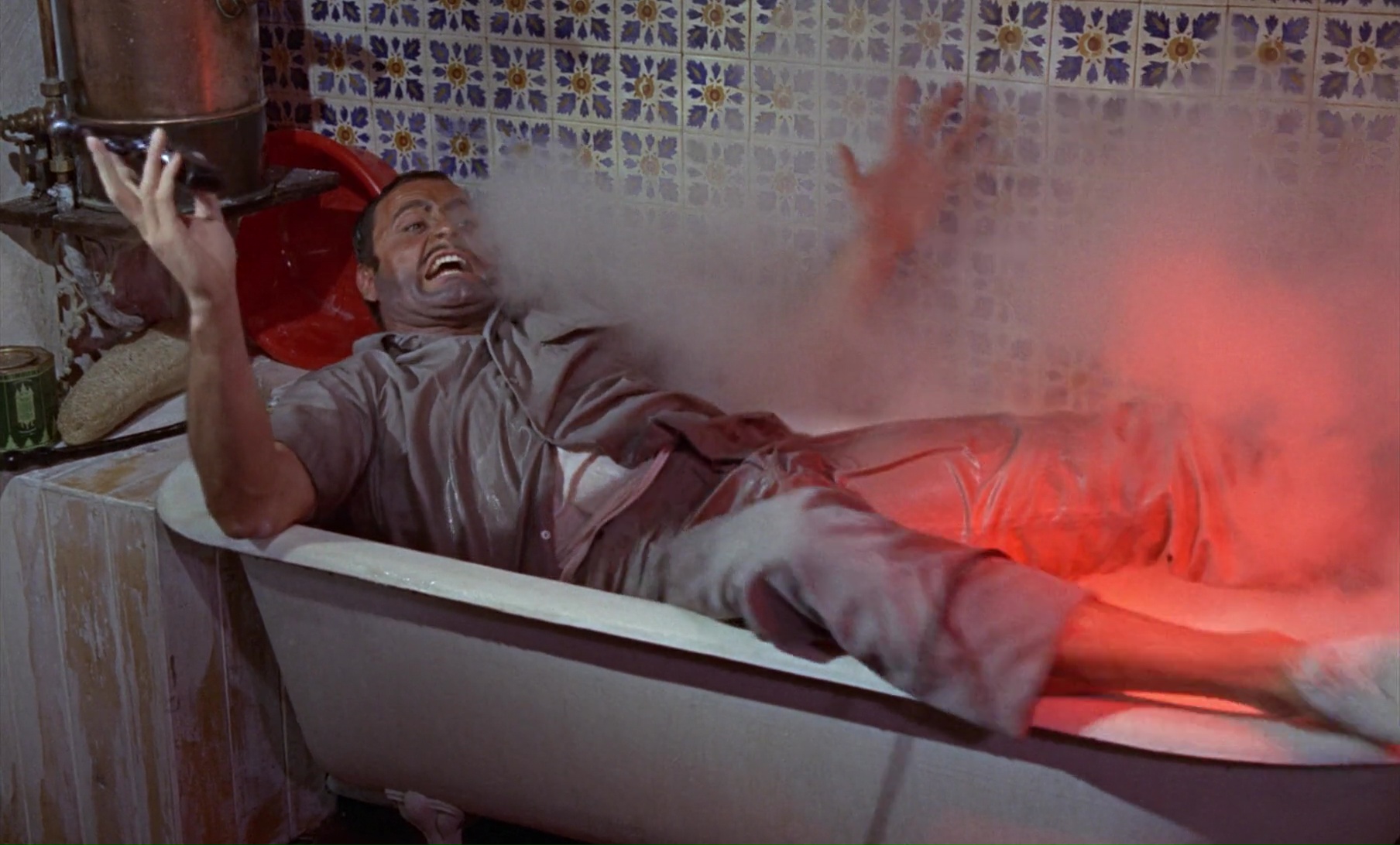 Il faut dire que commencer le film par une gigantesque explosion, une fille à moitié nue, et un combat se terminant par une électrocution dans une baignoire, avant d’enchaîner sur un générique ultra classe sur la chanson Goldfinger, ça met la barre assez haut. Heureusement, la suite ne vient pas abaisser le niveau. Changement de réalisateur ici, Terence Young après deux métrages cède la chaise de réalisateur à Guy Hamilton, qui avouons le, semble très à l’aise avec le genre et le personnage, n’hésitant pas à jouer de l’humour à de nombreuses ocrassions. Autant pour parfois une simple petite punchline lancées par Sean Connery, que dans les situations, comme lorsque la Bond Girl du film révélera son nom à James, qui pensera alors avec sarcasmes être en train de rêver. Il faut dire qu’une fille qui se présente en annonçant s’appeler Pussy, ça m’aurait sans doute fait réagir pareil. De l’humour plutôt bien dosé, jamais trop envahissant, jamais trop forcé, juste ce qu’il faut. Quand à l’action, si elle est présente mais plus dispersée que dans le précédent, elle augmente en qualité, la course poursuite en voiture avec l’usage des nombreux gadgets de Q étant assurément un grand moment. Mais avec cet opus, la saga James Bond semble avoir compris une chose. Faire un bon film de ce genre, ça repose beaucoup sur le fait d’avoir un bon méchant. Et c’est là que Goldfinger rentre en scène.