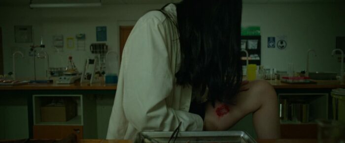 Dans Grafted donc, nous suivons Wei, une étudiante Chinoise en Nouvelle Zélande avec une marque de naissance sur le visage, et qui essaye de continuer les travaux de son père qui a tenté lui aussi de corriger ce défaut physique, quitte à en perdre au passage la vie. Et Grafted, sur bien des points, c’est une œuvre passionnante, autant dans ce qu’elle raconte que dans sa façon de faire et de mélanger différents genres, ce qui est à la fois un pari risqué pour la réalisatrice donc, qui signe son premier long métrage après quelques courts remarqués et appréciés, mais aussi une belle lettre d’intention et d’amour envers les différents aspects du genre horrifique. Le body horror est bien présent oui, mais dans Grafted, on trouve aussi un peu de slasher, les expériences de Wei lorgnent parfois vers le récit à la Re-Animator même si elle pratique les expériences sur elle-même, et on pourrait même voir dans sa toute première partie une envie de montrer un récit classique de teen movie, qui en soit, fonctionne lui aussi plutôt bien. Une œuvre donc variée et gourmande, mais qui parvient à bien marier tous ces aspects, ce qui tient déjà presque du miracle. Car Wei ne va pas seulement vouloir corriger sa tache de naissance, non, ça ira bien plus loin, à coup de vol de visage, et donc d’identité, un peu comme un Volteface, les colombes en moins, mais les coups de scalpels en plus. Comme dans le métrage d’action d’ailleurs, il faudra accepter le côté assez invraisemblable du procédé pour se raccrocher au sérieux de l’entreprise, bien que non dénué d’humour, mais à ce que le procédé raconte également. Car toute l’ironie de la situation, c’est qu’en changeant de visage, et donc en devenant des personnages bien plus populaires et en vue au sein de son école, Wei gagne des regards, une certaine attention, ce qui finalement, la fait rentrer dans un cercle différent, tout ça pour en quelque sorte renier sa différence, renier ce qu’elle est, pour ressembler juste à toutes les autres.