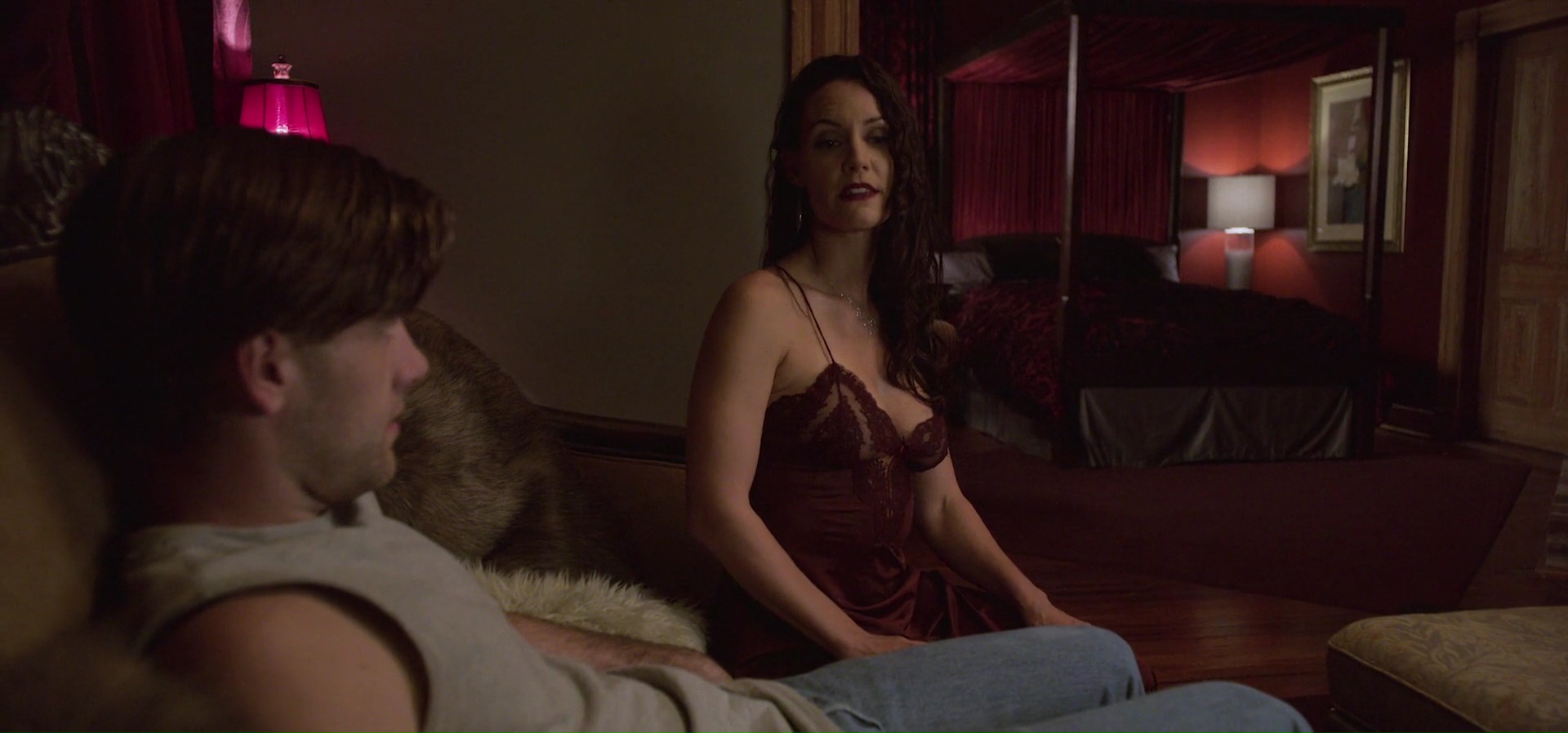 Surtout que dans son économie de moyens (quasiment un lieu unique, quasiment trois personnages), le métrage peut se focaliser sur l’important, à savoir la tension, et développer proprement ce qu’il veut. Alors forcément, on a droit à la classique introduction des personnages, quelques clichés qui ont la vie dure, ce qui nous rappelle bien que l’on est devant un petit DTV, mais pour un DTV, l’ensemble est plutôt bien filmé, parfois même élégant à l’écran, et les acteurs s’en sortent très bien. Bien entendu, Nicolas Cage va nous faire du Nicolas Cage. Parfois, ça fonctionne très bien, tant le rôle semble avoir été écrit pour l’acteur. C’est d’ailleurs dans ce cas là que ça fonctionne le mieux récemment j’ai l’impression, à quelques exceptions près (l’excellent Joe de David Gordon Green). Parfois, ça fonctionne moins, lorsque les rouages du métrage s’épuisent (le final). Mais il faut le souligner, l’écriture de son personnage et l’ambiance générale du métrage donne clairement à Nicolas Cage de quoi s’amuser, à tel point que ses pétages de plombs habituels semblent s’inscrire dans l’ADN même du métrage. Car si ça commence doucement comme dit plus haut, passé la première demi-heure et la scène (classique) du diner entre le couple et cet intrus, cet étranger qui doit rester malgré lui dans la demeure (car gros orage dehors et voiture en panne), le film démarre pleinement. La tension se fait sentir dans les dialogues, au départ courtois, avant que les sous entendus ne s’invitent dans la discussion, puis que, Nicolas Cage oblige, la subtilité foute un peu le camp et que l’approche soit bien plus directe. Et comme le début du métrage nous l’a bien montré, on sait clairement face à quel personnage nous sommes, bien que le film réserve dans ses twists quelques surprises, heureuses comme malheureuses. On se retrouve donc prisonnier, comme le héros, pris au piège entre un homme dont on sent la violence contenue qui pourrait exploser et une femme un brin séductrice et manipulatrice.