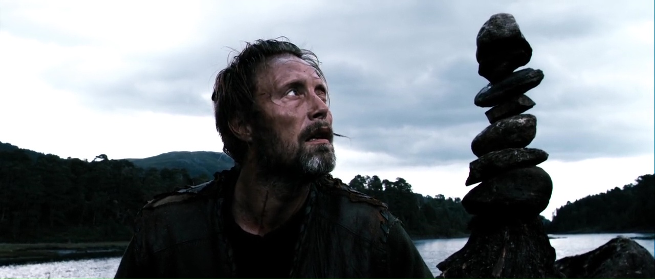 Mais on le sait depuis le temps, et encore plus avec ces deux récentes œuvres que sont Only God Forgives et The Neon Demon, Nicolas Winding Refn est avant tout un réalisateur visuel, qui travaille la symbolique, qui fournit une histoire minimaliste mais qui trouve toute sa richesse de par la signification de ces images, de par son montage, lent mais pas long, et de par son utilisation de la musique pour créer une atmosphère surréaliste et hypnotisante. Le Guerrier Silencieux s’inscrit totalement dans cette veine là, un voyage aux côtés de personnages silencieux, un voyage métaphysique, un voyage qui nous emmène en enfer. Découpé en six chapitres, le film ne nous prend aucunement par la main, mais son début paraît presque basique et normal. Nous sommes au temps des vikings, et l’on découvre One-Eye, un guerrier muet qui n’a qu’un œil comme l’indique son nom, joué par Mads Mikkelsen, habitué du réalisateur (la trilogie Pusher, mais également Bleeder) One-Eye est un prisonnier, et il parvient à s’évader, non sans dommages collatéraux. La violence est frontale, parfois insupportable, et Refn filme l’ensemble sans mentir, sans détourner sa caméra. Un début qui laisse véritablement présager le film barbare que l’on attendait du titre, avant que notre héros ne rencontre d’autres personnages et ne part avec eux en bateau pour sa quête. Une quête initiatique, qui trouvera du sens (ou non suivant les spectateurs) via les images que le réalisateur nous offre. Voir même plusieurs sens. One-Eye est-il voué à aller en enfer et est-ce là son voyage vers ce lieu ? Ou bien est-il une sorte de passeur et emmène-t-il les autres personnages vers leur sombre destin ?