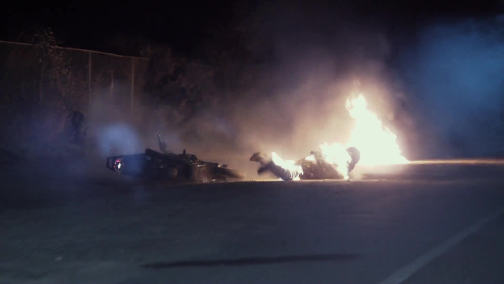 Mais la débilité de ce Hard Ride to Hell ne s’arrête pas là malheureusement, avec un Deus Ex Machina absolument tout pourri débarquant de nul part, car hein, fallait bien qu’elle soit utile la scène d’ouverture. Et bien entendu, comme de par hasard, faire surgir un personnage fort en milieu de film car sinon nos jeunes ils y passent en 3 secondes et c’est un moyen métrage. Ainsi, comme de par hasard, la seule personne que nos jeunes vont croiser sera un brave vendeur de couteau… ancien des forces spéciales qui a lui tout seul va pouvoir mettre tout le monde KO… Non, vraiment, je voulais apprécier ce film, car tout n’est pas à jeter, il part par moment dans des délires gores appréciables, comme lors de la poursuite sur la route, ou bien dans l’église vers la fin, mais dés que quelque chose de bien survient, le moment suivant ramène le film à sa triste condition de série B qui lorgne plutôt vers le Z. Oui, quelques effets gores décomplexés viennent sauver le tout, on a Katharine Isabelle qui comme souvent joue bien mais ne sert vraiment à rien, on a Miguel Ferrer qui aurait la classe si son maquillage tenait la route dans tous les plans, et puis… et puis ben parfois on peut en rire, mais vraiment rien de plus.
