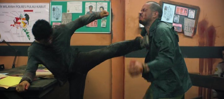 Dans sa seconde heure par contre, Headshot change radicalement, autant dans sa structure que dans son contenu, à partir de la scène (très sympathique) du commissariat. Dès lors, un peu à la manière de The Raid (premier comme second), le film prend des allures de jeux vidéo, dans le sens où Iko Uwais va devoir affronter divers sbires pour pouvoir arriver jusqu’au boss de fin. Une structure donc de film martial beaucoup plus classique, et qui n’hésite pas à aller dans la surenchère, sanglante et visuelle. Les combats se font plus longs, plus denses, le sang coule à flot, les ennemis de plus en plus redoutables, les armes à feu sont délaissées pour les armes blanches ou les poings, et les perdants doivent être rués de coups jusqu’à saigner pour être sûr qu’ils ne se relèvent pas. Et encore une fois, les combats s’en sortent très bien, filmés caméra à l’épaule, n’hésitant pas à se rapprocher de l’action, à ne pas découper l’action toutes les secondes, ou encore à tourner autour des personnages. Le tout au final passe comme une lettre à la poste et il est d’ailleurs agréable de voir que ce coup-ci, le métrage ne dépasse pas les deux heures. Hautement divertissant, sanglant, sans concession, dommage encore une fois que le film n’arrive que rarement à surprendre, autant par son histoire (Jason Bourne) que par son visuel (The Raid 2).
