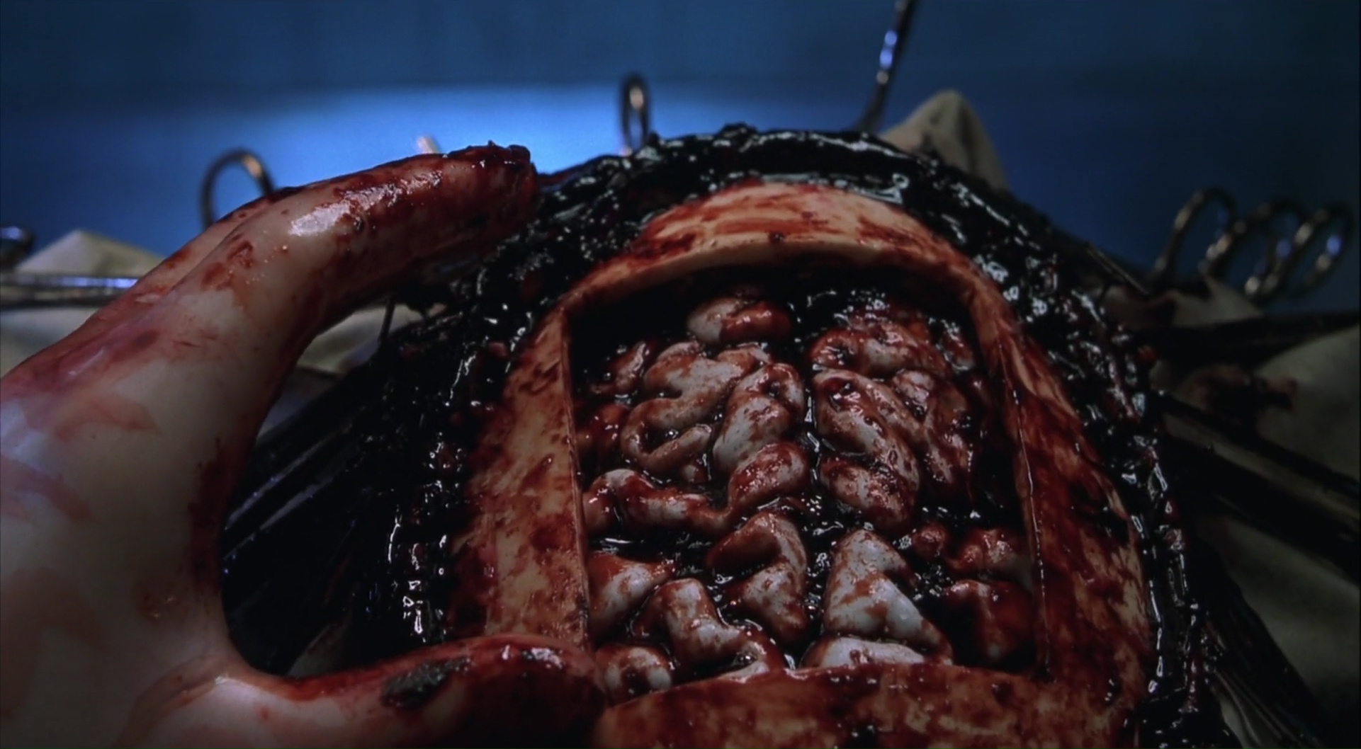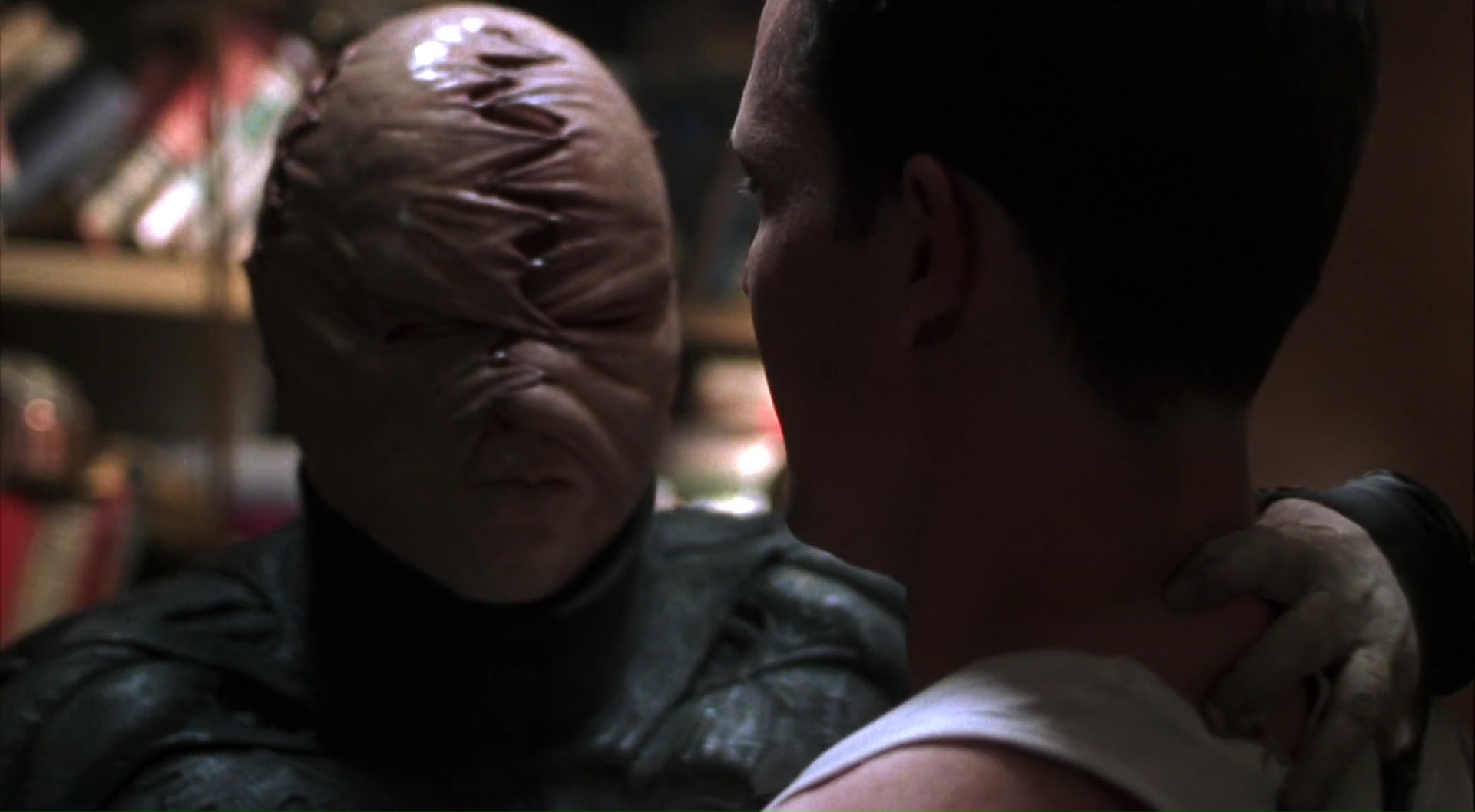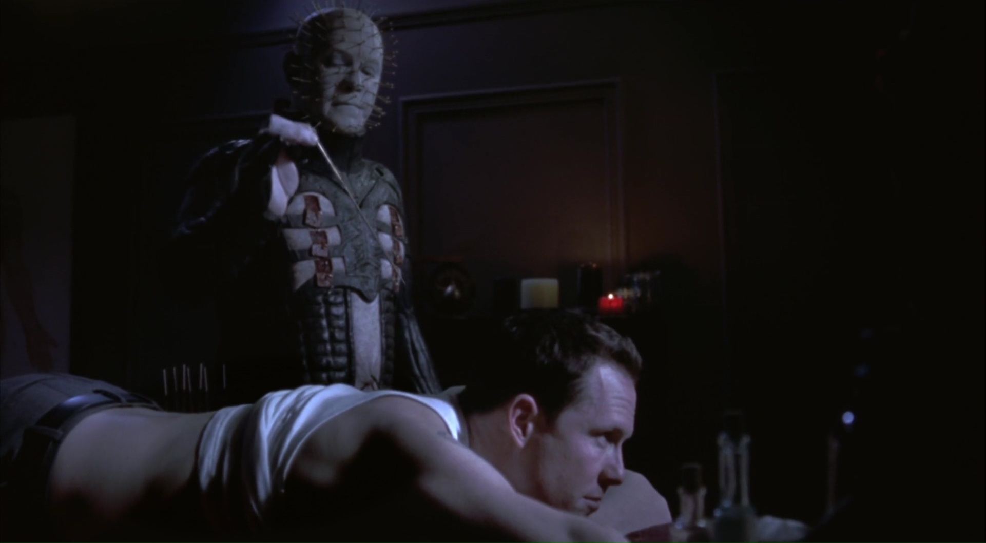 Seulement en réalité, les deux sont très différents, non pas dans le fond mais dans la forme, chacun avec ses défauts et ses qualités. Inferno surprend par des changements radicaux de mise en scène et de photographie, tandis que Hellseeker garde ses choix sur toute la durée pour gagner en cohérence, ce qu’il perd malheureusement un peu en abusant de tics non pas de mise en scène mais de montage. Les inserts rapides et autres jumpscares pour passer d’une hallucination à la réalité. On ne compte pas non plus le nombre de fois que le personnage principal passe à se réveiller. Et Pinhead dans tout ça ? Tout aussi peu présent que dans Inferno, il garde malgré tout une certaine présence. Mais il est dommage de voir que sa rencontre avec Kirsty, sa troisième de la saga, ne soit présent dans le film que dans une version écourtée et alternative, la version originale plus longue et blindée de rapports aux deux premiers films de la saga n’étant présente qu’en bonus sur le dvd (le zone 1 en tout cas, aucune idée pour le dvd Français). Et si Pinhead est tout toujours aussi peu présent, notons que Doug Bradley aura droit à un autre rôle dans le métrage, ramenant à la fois au rôle de l’ingénieur dans encore une fois Inferno, ou tout simplement au rôle du marchand dans le premier film. D’ailleurs, Clive Barker, qui avait détesté Inferno, aurait beaucoup aimé ce Hellseeker. Dans le fond, peu surprenant, vu qu’on y retrouve un pacte, Kirsty, un homme couchant avec tout le monde, des visions d’horreur. Mais finalement, Hellseeker est aussi imparfait et bancal que les précédents métrages de la saga. À mes yeux, il garde un grand capital sympathie, mais beaucoup trop de défauts encore. Seulement vu ce qui va suivre, ce n’est pas si mal en fait.