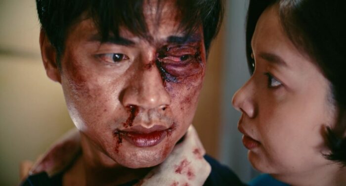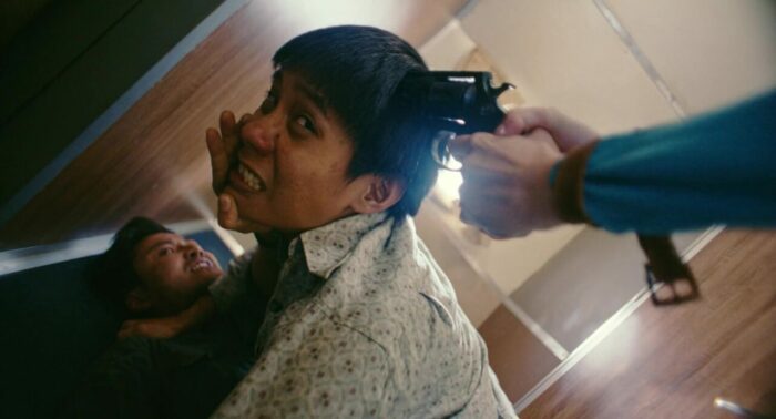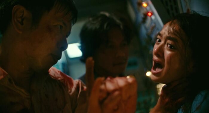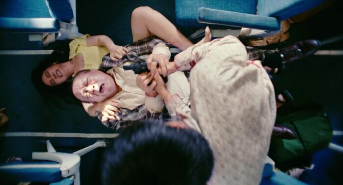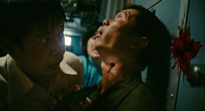 Passé cette ouverture, nous voilà enfin dans le cœur du récit, un an plus tard, à bord d’un vol où les hôtesses de l’air (dont la charmante Kaity Nguyễn, qui après des débuts mitigés au cinéma, m’aura totalement bluffé ici), quelques agents de sécurité, les deux pilotes ainsi qu’un brave agent voulant juste rejoindre Saigon pour être présent à temps pour l’accouchement de sa femme vont devoir lutter pour leur survie lorsque le vol est détourné par une bande menée par Thái Hòa (Blood Moon Party, My Mr Wife). Et dès le décollage en réalité, tout commence, tout se met en place, et le film parvient l’exploit de ne jamais faire retomber le rythme et d’enchainer donc les péripéties et les scènes d’action pendant la quasi intégralité de sa durée de deux heures. Les pauses sont rares, puisque d’un côté comme de l’autre, tout n’est pas ce qu’il paraît, des traitres font leur apparition, de nouvelles armes pointent le bout de leur nez, des accidents amènent des complications lors du vol, bref, c’est un festival pendant près de deux heures, et ça ne s’arrête jamais. Et surtout, là où ce genre de divertissement, surtout au Vietnam en réalité, reste assez clean, voire léger, comme par exemple cette même année 2025 avec Chase for Amber, et bien là, malgré l’ambition du film et donc sans doute son budget plus haut que la norme du genre, Hijacked se fait parfois bien violent. Ca se combat dans des couloirs étroits, les balles partent, les personnages saignent, certains sont même torturés à coups de couteau ou de doigts brisés, et malgré tout ça, les personnages se relèvent toujours, pour toujours en reprendre un peu plus dans la gueule, même les hôtesses de l’air. Alors évidemment, du coup, même si on pourrait dire que sur un seul vol, cela fait beaucoup de situations différentes, beaucoup de rebondissements, que certains personnages sont parfois assommés, désarmés, mais reviennent malgré tout avec de nouvelles armes, ça fait un peu beaucoup et ça retire un peu de crédibilité, mais, car il y a un mais, c’est toujours au service de l’efficacité du récit.