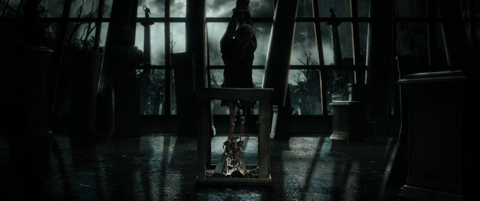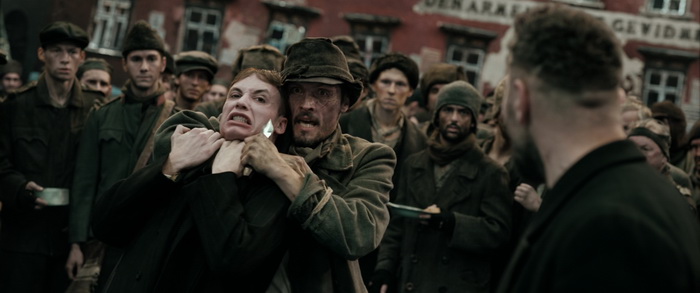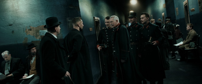 Tourné quasi exclusivement en fond vert (ou bleu), avec des décors en CGI rajoutés en post-prod, Hinterland propose une expérience visuelle assez unique en s’inspirant de l’expressionnisme allemand des années 20. Dans les décors, les bâtiments sont tordus, déformés, la colorimétrie est parfois étrange, les éclairages et les ombres ne sont pas forcément là où ils devraient être. Rien n’est droit, les perspectives ne respectent aucune norme et l’exercice demande clairement quelques minutes d’adaptation en fonction de la difficulté de votre cerveau à accepter le procédé. Il en résulte une ambiance des plus étranges, parfois gothique, parfois baroque, souvent oppressante. Lorsque ce ne sont pas les bâtiments qui sont tordus, c’est le cadrage, avec un réalisateur qui s’amuse à casser ses plans, rendant les perspectives encore plus improbables. Est-ce pour faire ressentir au spectateur la sensation étrange qu’ont les soldats du film de retour de la première guerre mondiale, honteux d’avoir perdu, déstabilisés que ça soit fini et d’être encore en vie, avec une vie déformée à tout jamais par les horreurs qu’ils ont vues / vécues ? Car ici, les soldats revenant de captivité ne sont pas célébrés comme des héros, mais plutôt traités comme des mendiants jetés dans le caniveau. La métaphore est comprise au bout de quelques scènes, mais l’atmosphère étrange et assez inconfortable créée par ces images numériques qui font perdre tout repère est bien plus importante. Il faut avouer que certains plans sont de toute beauté et pourraient être sans souci des tableaux de maitre. Mais à l’inverse, on a également souvent l’impression d’être devant un jeu en FMV (Full Motion Video) des années 90 façon Phantasmagoria ou Gabriel Knight 2 lorsque les acteurs ne sont pas très bien incrustés dans les décors et que l’ensemble sonne un peu faux. Clairement, le résultat n’est pas toujours convaincant avec des acteurs qui semblent parfois un peu flotter dans le décor. Mais qu’importe, l’expérience est assez unique pour que ce défaut ne vienne pas réellement entacher l’expérience Hinterland.