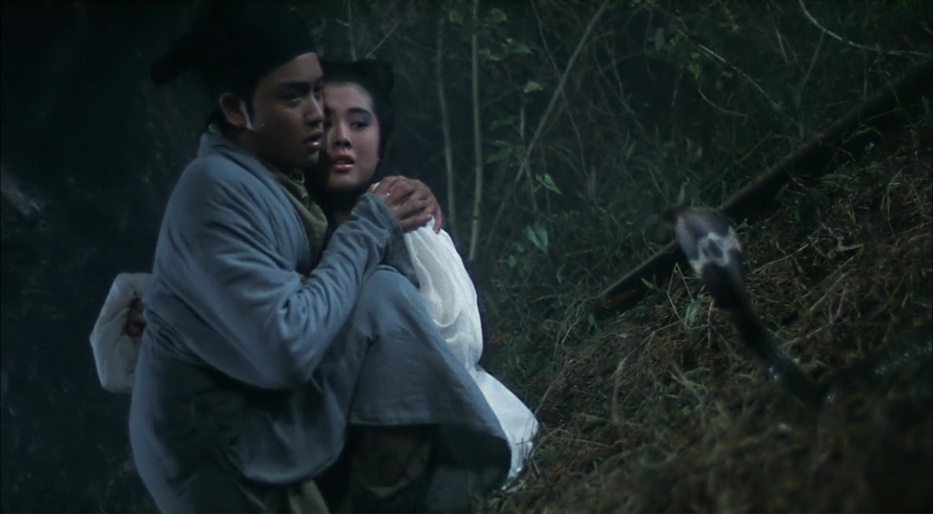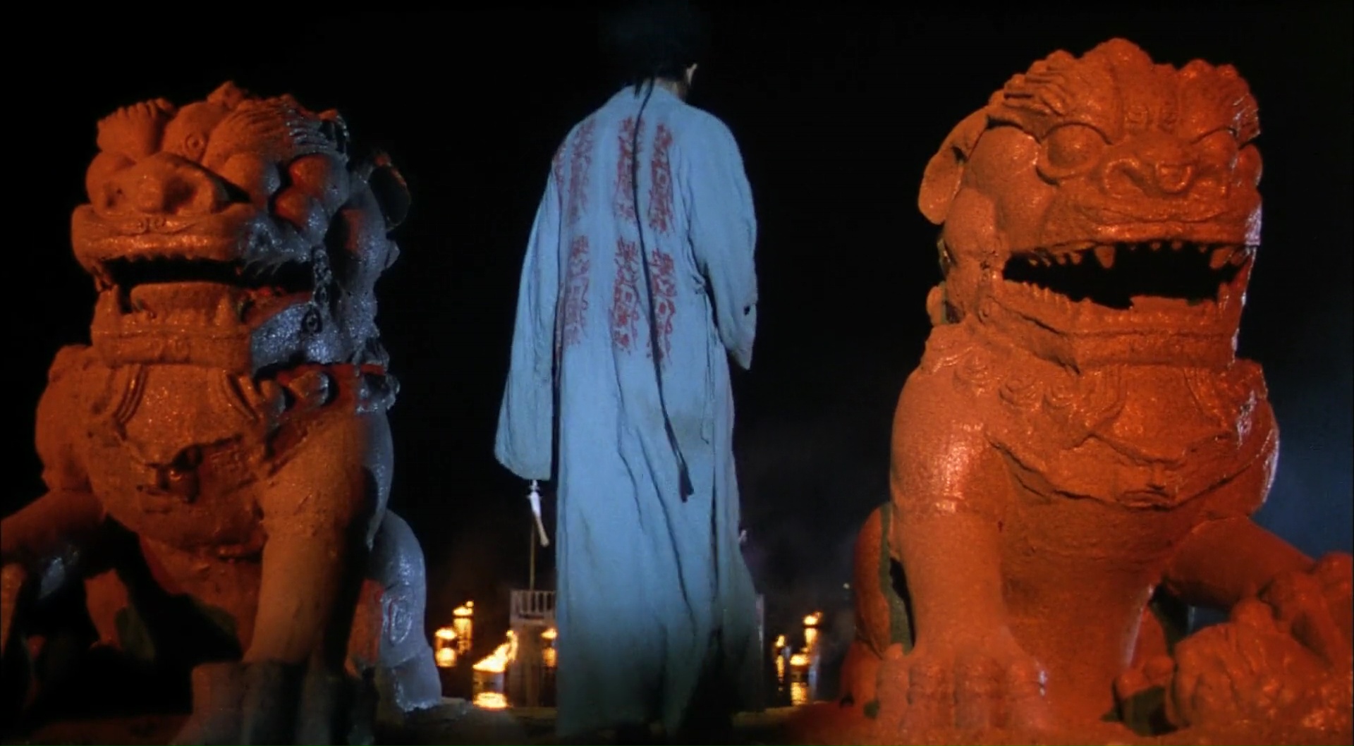 Un côté fataliste est présent en permanence sur le film, et pourtant, les quelques moments romantiques (bien que parfois malgré tout tendus) fonctionnent à merveille, comme lors de cette scène devenue culte où Leslie Cheung se cache dans un bain, et qu’à bout de souffle, Joey Wong l’embrasse. C’est sans doute la scène qui, dans son ensemble, résume le mieux le métrage d’ailleurs, mélangeant fantastique et romance, et de l’humour plutôt léger via la timidité du personnage. Visuellement, si on reconnaît le style typique des productions HK des années 80, c’est soigné à tous les niveaux, avec ces décors tour à tour classiques (la ville, la demeure des fantômes) ou effrayants (les demeures en ruine, la brume constamment présente la nuit), et une mise en scène soignée, dynamique et sans vrai faux pas. On reconnaît bien évidemment le style de Hong Kong dans sa volonté d’être généreux, avec son mélange de genre, mais aussi son déferlement d’effets spéciaux en tout genre, avec des zombies momifiées, des monstres géants, quelques décapitations lors de combats secs et rapides. Parfois d’ailleurs un peu trop, mais le réalisateur semble malgré tout avoir réussi à poser un minimum sa patte sur le film, tandis que le second volet aura beaucoup plus la patte de Tsui Hark dans son côté foutraque partant dans absolument tous les sens, et multipliant facile par deux ou trois les situations et donc effets spéciaux. Ici, ça reste la plupart du temps sobre, car le métrage n’oublie pas qu’il doit avant tout nous raconter cet amour impossible, et cette poésie qui s’en dégage, elle fonctionne encore aujourd’hui. Culte, c’est tout.