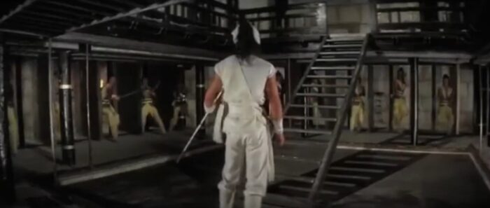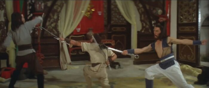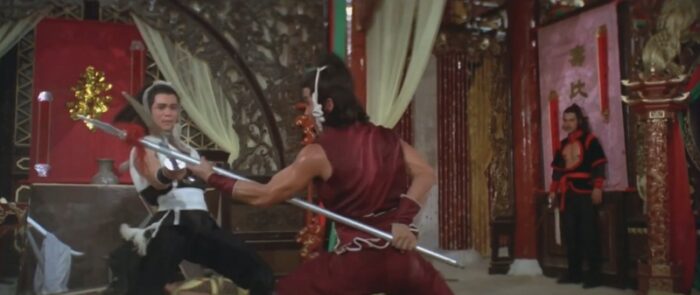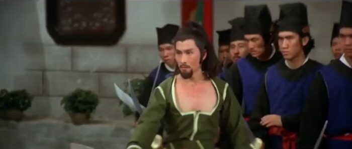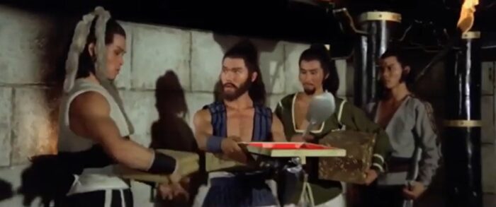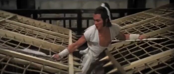 Avec sa maison truffée de pièges, House Of Traps retrouve l’esprit BD de The Five Venoms et ses artistes martiaux plus proches des super héros que des chevaliers classiques. Tout y est incroyable et fantaisiste : gadgets (les pièges), accoutrements (vêtements avec poitrine – musclée – apparente, couvre-chefs grotesques – ceux de Lu Feng et Philip Kwok sont ahurissants !), décors, rebondissements… L’exploitation est même de la partie avec ce pauvre poulet jeté vivant sur des pics acérés (attention aux amis des bêtes !), avant qu’un homme ne prenne sa place. Au passage, curieuse façon d’enregistrer la déclaration d’un témoin.