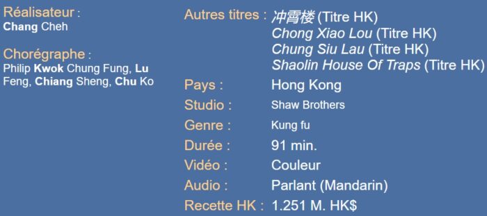 House Of Traps est l’avant-dernier film que Chang Cheh réalisa pour la Shaw Brothers qu’il devait quitter l’année suivante, en 1983. C’est une bonne surprise dans une filmographie qui s’étiole au fil des ans et qui touchera le fond, pour la période Shaw, avec un film ahurissant de médiocrité, The Weird Man. Mais House Of Traps est également le dernier film de la troupe des Venoms, déjà incomplète puisqu’il y manque Lo Meng démissionnaire depuis un an.