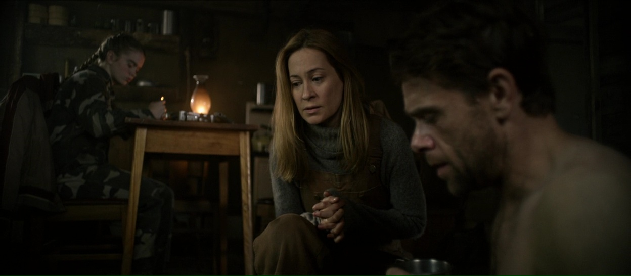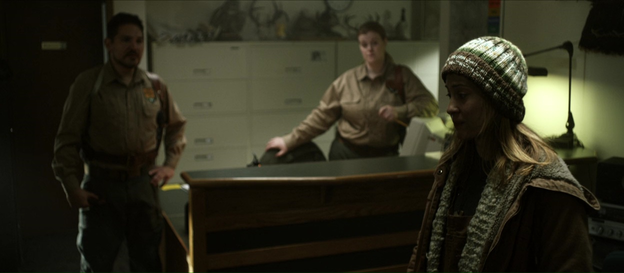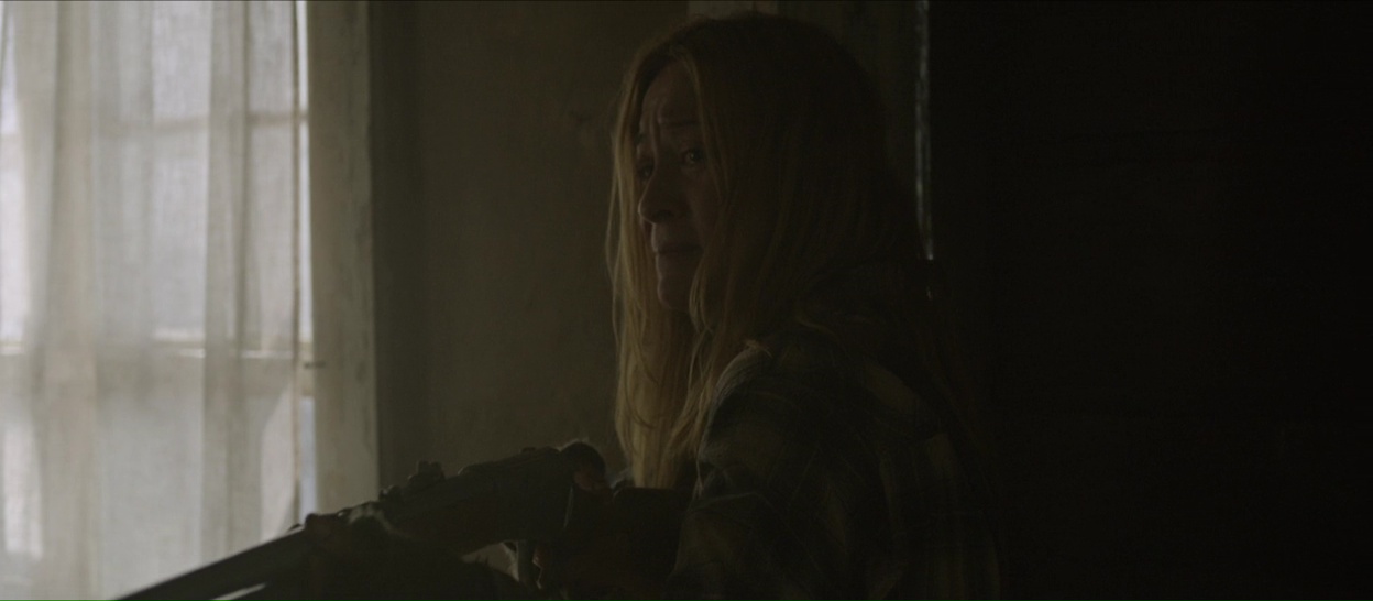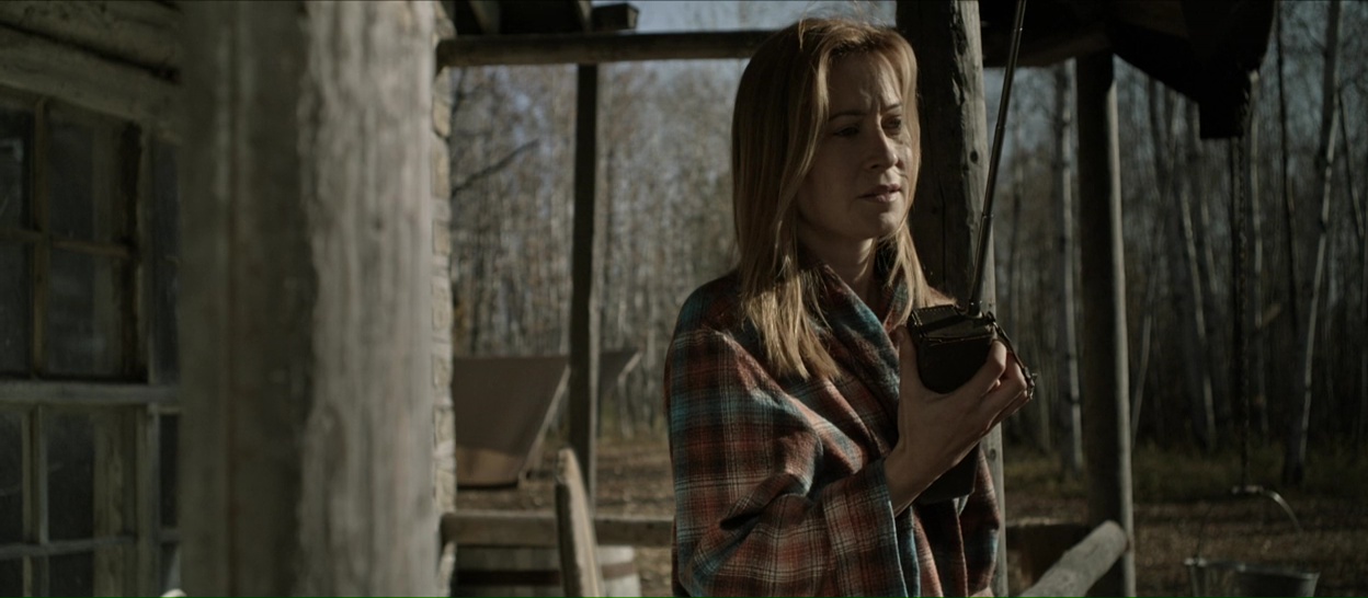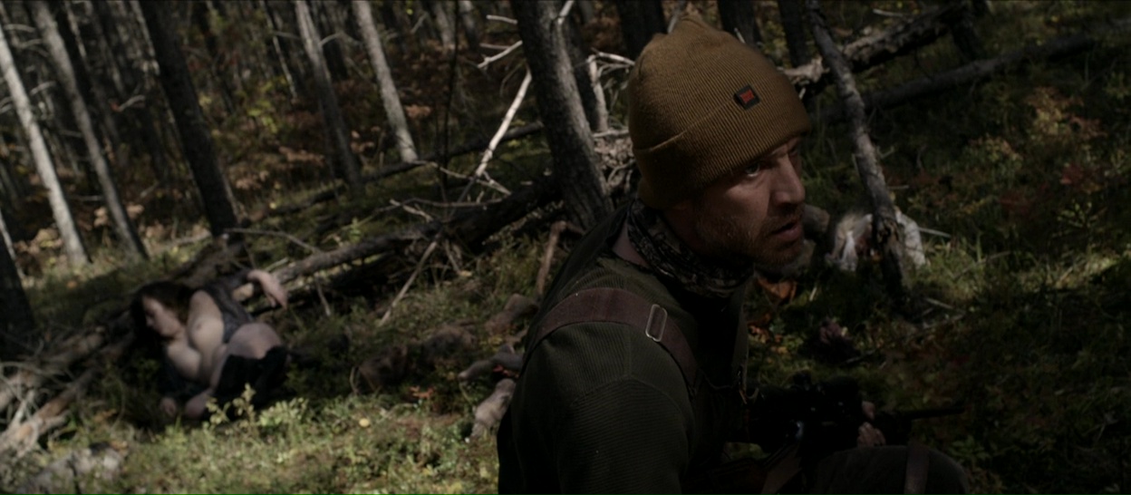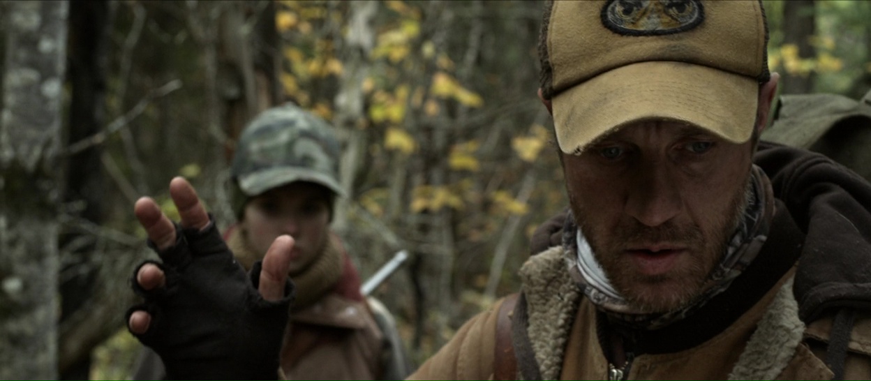 Hunter Hunter prend en effet son temps, pour poser une ambiance, pour faire progresser le film doucement en nous faisant douter, en nous suggérant la présence d’un danger, sans jamais nous révéler l’intégralité de ses cartes, et ça fonctionne plutôt bien, c’est très bien filmé et le film bénéficie en plus d’un casting très réussi, avec des têtes connues. Ou du moins, d’anciennes têtes connues. Camille Sullivan, habituée aux séries TV et au téléfilm, trouve là un rôle qui lui permet de montrer son talent au grand jour, et bingo, elle est superbe dans le rôle de cette femme qui se retrouve très rapidement livrée à elle-même lorsque son mari ne revient pas de sa traque, et qu’elle va devoir se démerder, seule, car elle est isolée de tout, et que les rares locaux ne sont pas trop enclins à venir l’aider. Mais c’est le casting masculin qui interpelle, bien qu’il impressionne moins. Dans le rôle du mari, Devon Sawa, que les trentenaires connaissent surtout pour quelques films à la fin des années 90, comme La Main qui Tue ou le premier Destination Finale. Et dans le rôle d’un inconnu débarquant dans le film, Nick Stahl, dont l’on se souvient pour Terminator 3 ou encore Sin City. Deux acteurs sympathiques un peu disparus de la circulation depuis, et qui ont l’air content d’être là dans un film fait avec le plus grand sérieux du monde. Et ça fonctionne, le casting est appliqué, l’ambiance prend, le design sonore du métrage fait des merveilles.