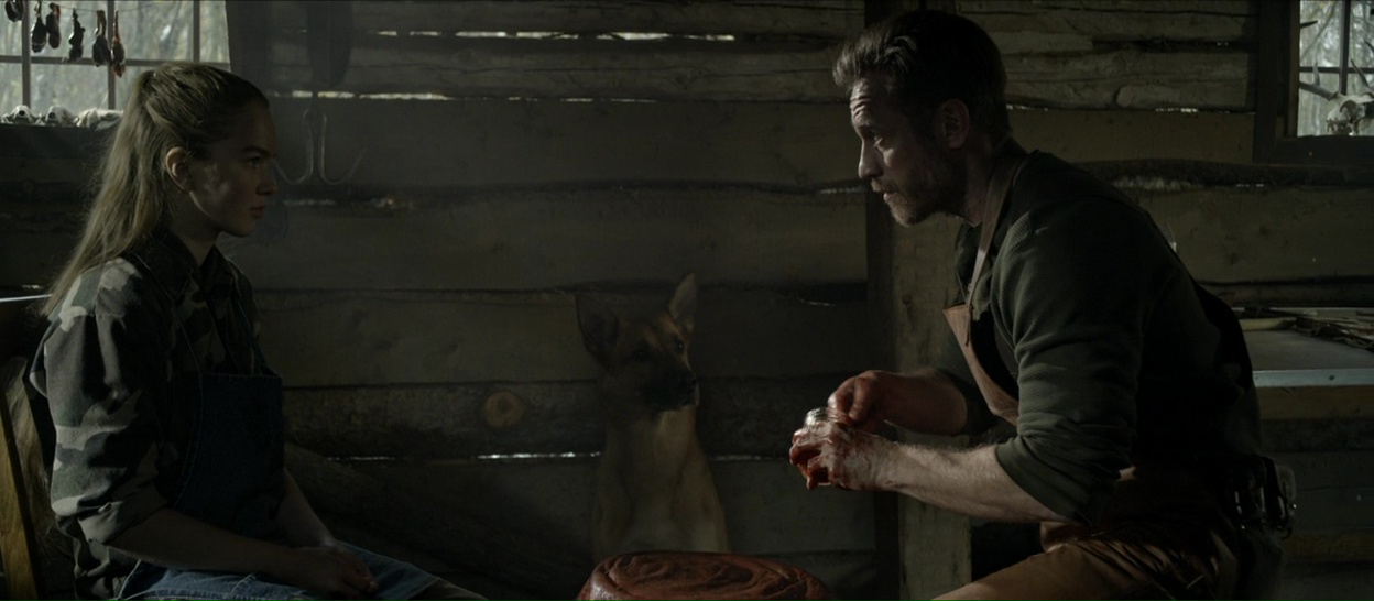 Hunter Hunter, c’est l’un de ces films qui a débarqué en Décembre 2020 directement en VOD, et qui gagne à être regardé sans rien savoir du titre en question. Ce fut mon cas, ne connaissant que l’affiche, très belle en passant, et rappelant le également récent The Wolf of Snow Hollow, le noir remplaçant le rouge de la dite affiche. En tout cas, les loups ont droit à un traitement enfin sérieux en 2020, sans forcément avoir à passer par la case loup-garou, et sans avoir non plus à verser dans la série B torchée à l’arrache qui finalement ne satisfera personne. Hunter Hunter, c’est avant tout l’histoire d’une famille, et de son mode de vie assez particulier. Mersault vit avec sa famille au milieu de nul part, isolé du monde extérieur, prônant l’indépendance totale et donc réglant chacun de ses soucis par lui-même. Une cabane dans les bois, une fille qui ne va pas dans les écoles mais reste à la maison et suit ses parents, et un père chasseur qui amène de l’argent en revendant le résultat de ses trappages. Tout bascule lorsqu’un loup rôde dans les environs et commence à bouffer tout simplement les animaux qui permettent à cette famille de subvenir à leurs maigres besoins. Du coup, moins de nourriture, mais surtout, moins de vente, et donc moins de rentrée d’argent. Ce qui surprend dés le départ, c’est le sérieux du réalisateur, et sa volonté de proposer un film que l’on qualifiera de lent et d’ambiancé. La plupart du temps en tout cas.