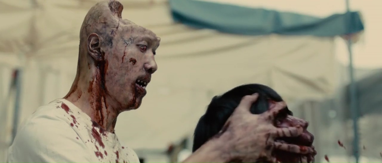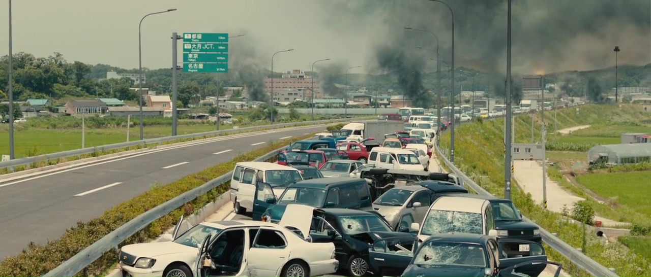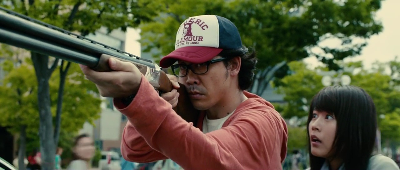Hideo est l’assistant d’un mangaka, enfin, un de ses assistants, le timide qui reste dans son coin, ne dit pas ce qu’il pense, vit chez sa petite amie qui le plaque et le vire de chez elle après 5 petites minutes. Sa vie est un désastre, et comme toujours dans ce genre de film, il faut attendre que la situation devienne critique autant pour le monde que pour lui pour qu’Hideo se réveille et ne prenne son destin en main. Le métrage est donc clairement découpé en deux parties, la première servant d’exposition, des personnages, de la situation générale, nous familiarise avec ses infectés originaux (le virus n’a pas le même effet sur tous), la seconde resserrant le lieu de son action et allant beaucoup plus dans l’horreur, où le sang coule à flot. Et finalement, tout commence divinement bien, sur un ton plutôt léger, puisque notre héros découvre en guise de premier infecté sa petite amie, qui a définitivement les crocs, devient contorsionniste, va perdre ses dents. En quelques minutes, le film capte notre attention pour ne pas la relâcher, puisque Hideo va alors devoir fuir Tokyo, et le réalisateur se fait plaisir. Sa mise en scène semble millimétrée et l’apocalypse fait plaisir. Le chaos est dans les rues, Hideo court, les infectés sont partout, les accidents de voitures s’enchaînent, les passants meurent. Lorsqu’il prend une voiture pour fuir avec d’autres survivants, il n’est pas au bout de ses peines. La seconde partie donc, qui semble être un hommage certain à Romero, voit les personnages recueillis par des survivants dans un centre commercial extérieur, tenter de survivre en communauté, et fatalement, ça ne marche pas.