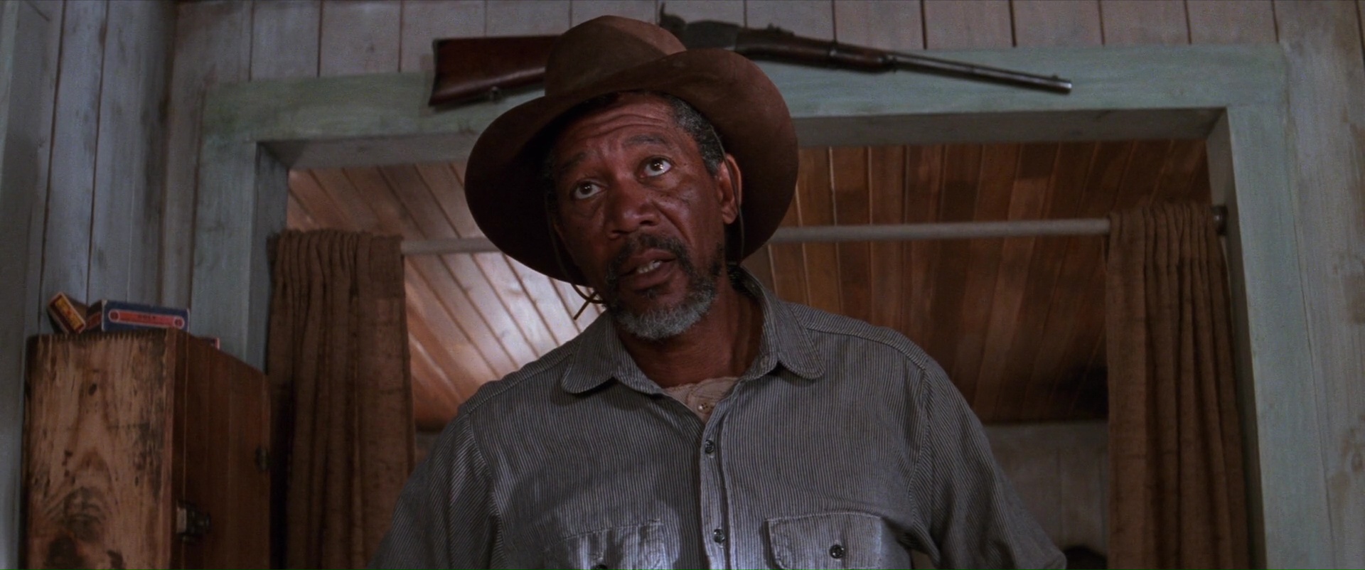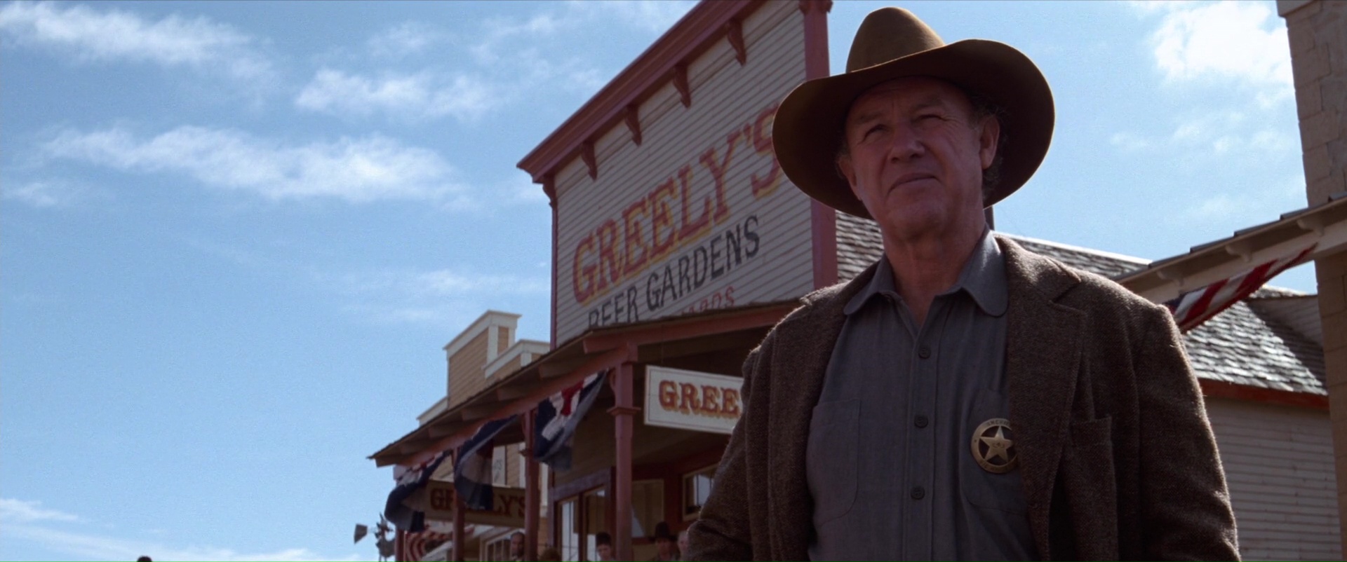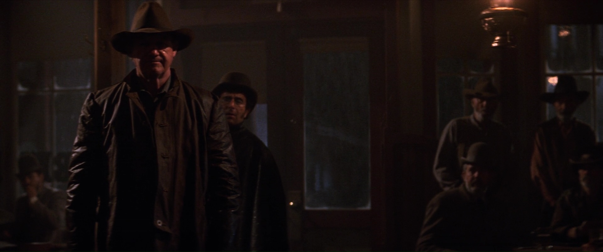 Dans le fond, on retrouve énormément d’éléments chers au cinéma de Clint Eastwood. Rien d’étonnant à ce que finalement le projet ai passionné l’acteur/réalisateur. Rien que dans la description du personnage de Munny, tout est dit. Un ancien tueur, repenti, veuf, vivant au calme comme éleveur de cochons avec ses deux enfants. Son passé est toujours présent pour le hanter, tout le monde semble connaître ses faits d’arme, ce qui en fait un personnage aucunement bon, malgré un sens moral bel et bien présent. Un personnage forcément violent de par son passé, mais également lorsque la situation l’exige, ou que son sens moral le force à l’être. À ses côtés, Logan donc, Morgan Freeman, éternel compagnon, qui semble plus calme, plus posé, plus prudent, mais également beaucoup plus rangé, et ayant totalement fait la paix avec son passé. Et face à eux, même s’il n’est aucunement la cible de ses deux anciens tueurs, Little Bill, le shérif, joué par le génial Gene Hackman qui vole limite la vedette dés qu’il est à l’écran, qui montre son autorité par ses actes, ayant souvent recours à la violence, frontale, sadique également. Via ses trois différents personnages, représentant chacun un aspect des mêmes thèmes, on peut tout simplement dire que Impitoyable, dans la carrière d’Eastwood, mais également au sein du genre qu’il aborde, le western donc, est une œuvre somme, qui résume parfaitement ses règles, ses tics, ses thèmes. La vengeance, le pardon, la rédemption, la justice, le rapport à la violence à une époque où la frontière entre criminels et forces de l’ordre sont minces, la vieillesse également forcément. D’ailleurs, il est dommage à ce niveau de voir la traduction française du titre en changer quelque peu le sens. Impitoyable est certes plus vendeur, et pourrait correspondre autant au personnage de Munny qu’à celui de Little Bill. Mais Unforgiven, qui ne peut pas être pardonné donc en le traduisant, Impardonnable, correspond plus aux thèmes du film. Les prostituées, malgré tout ce que les autres tentent de faire, n’arrivent pas à pardonner, et la bande de Munny va les aider, finalement, comme pour se faire pardonner également, et en comprenant parfaitement leur ressenti.