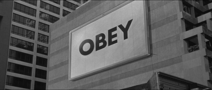 John Nada s’inscrit clairement comme un héros venu tout droit de l’esprit de Carpenter, succédant à Snake Plissken, ton cynique et punchlines à l’appui. Et c’est le catcheur Roddy Piper qui récupère le rôle, ce qui explique clairement cette longue baston assez jouissive, bien qu’il faut l’avouer, plutôt inutile au récit. À noter d’ailleurs que Carpenter avait au départ écrit le rôle pour Kurt Russell, son acteur fétiche. Et si Roddy Piper est finalement parfait, ce qui frappe dans Invasion Los Angeles, c’est clairement son univers. En réalité, jamais Carpenter n’aura été aussi engagé dans ce qu’il nous raconte, à une telle échelle. Si dans The Thing, évidemment, la menace pourrait mettre l’humanité en danger, le métrage se contentait de resserrer son intrigue au sein d’un petit groupe d’humains. Dans Invasion Los Angeles, on parle bien d’aliens qui sont parmi nous, à l’échelle mondiale, et qui contrôlent notre monde, remplaçant les dirigeants, les riches, contrôlant les médias, allant jusqu’à, en quelque sorte, remplacer notre réalité, plaçant sous nos yeux un monde « idéal » et commercial, l’Amérique des années 80, avec cette mise en avant du rêve Américain, la famille, la voiture de luxe, les vacances aux Caraïbes, le fait de dépenser sans compter car l’économie va bien. Alors qu’en réalité, le monde, visible par notre héros via des lunettes noires, est bien différent. Terne, en noir et blanc, où chaque affiche, chaque pub, chaque magazine n’est en réalité qu’une page blanche contenant un message unique. Obéir, consommez, faites des enfants, marriez-vous, achetez une nouvelle voiture. Carpenter se moque clairement de ce qu’il se passe à l’époque en Amérique, et ironiquement, fait l’opposé du cinéma populaire des années 80, où les grands studios font gagner la guerre du Vietnam à Stallone ou Norris.