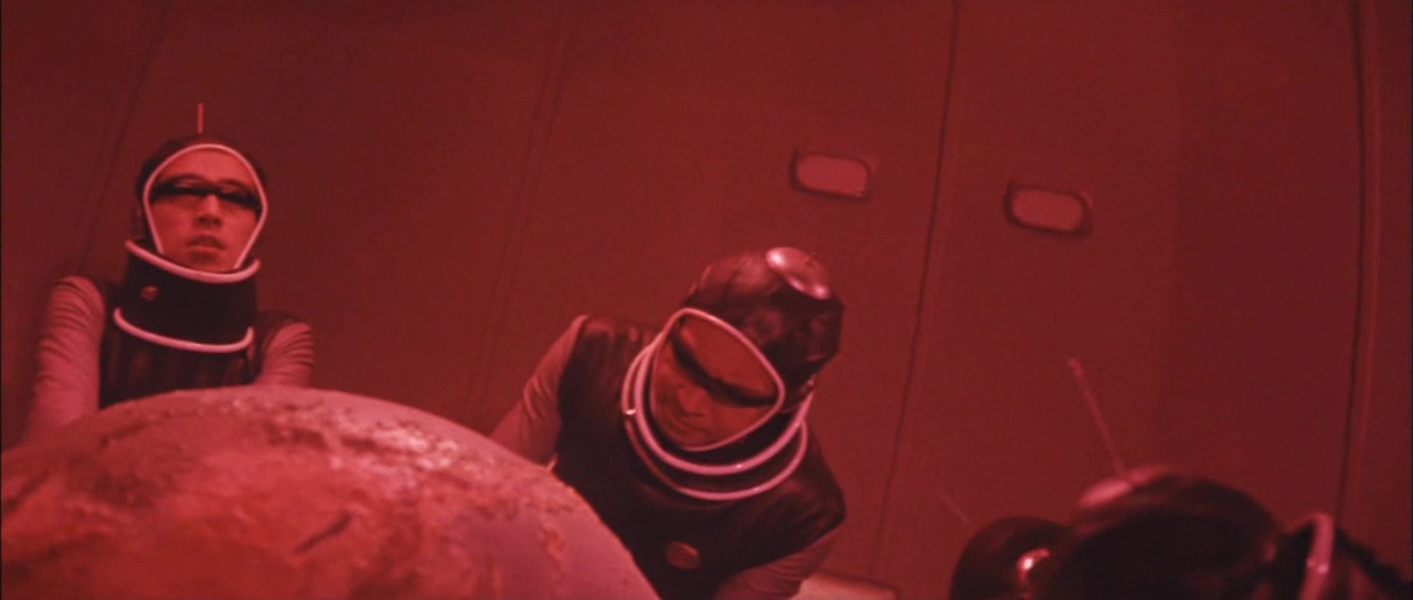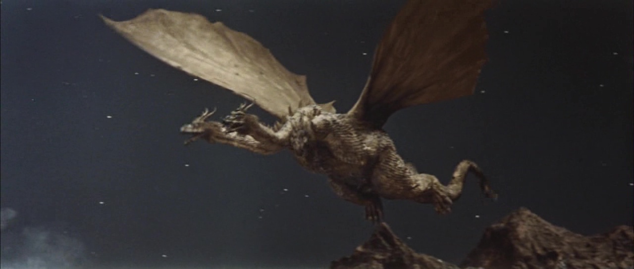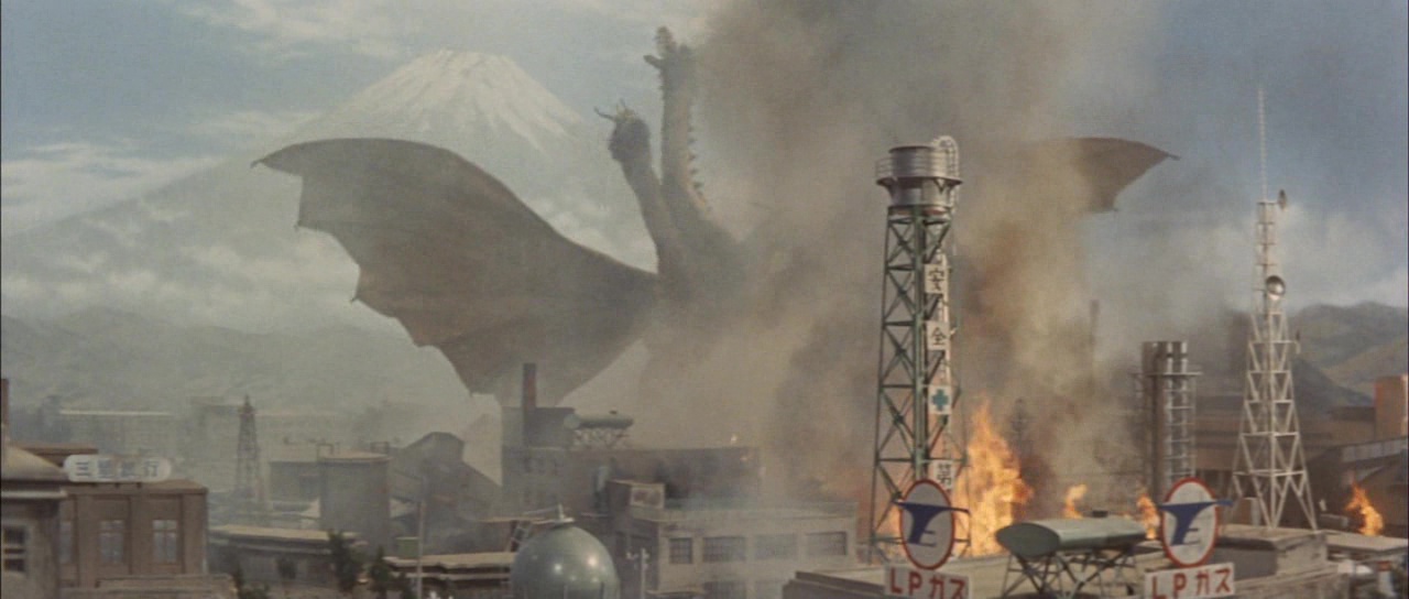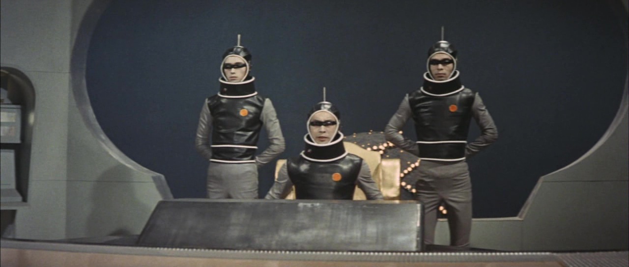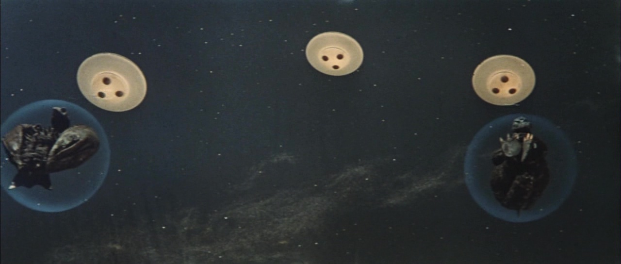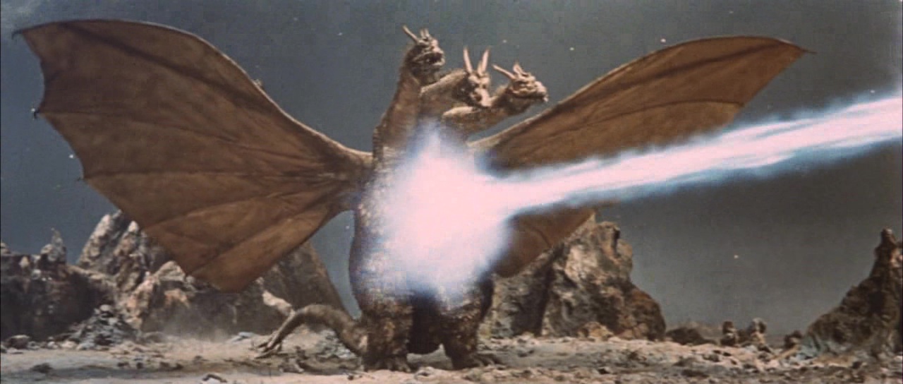Il est d’ailleurs amusant de constater que des années plus tard, pour l’épisode anniversaire des 50 ans de Godzilla, Kitamura reprendra basiquement la même histoire pour son film. En encore moins bien. Pour Invasion Planète X, nous pourrons dire que la première partie fonctionne bien, à condition de ne pas être totalement allergique à l’aspect kitch qui s’en dégage. Un aspect très présent mais qui peut donner un côté plutôt attachant à l’œuvre. On alterne donc des maquettes plutôt réussies avec des plans qui nous montrent des décors en carton un peu ridicules et des costumes… totalement ridicules. Quand on pense que trois ans plus tard, Kubrick réalisait 2001 L’odyssée de l’espace… il y a un fossé, mais il serait vain de comparer les deux œuvres, qui n’ont rien à voir de toute manière. Mais je vous dirais que la première partie fonctionnait bien, et étonnement, les Kaiju sont totalement absents de cette partie là. Si Honda Ishirô nous offre un deux en un, les deux parties ne se mélangent pas vraiment entre elles, la partie Kaiju Eiga étant même plutôt inutile à l’intrigue en elle-même, tandis que lorsque les combats débarquent, ils ne font que nous rappeler le film précédent de la saga, en moins bon puisque Godzilla devient véritablement gentil à présent, et se retrouve plus à prendre des poses ridicules qu’à détruire son environnement. La destruction, on la devra plutôt à King Ghidorah, qui lui en impose encore, et surtout s’impose comme un des méchants Kaiju de la Toho, voir LE méchant.