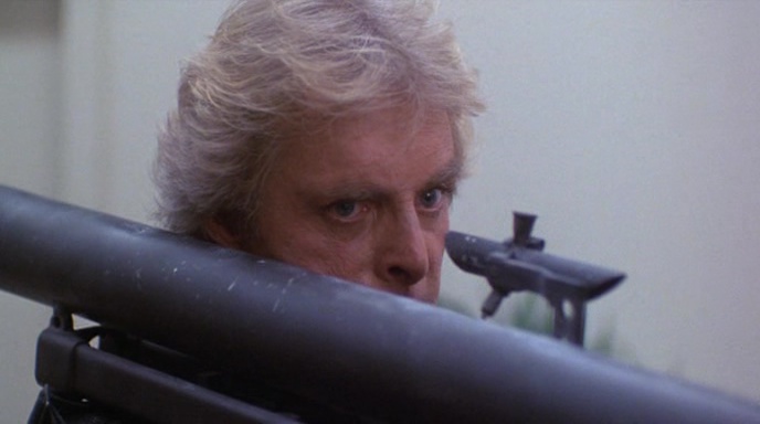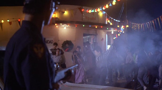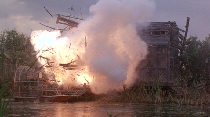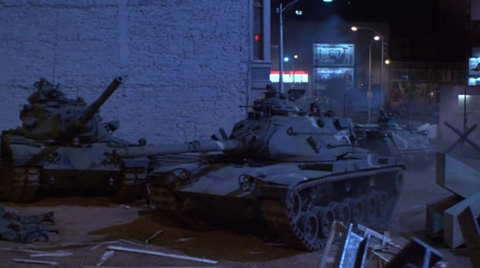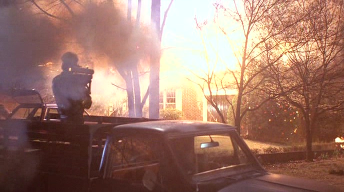 La preuve, dés qu’on le rencontre, il fait un deal avec une autre belle gueule du cinéma B, à savoir Billy Drago (Pale Rider, Les Incorruptibles, Delta Force 2, Tremors 4, le remake de La Colline a des Yeux, toujours à jouer le méchant), il ne plaisante pas, tirant la gueule, le regard halluciné, n’hésitant pas à tabasser une femme, puis à exploser l’entre jambe de Billy Drago au flingue, avant de balancer la femme par la fenêtre. Oui, et ça, ce n’est que le début du film, c’est vous dire à quel point Invasion U.S.A décide d’aller loin, très loin. Les méchants doivent être encore plus méchants que d’habitude, et virer à la caricature totale, comme lors de ce débarquement Russe sur les côtes de Miami, qui semble tout droit sortir du débarquement de la Normandie, et avec des figurants qui ne parlent même pas Russe mais Allemand (un détail pour la Cannon), ou de l’explosion d’un quartier résidentielle au bazooka qui n’a même pas besoin d’être rechargé pour tirer 5 ou 6 fois de suite. Mais rassurez-vous, si les traits sont grossis à l’extrême du côté des gros méchants Russes, c’est le cas aussi pour notre héros, retraité vivant dans sa petite maison avec son Tatou (l’animal hein), et qui après l’explosion de sa maison de manière radicale par les méchants (qui en toute logique ne vérifient pas si Chuck est vraiment mort), part en chasse. Et là, festival, Chuck n’aura pas à chercher bien loin, puisque le film a alors une structure totalement je m’en foutiste de l’extrême. À savoir que l’on suit généralement les coups des méchants pour plonger l’Amérique dans le chaos, et que à chaque fois, Chuck passe miraculeusement dans le coin avec son 4X4 pour rétablir la paix à l’Amérique : avec deux uzis dans la face qu’il tient comme des colts. Expéditif. Des terroristes qui veulent faire exploser une bombe dans une église ? Mince, ça n’explose pas, et voilà que Chuck apparaît derrière eux, leur lance leur propre bombe et la fait exploser. Des méchants déguisés en militaires qui veulent faire un carnage dans la rue, mais Chuck débarque et les déglingue tous en quelques secondes.