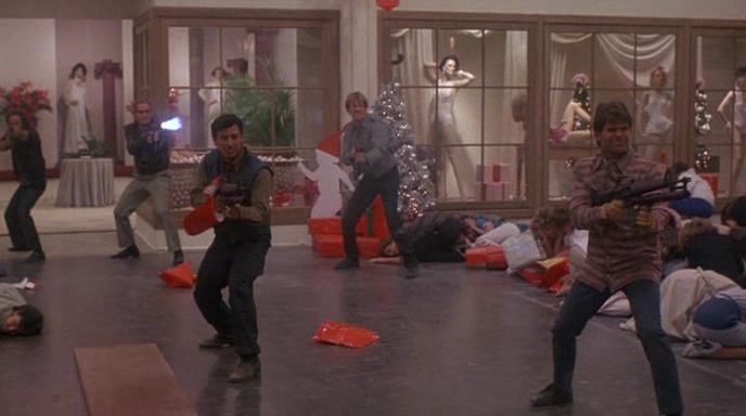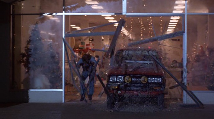 Des terroristes voulant faire un carton dans un centre commercial en pleine période de fête de fin d’année ? Pas de souci, Chuck sortira d’on ne sait pas trop où, avec son fidèle véhicule, pour défoncer l’entrée du centre commercial et rétablir l’ordre. Il y a quelque chose de clairement primaire dans Invasion U.S.A., un film de sale gosse en fait, qui ne s’ennuie pas des détails, de la cohérence, du message ou de quoi que ce soit, et fonce dans le mauvais goût total, à tel point que ça en devient parfois du génie. Bien entendu, les amateurs de nanar vous citeront la VF et son fameux « tu vas repartir avec la bite dans un Tupperware », mais même en VO, ça ne vole pas forcément plus haut, même si ça se lâche moins. En fait, le spectacle proposé est tellement primaire que le film est devenu culte pour beaucoup, et qu’il est resté pour la MGM, qui distribue le film, leur second plus gros succès de tous les temps pendant quasi 20 ans. Si ça ne prouve pas le génie de la démarche, je ne sais pas ce qu’il vous faut de plus ! Mais plus sérieusement, quelque chose parvient néanmoins à surprendre dans ce festival du n’importe quoi, et c’est le final. Le film ne respecte pas franchement la narration classique des habituels films du studio, ou des films de Norris d’ailleurs. Là où d’habitude, la montée en puissance se fait doucement, Invasion U.S.A. préfère être un spectacle non stop de tous les instants, avant de livrer un final étrange, où d’un côté, des militaires affrontent dans le festival habituel d’explosions les terroristes, et de l’autre, Chuck, seul, affrontant son nemesis, le tout sans musique, essayant vainement de jouer sur la tension. De quoi décevoir, si le coup final n’était pas porté au bazooka, ouf ! Invasion U.S.A., c’est donc mauvais, mais mauvais dans le sens où dans de bonnes conditions, ou avec des potes sans doute, c’est un spectacle régressif jouissif. Qui se retrouve avec un 6,5/10 oui, vous n’êtes pas aveugles !